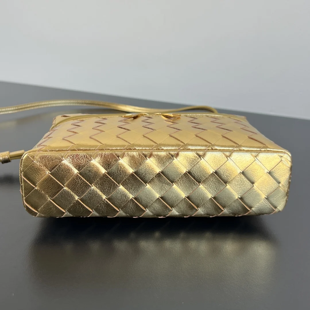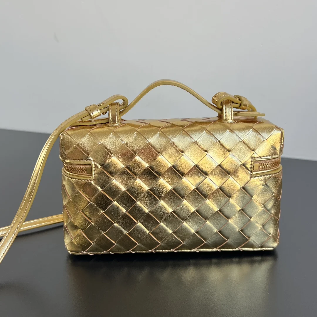 BV s new Vanity Case with strap, 789109 The metallic sheen is eye-catching, perfectly capturing the festive atmosphere Crafted with the brand s most iconic woven calfskin, featuring a two-way zip closure. The overall style is retro and elegant. It has a top handle and an adjustable shoulder strap. Carry it by hand for an elegant touch, or wear it crossbody for a casual and relaxed vibe, unlocking various styling scenarios Dimensions: 22x12.5x5