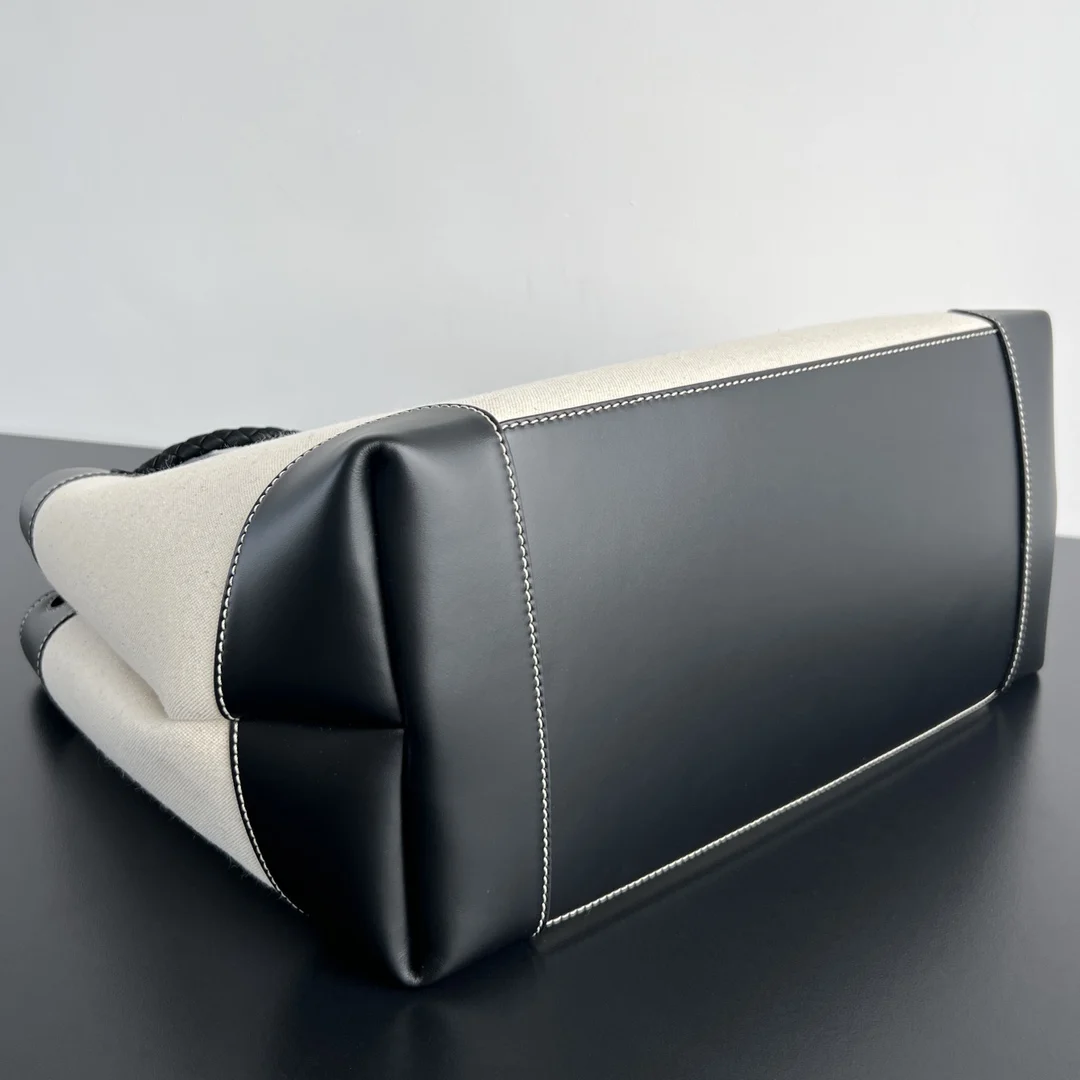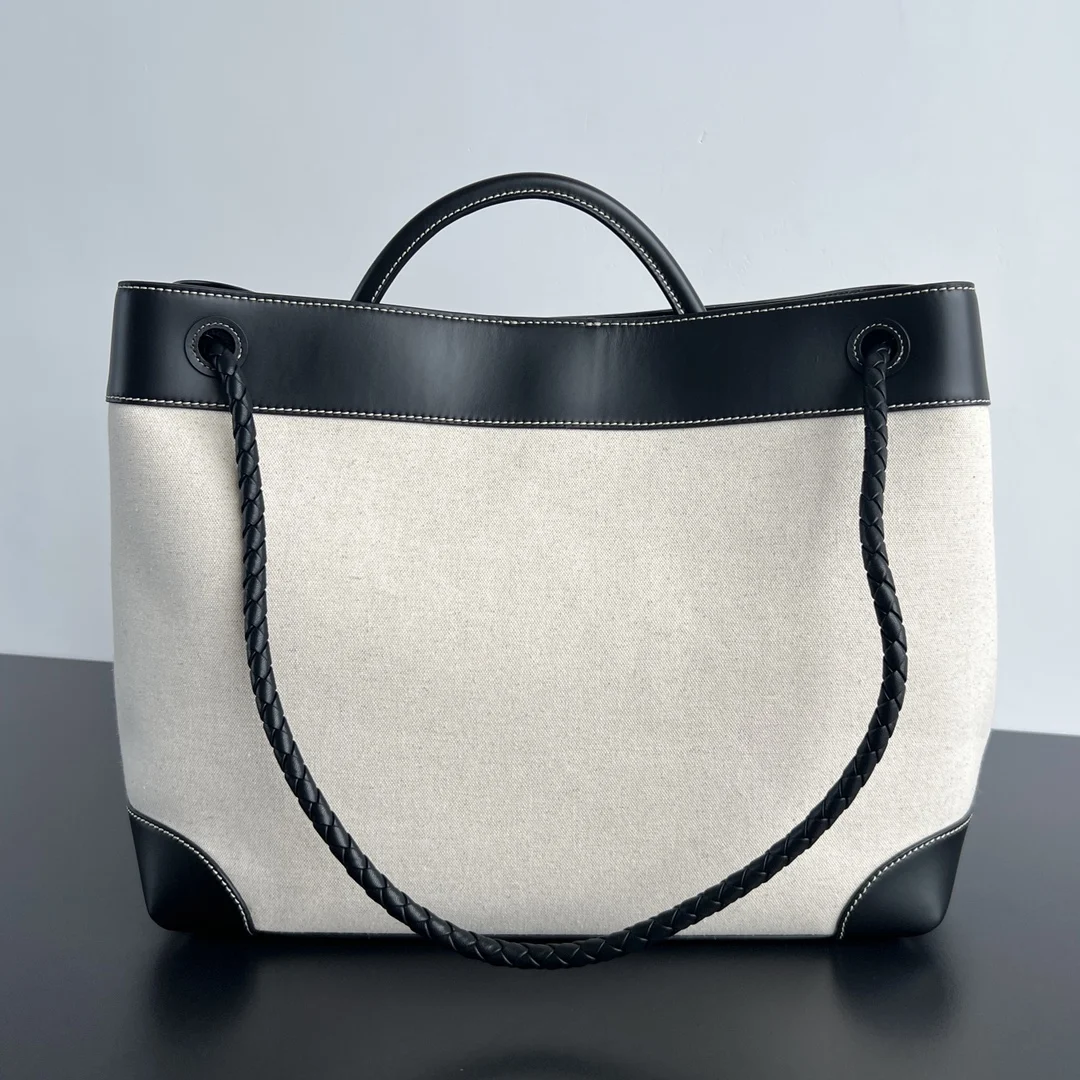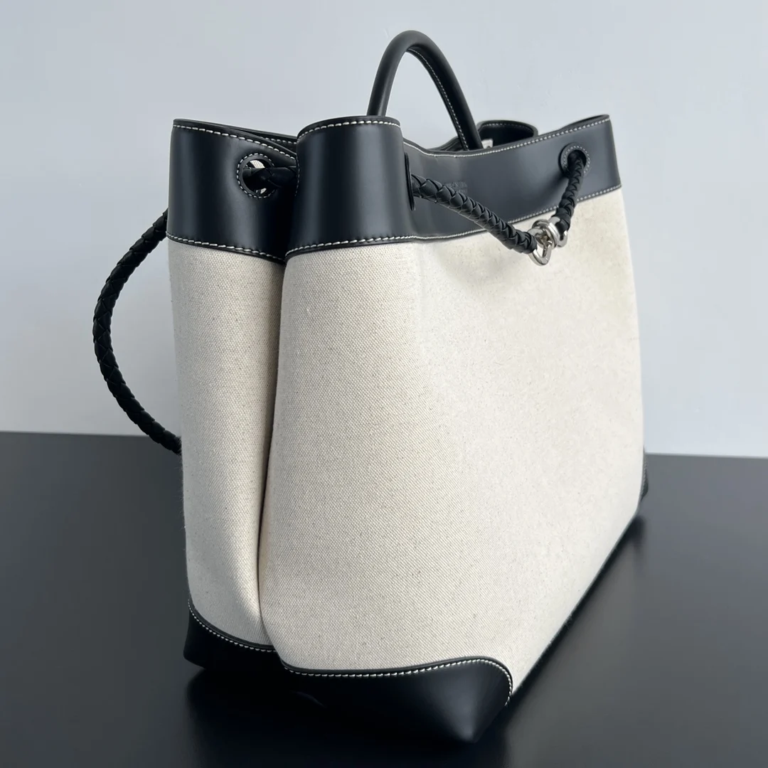 Bv Canvas and Leather Andiamo Bag 786194. Calfskin with canvas. Exquisite! A standout piece. Combining craftsmanship with carefully selected materials, it is durable while offering an extremely soft touch. Features a silver-tone metal knot leather-woven shoulder strap, offering multiple carrying options suitable for various occasions. Lightweight with a relaxed and effortless vibe, it feels gentler than full leather. Dimensions: 42x35x18.