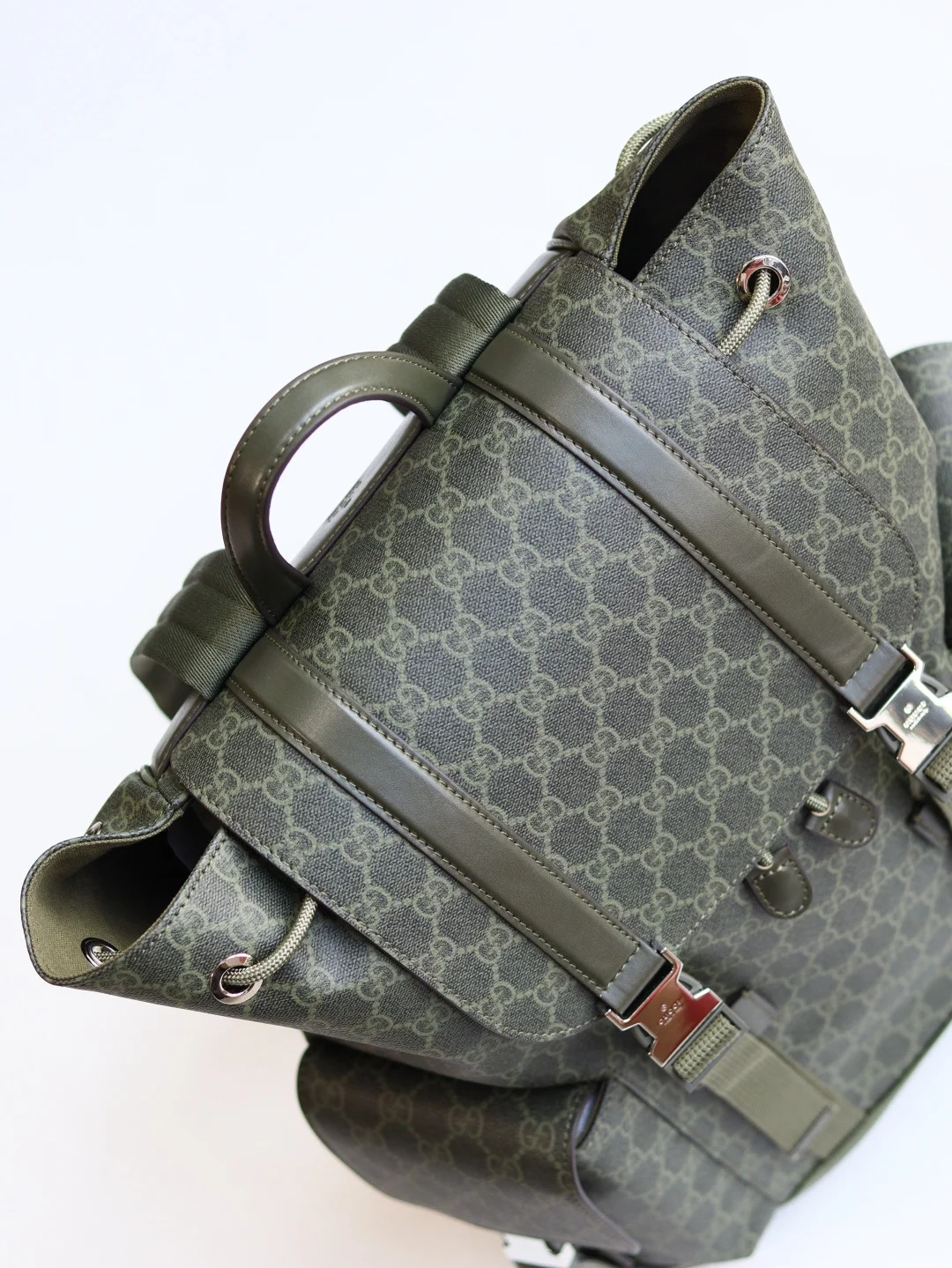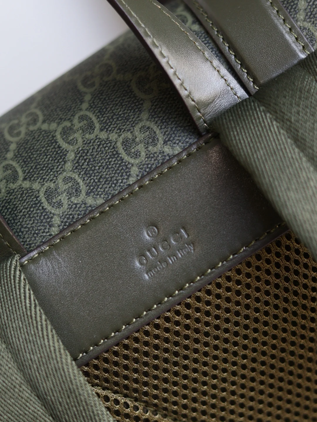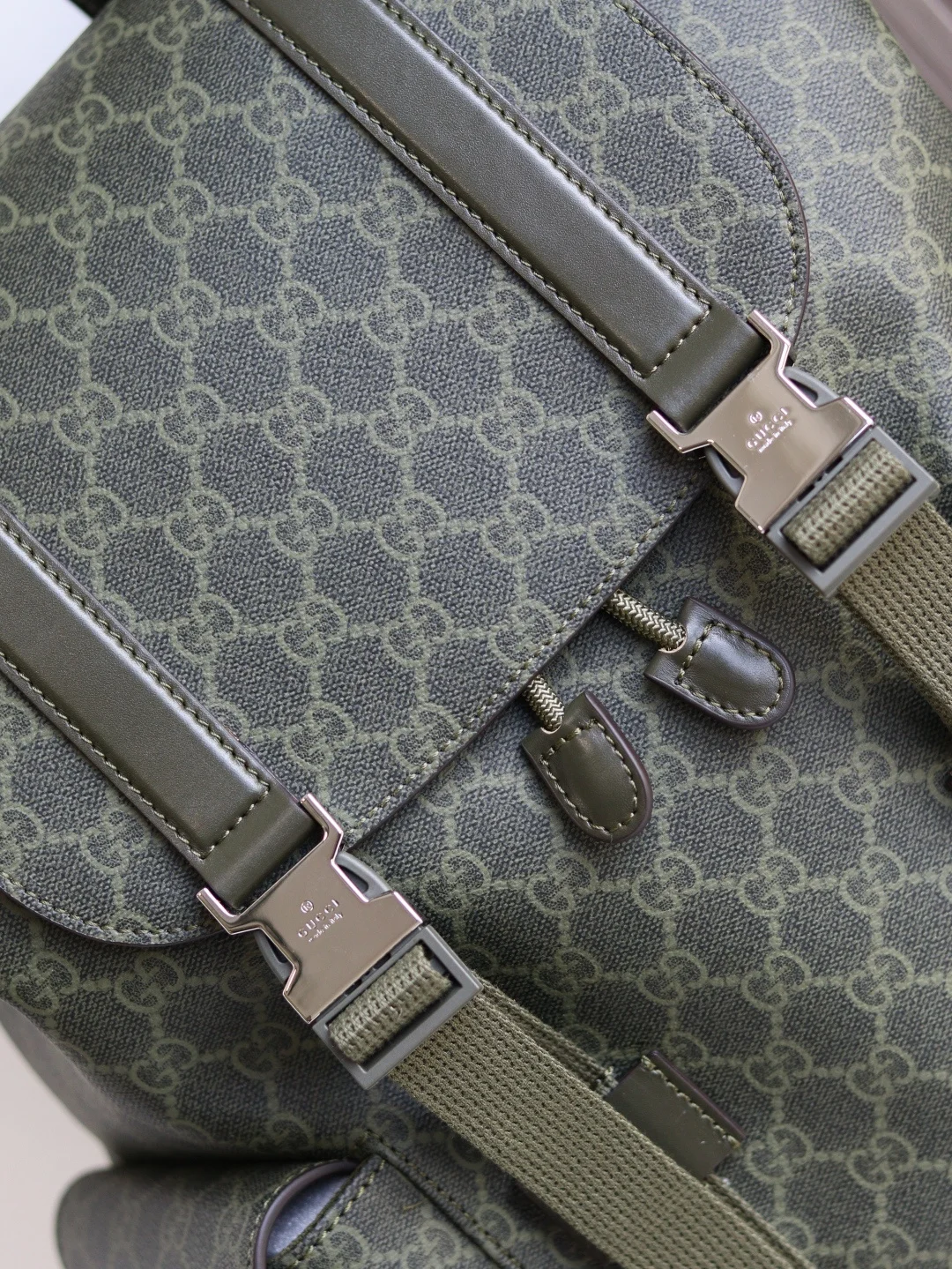 The GG backpack features the classic GG Supreme canvas, known for its soft texture and flexibility, a timeless material that has remained a signature of the brand. Crafted from microfiber-coated fabric, this backpack is presented in all black for a distinctive appeal. Tonal leather trim enhances the silhouette, while the iconic Web stripe adds a touch of color.* Black GG Supreme canvas* Black leather trim* Red and blue Web stripe* Cotton linen lining* Padded mesh back* Canvas straps* Two side pockets with buckle closure* Top handle with 8cm drop* Drawstring closure with flap* Style: 792080* Dimensions: 46cm (H) x 35cm (W) x 12cm (D)* Color: Green Glue Original Leather