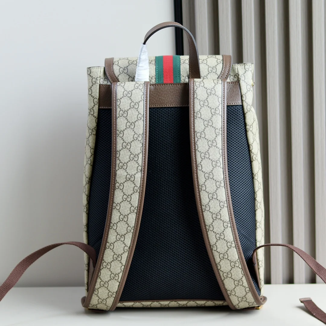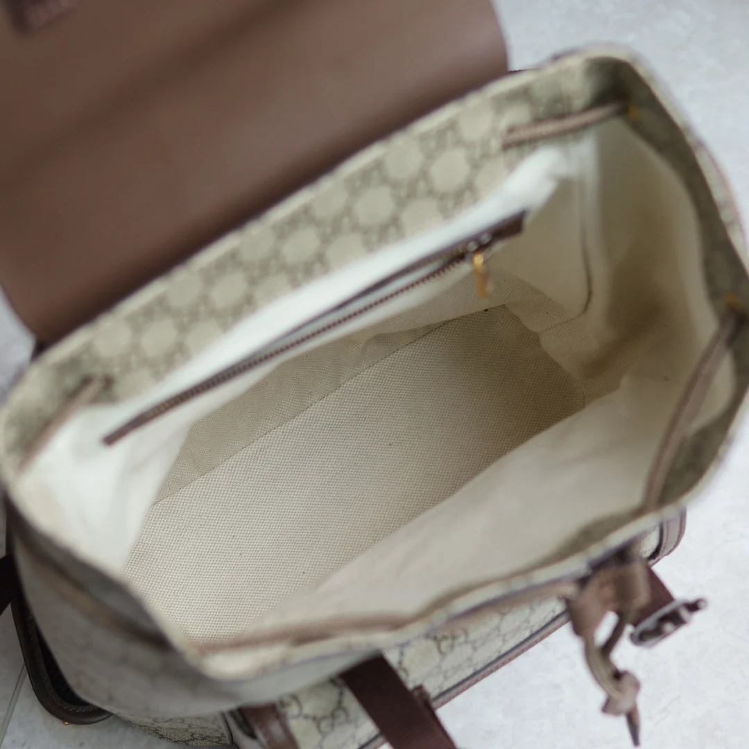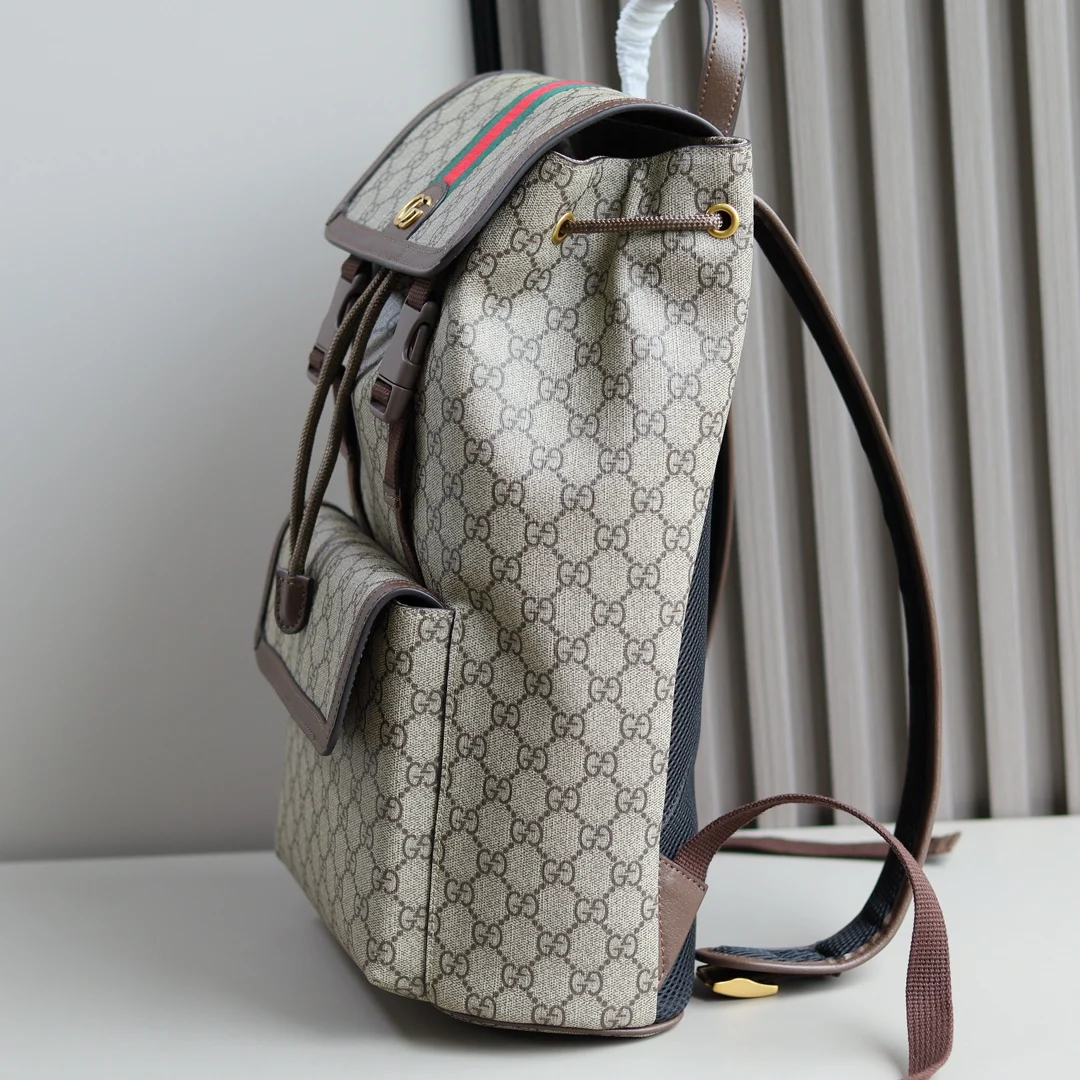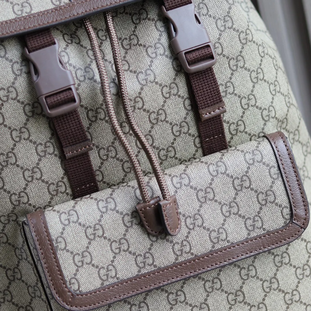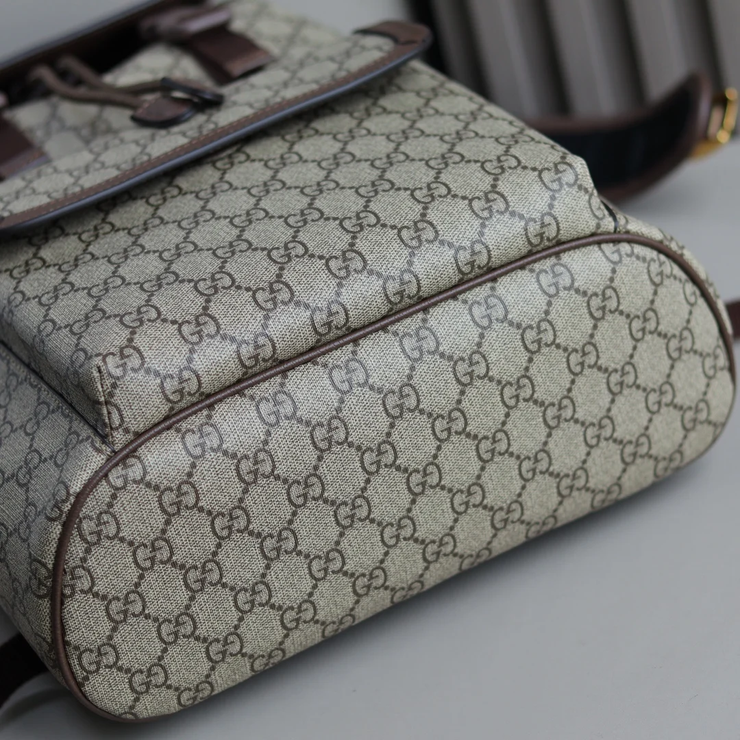 Ophidia small GG backpack. The Ophidia line of men s bags, including mini crossbody bags, briefcases and totes, is updated with practical details. The GG pattern is presented in GG Supreme canvas and classic colors, adding a unique touch to each bag. On this small backpack, crafted in beige and ebony, the pattern is presented in a striking and eye-catching way. Beige and ebony GG Supreme canvas, grey leather trim, gold-toned hardware, cotton linen lining, Double G, Interior: one zipper pocket, Exterior: one magnetic snap pocket, Top handle with 8cm drop, Drawstring and flap closure. Model: 792114. Dimensions: 29cm (W) x 40.5cm (H) x 13.5cm (D). Colour: Brown PVC. Weight: approximately 0.8kg. Made in Italy.