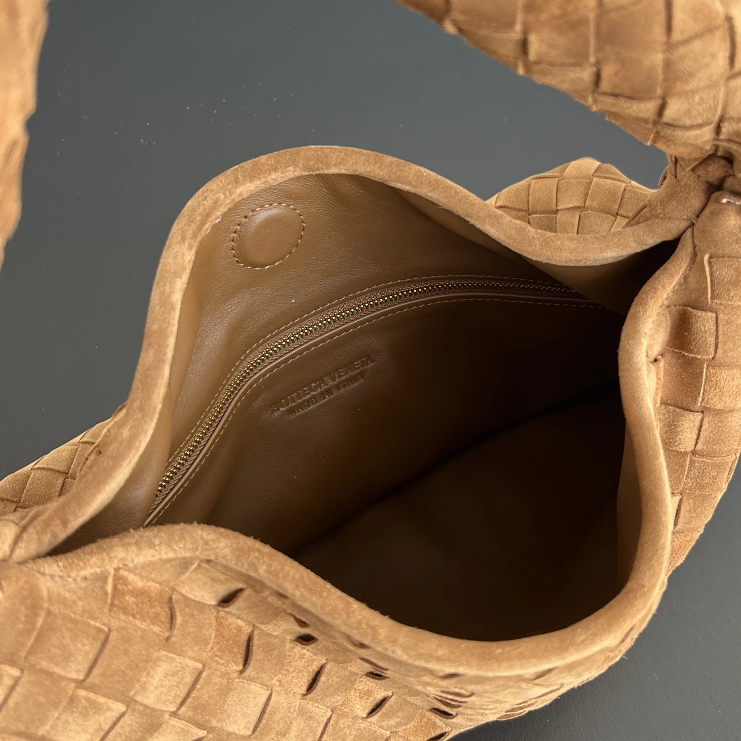Bottega Veneta New Medium Lambskin HOP Bag 796262. The body and handle are woven from a single piece of lambskin leather. The soft and relaxed Hop bag symbolizes the praise for inn..