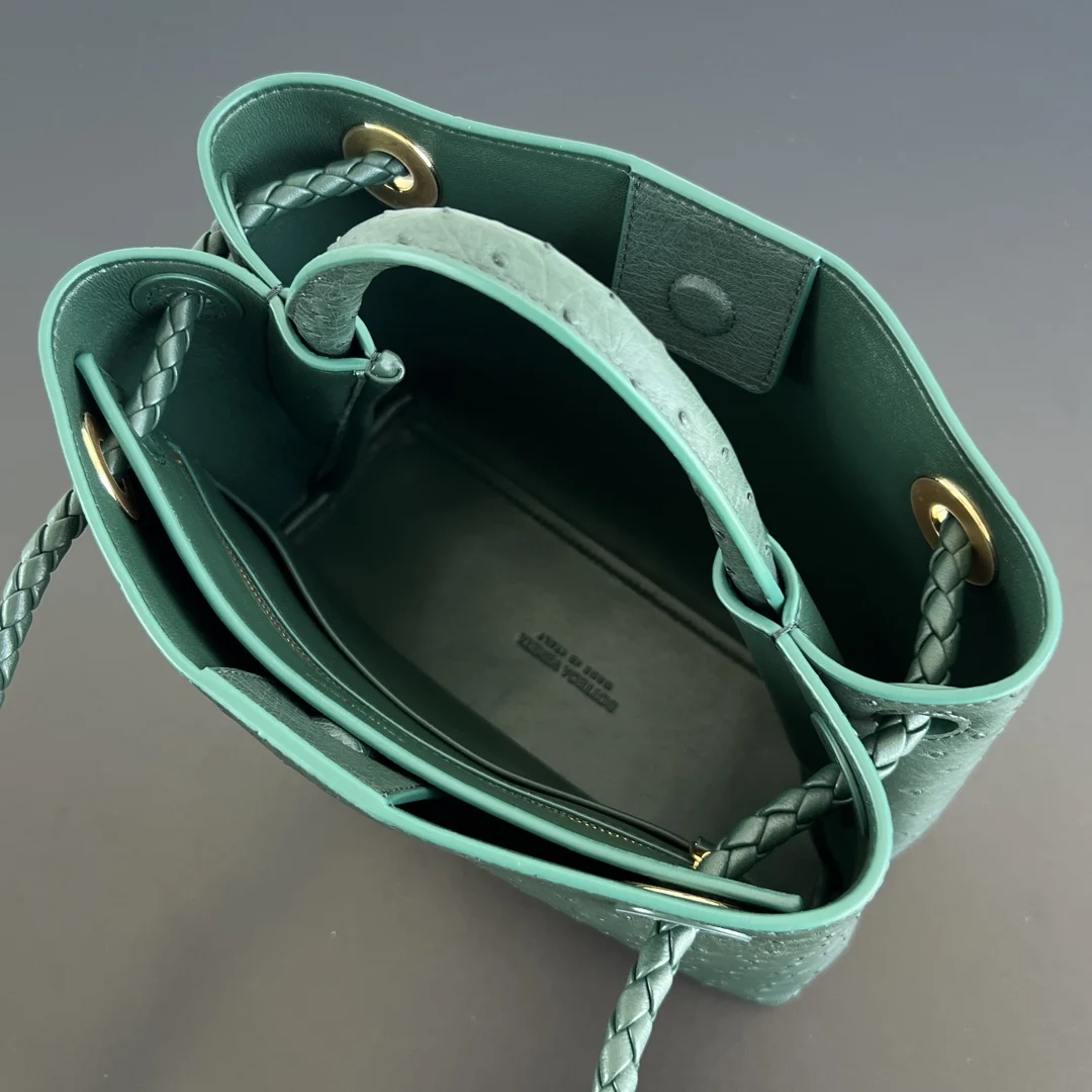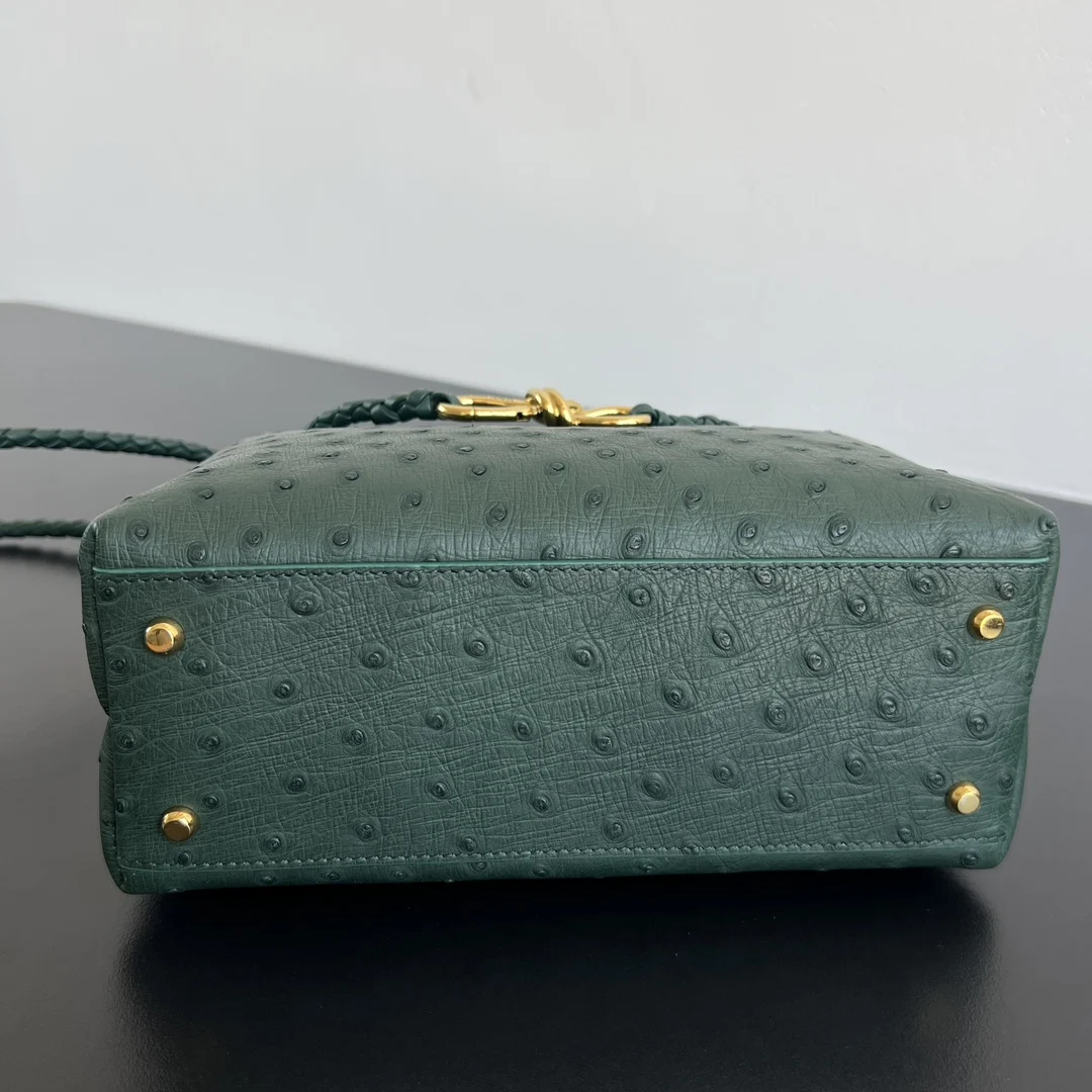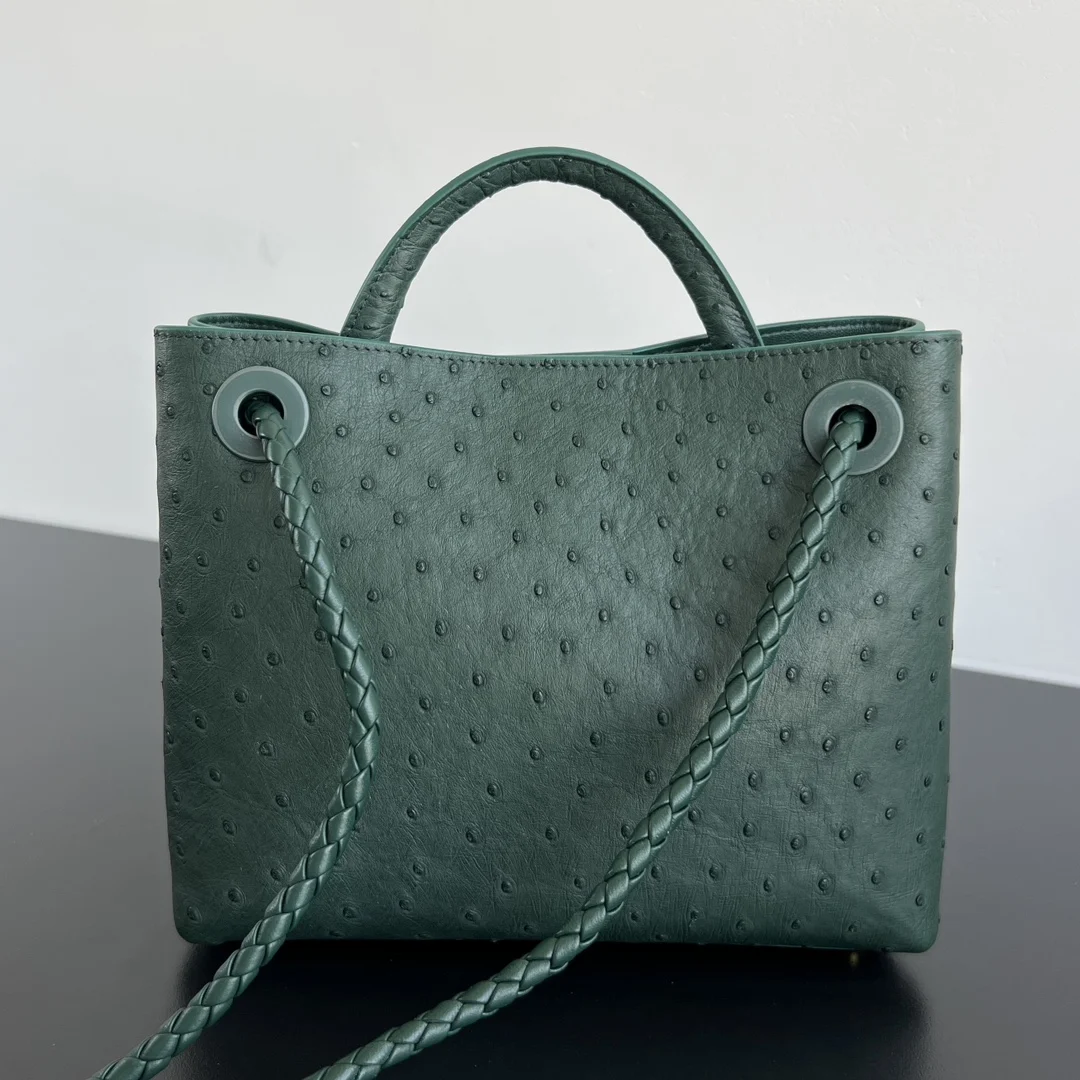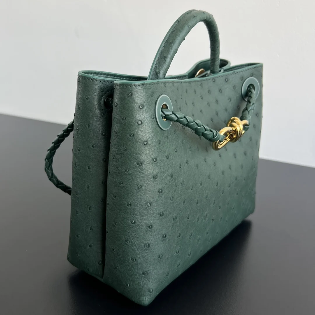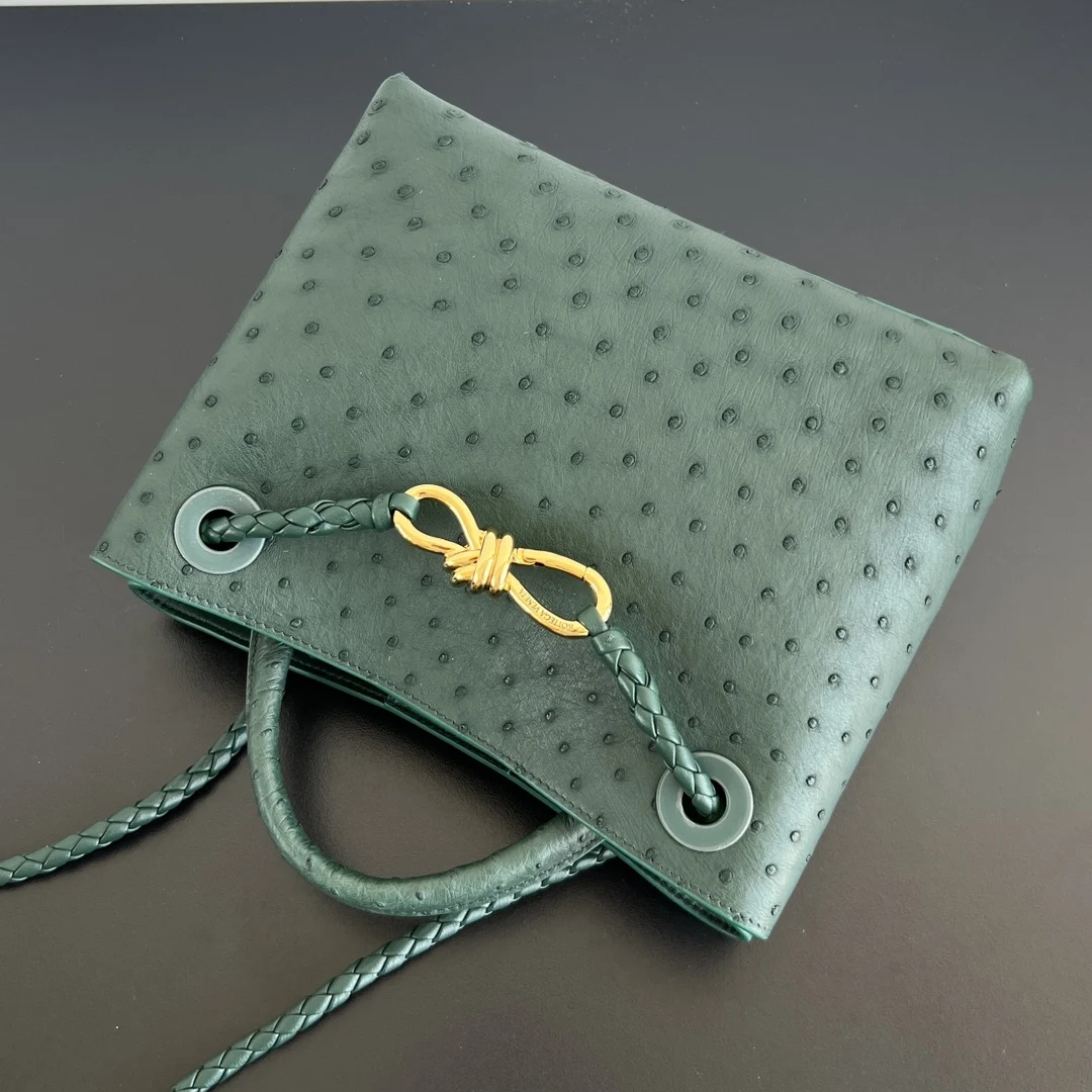BV New Arrival Ostrich Leather Andiamo 805231 - A must-have for texture enthusiasts! The allure of ostrich leather Crafted from precious ostrich leather! The leather features unique pearl follicles, each natural pore offering a one-of-a-kind texture. It feels delicate yet subtly granular to the touch, with a soft, cloud-like shape that exudes effortless style . However, the resilience of ostrich leather provides a luxurious structure . The metal knot clasp complements the matte finish of the ostrich leather perfectly, radiating understated and effortless elegance . This bag understands the female aesthetic, blending gentleness with strength, ideal for those seeking understated luxury . Dimensions: 25x20x10