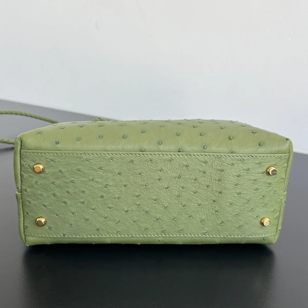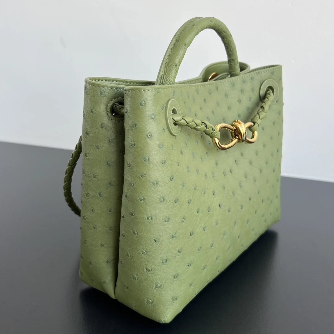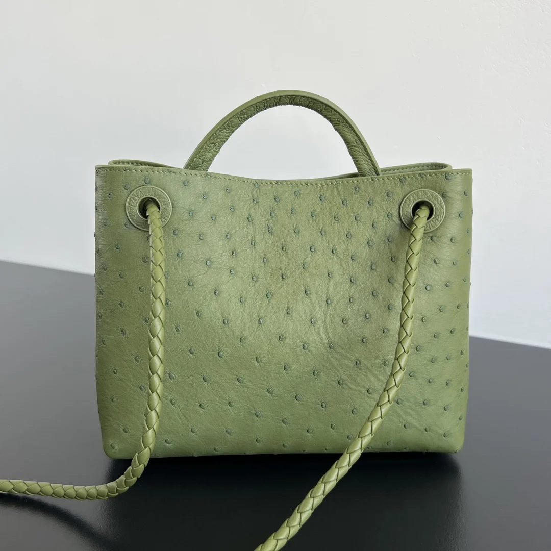 BV New Arrival Ostrich Leather Andiamo 805231 - A must-have for texture enthusiasts! The allure of ostrich leather Crafted from precious ostrich leather! The leather features unique pearl follicles, each natural pore offering a one-of-a-kind texture. It feels delicate yet subtly granular to the touch, with a soft, cloud-like shape . However, the resilience of ostrich leather provides a luxurious structure . The metal knot clasp perfectly complements the matte finish of the ostrich leather, exuding effortless sophistication in its understated elegance . This bag understands the female aesthetic, blending gentleness with strength, ideal for those seeking understated luxury . Dimensions: 25x20x10