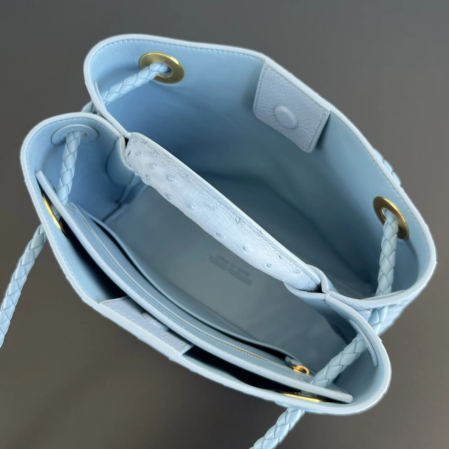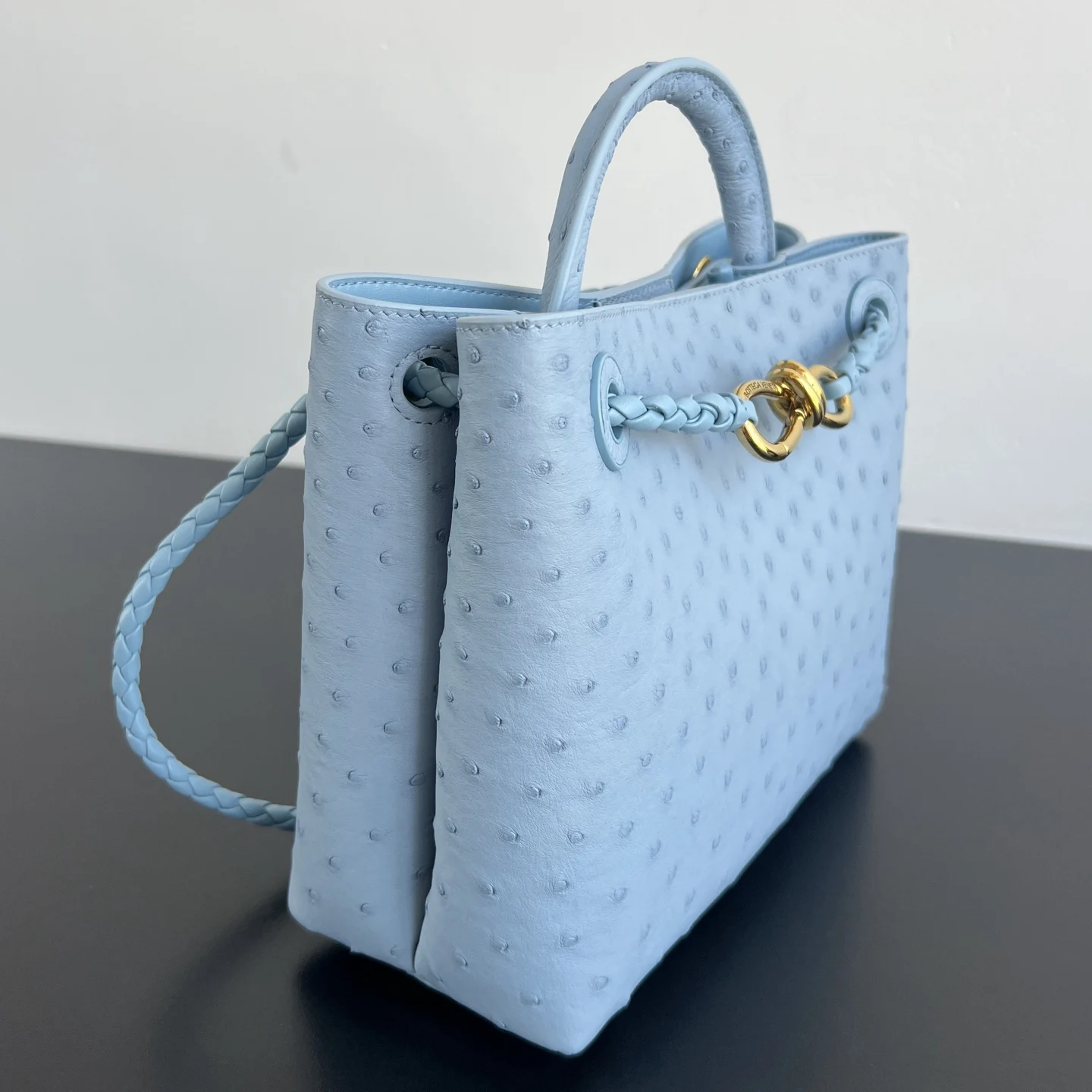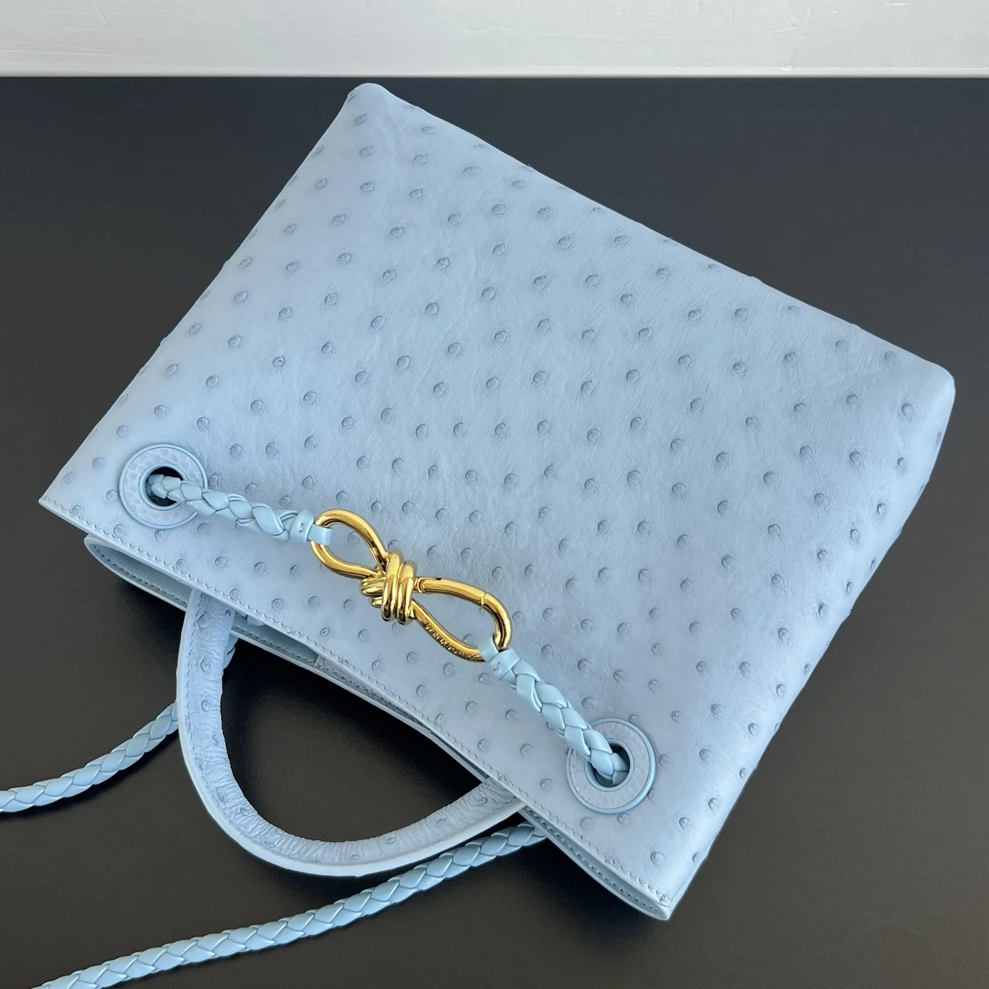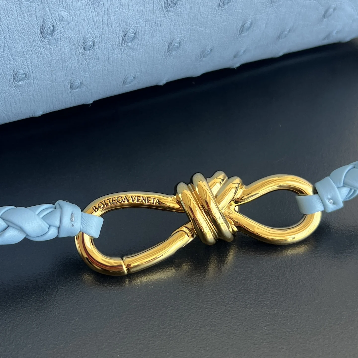 BV New Arrival Ostrich Leather Andiamo 805231 - A must-have for texture enthusiasts! The captivating code of ostrich leather Crafted from precious ostrich leather! The leather features unique pearl follicles, each natural pore offering a one-of-a-kind texture. It feels delicate yet subtly granular to the touch, with a soft, cloud-like bag shape . However, the resilience of ostrich leather allows it to maintain a luxurious structure . The metal knot clasp perfectly complements the matte finish of the ostrich leather, exuding effortless sophistication in its understated elegance . This bag understands the female aesthetic, being both gentle and powerful, ideal for those seeking understated luxury . Dimensions: 25x20x10