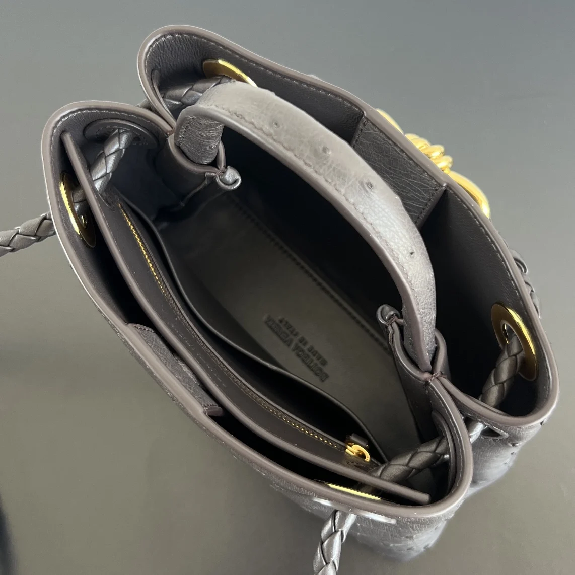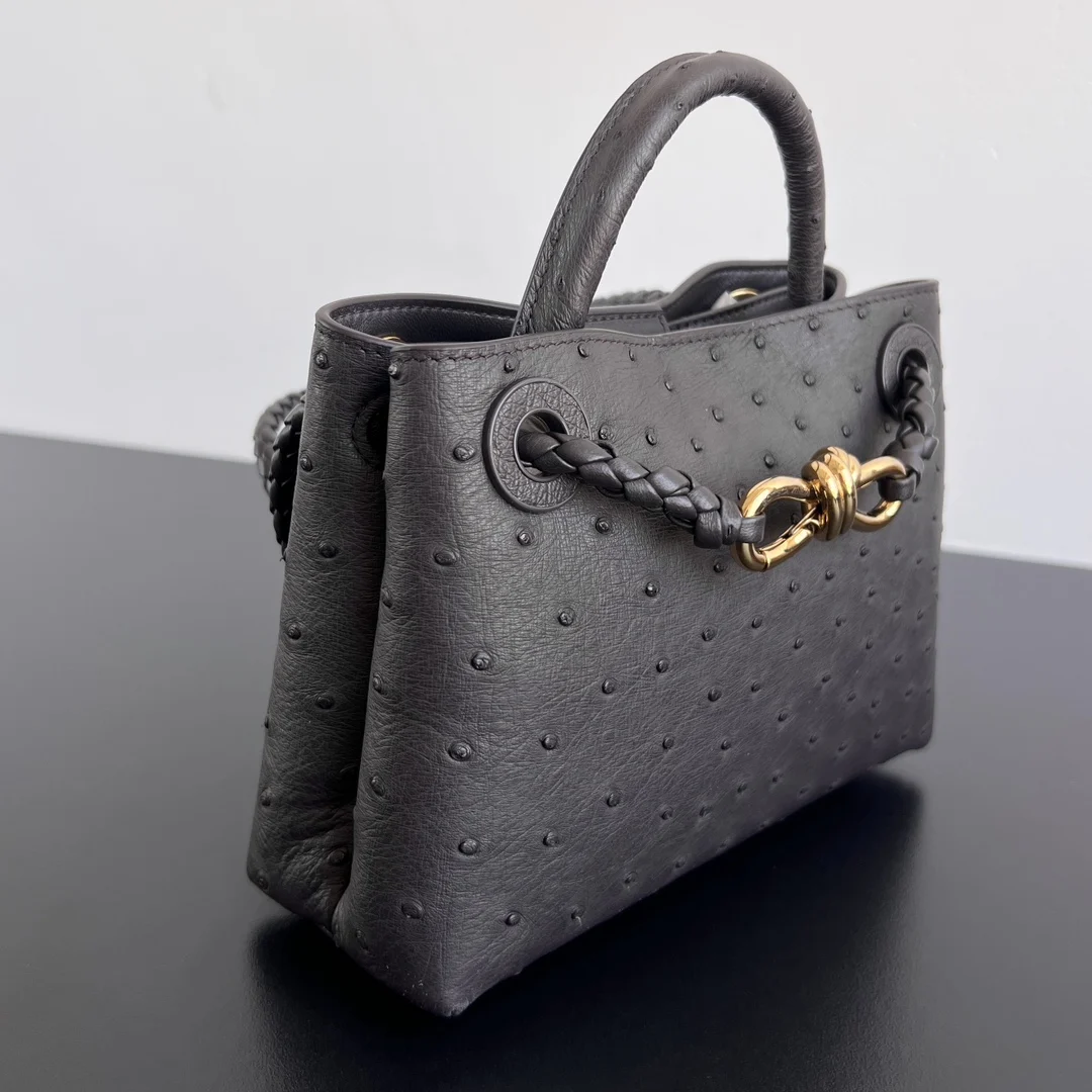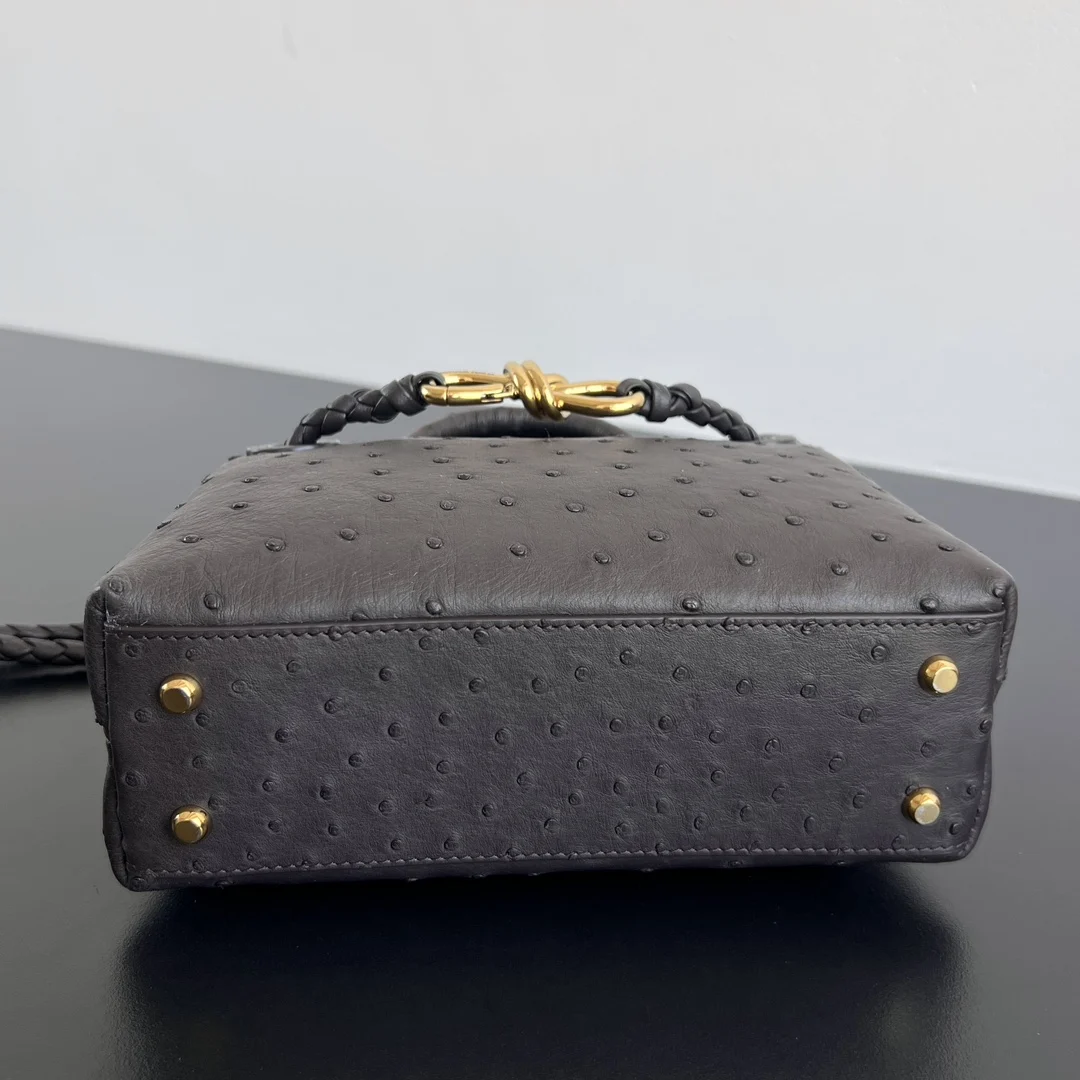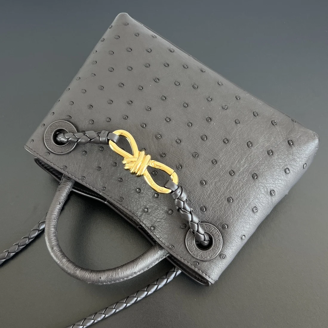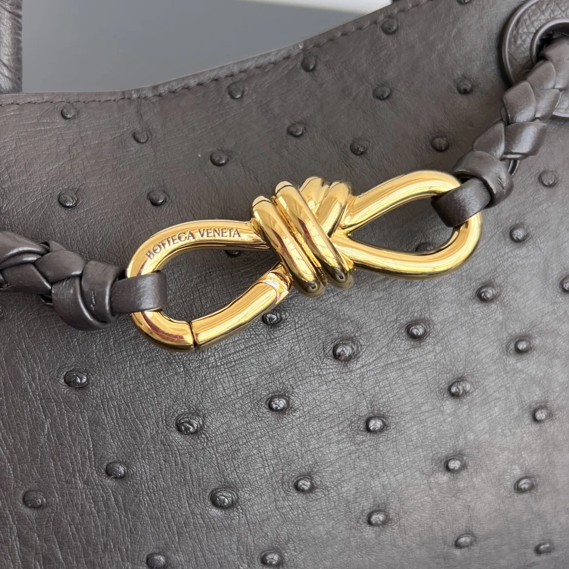 BV New Arrival Ostrich Leather Andiamo 805232 - A must-have for texture enthusiasts! The charm of ostrich leather Crafted from precious ostrich leather! The leather features unique pearl follicles, each natural pore offering a one-of-a-kind texture. It feels delicate yet slightly grainy to the touch, and the soft, puffy bag shape evokes a sense of effortless cloud-like comfort . However, the resilience of ostrich leather provides a luxurious structure . The metal knot closure perfectly complements the matte finish of the ostrich leather, exuding understated and effortless elegance . This bag understands the aesthetics of women, offering both gentleness and strength, making it ideal for those who desire understated luxury . Dimensions: 20x15x7