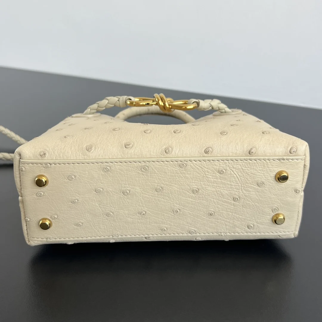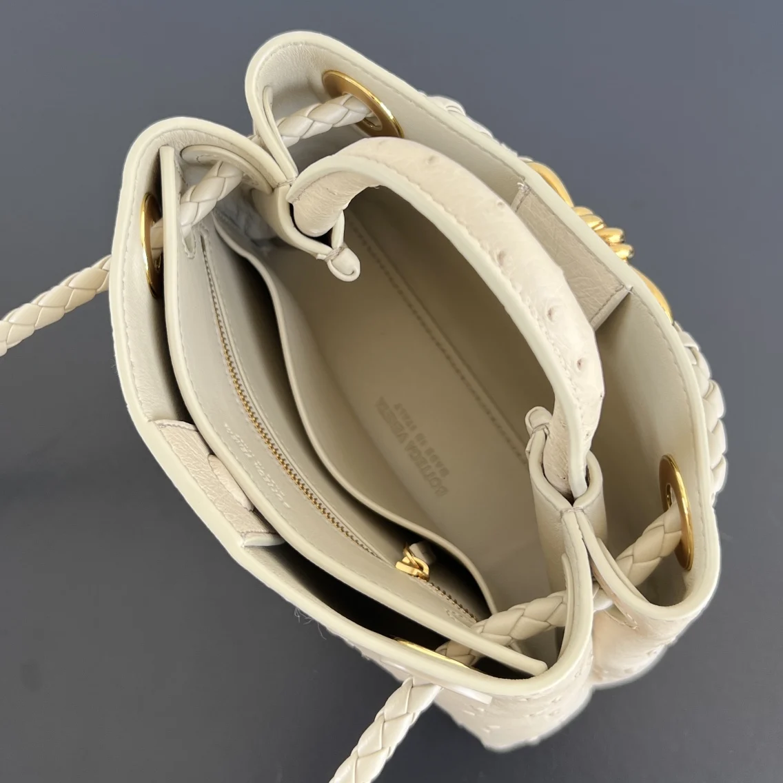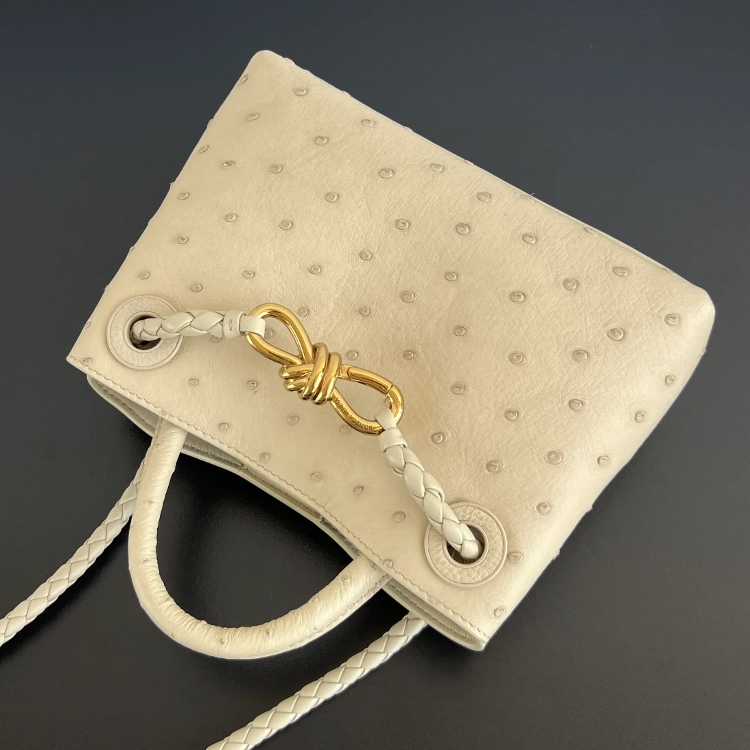 BV New Arrival: Ostrich Leather Andiamo 805232. A must-have for texture enthusiasts! The allure of ostrich leather Crafted from precious ostrich leather! The leather features unique pearl follicles, with each natural pore offering a one-of-a-kind texture. It feels delicate yet slightly granular to the touch, and the soft, puffy bag shape evokes a sense of effortless cloud-like comfort However, the resilience of ostrich leather also allows it to maintain a luxurious structure The metal knot closure perfectly complements the matte finish of the ostrich leather, exuding understated and effortless elegance This bag understands the female aesthetic, offering both gentleness and strength, making it ideal for those who desire understated luxury Dimensions: 20x15x7