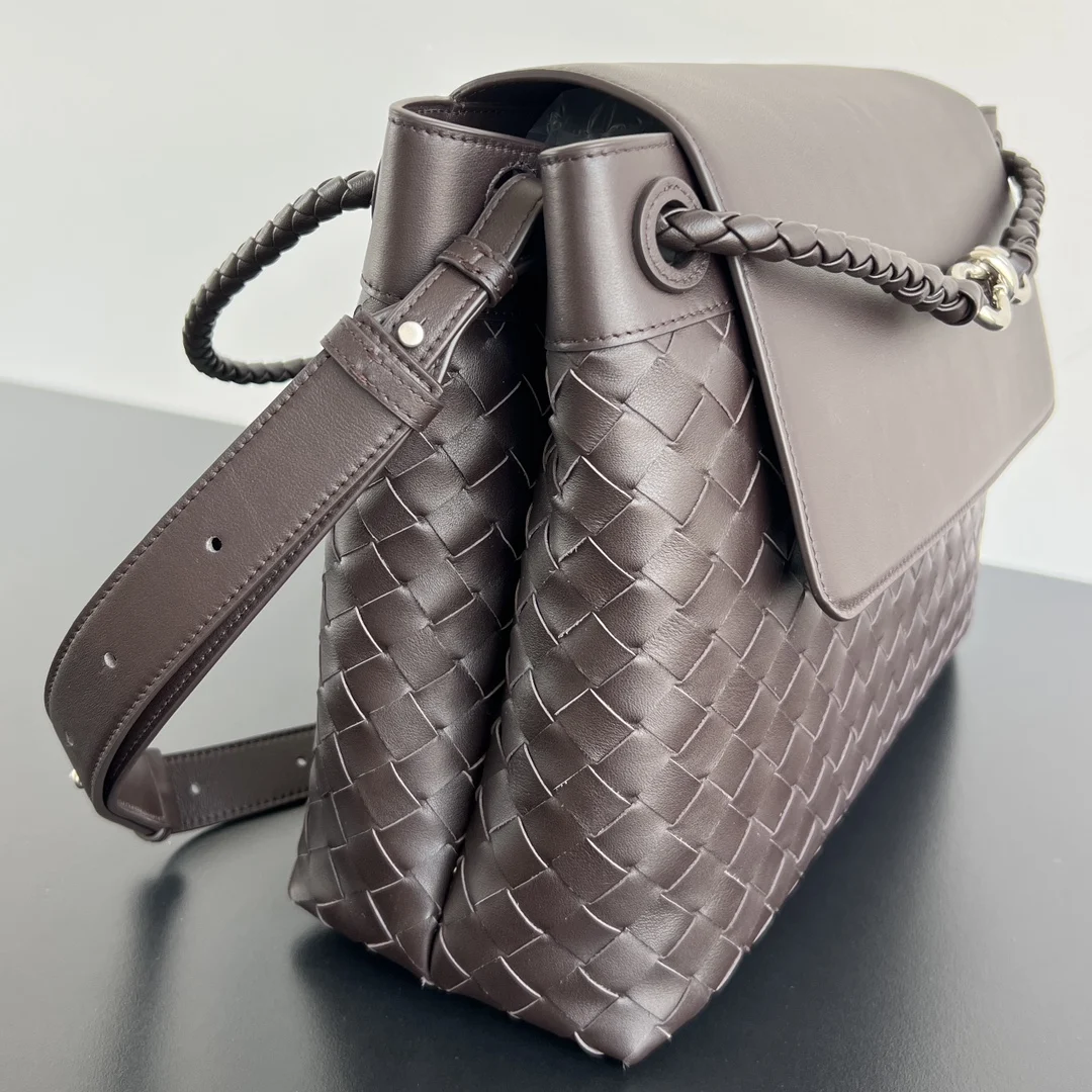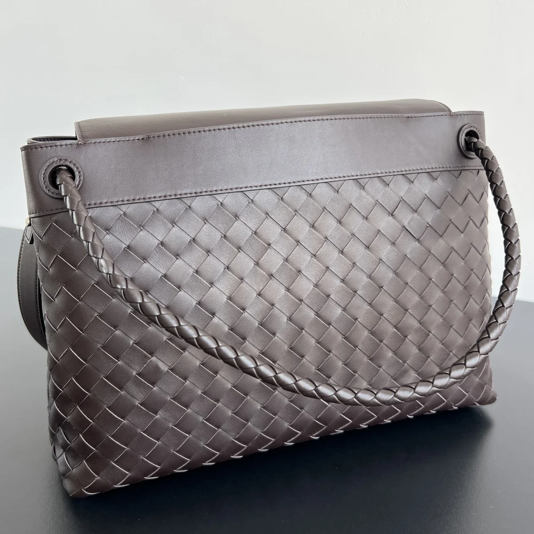 The new BV men s Andiamo 807715 is a stylish and versatile bag that can be carried by hand, worn on the shoulder, or crossbody. The combination of the iconic lntrecciato weave and smooth leather creates a unique and cool style. The subtle luster and natural texture of the calfskin are luxurious and fashionable. The flap design, Knot rope shoulder strap, and sturdy full-leather shoulder strap provide more privacy and multiple carrying options. Both sizes can accommodate a laptop, making it suitable for daily commutes, business trips, or travel. Dimensions: 37x26x13