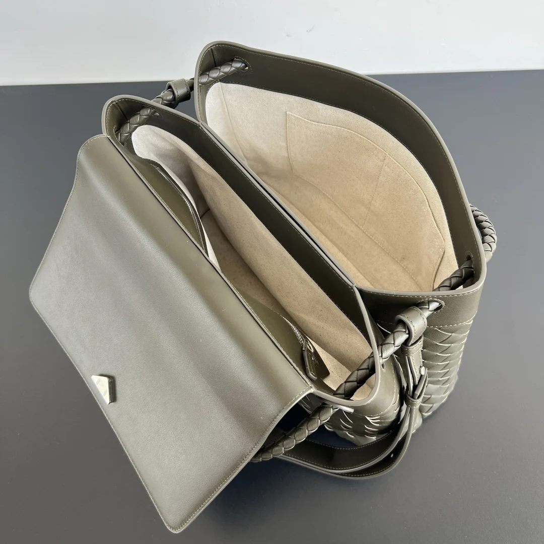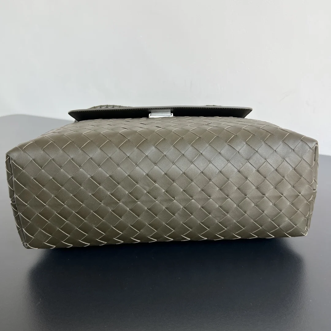 The new BV men s Andiamo 807715 is a stylish and versatile bag that can be carried by hand, on the shoulder, or crossbody. The combination of the iconic lntrecciato weave and smooth leather creates a unique and cool style. The subtle luster and natural texture of the calfskin are high-end and fashionable. The flap design, Knot rope shoulder strap, and sturdy full-leather shoulder strap provide more privacy and multiple carrying options. Both sizes can accommodate a laptop, making it suitable for daily commutes, business trips, or travel. Dimensions: 37x26x13