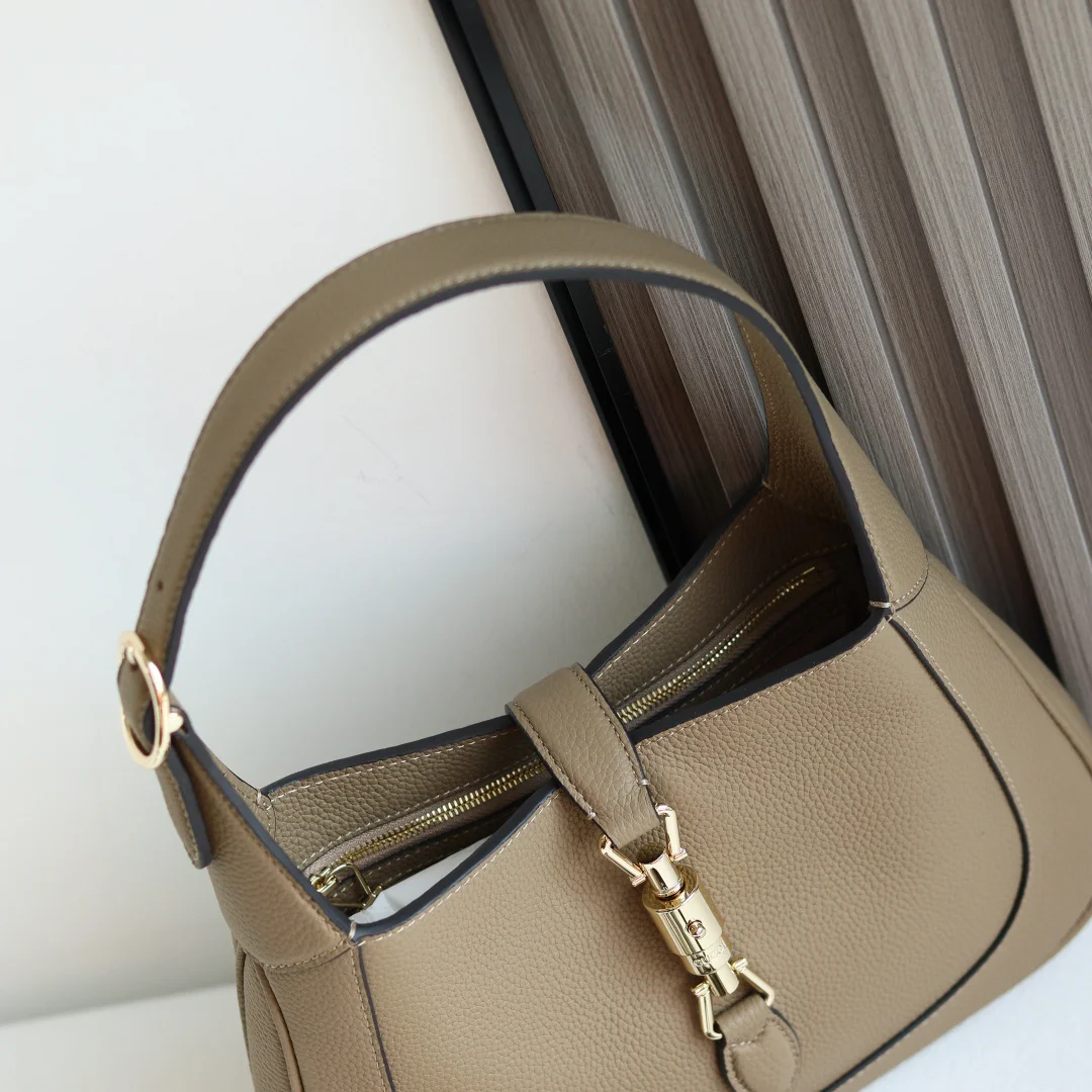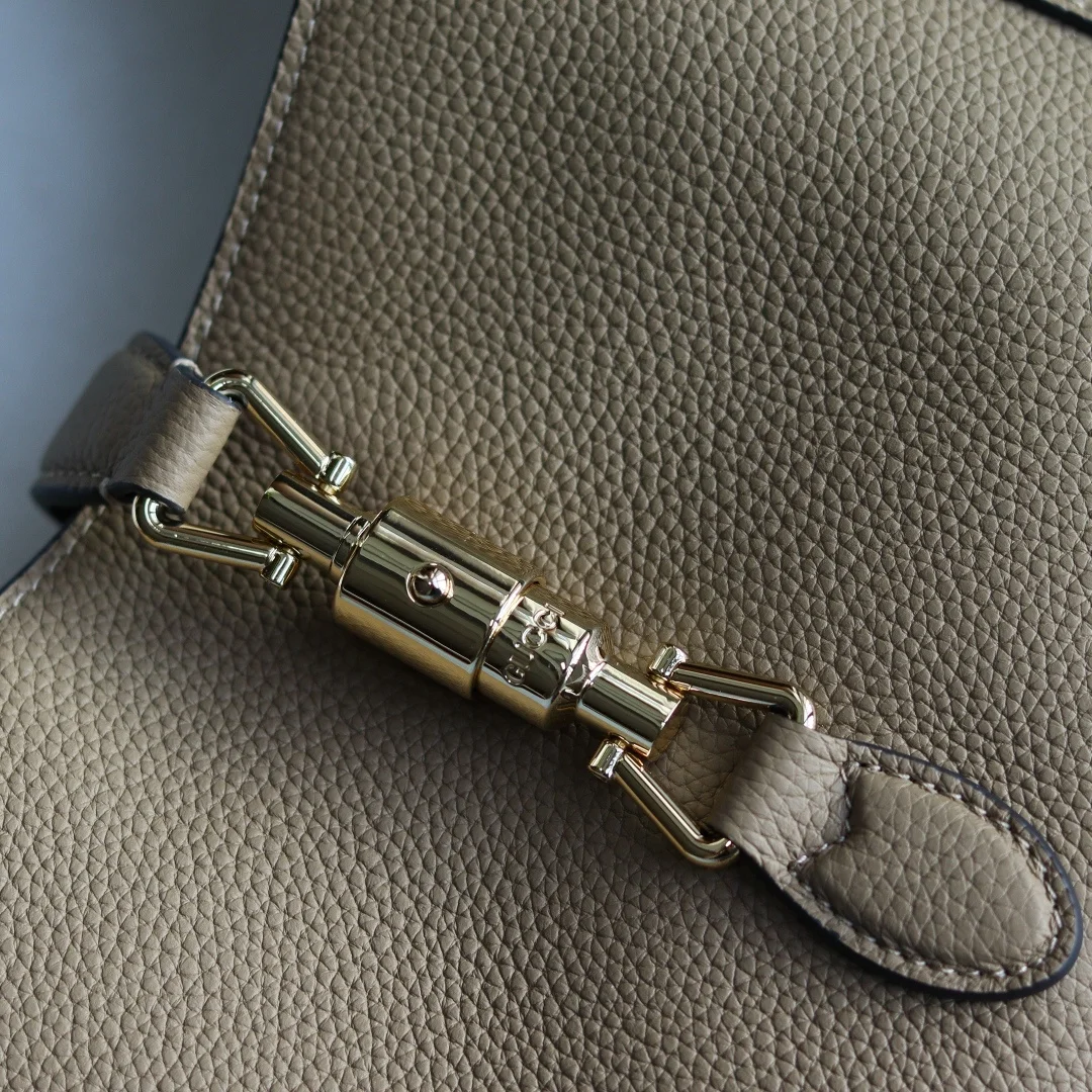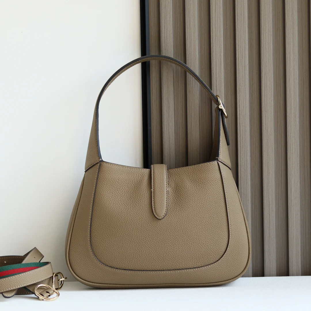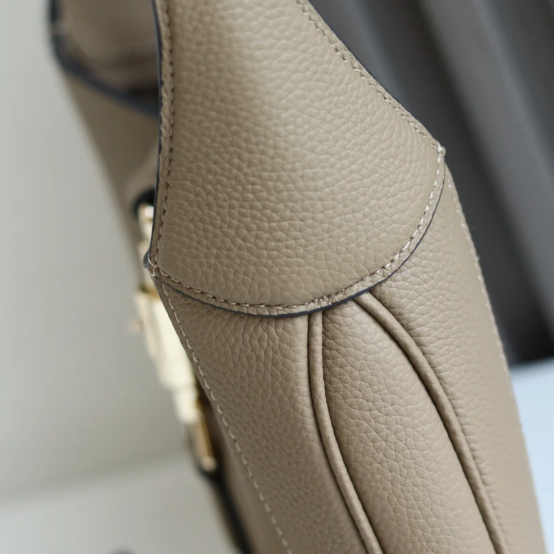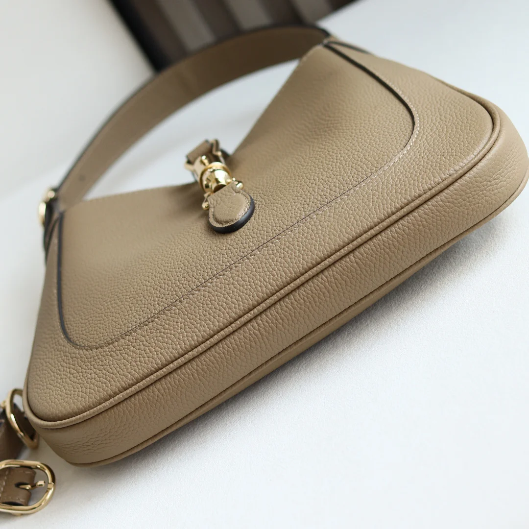 The Gucci Jackie 1961 shoulder bag is reimagined for the Fall Winter 2024 collection in refined Rosso Ancora leather, featuring a new light gold-toned piston closure that highlights the House s craftsmanship, crescent shape, and sleek silhouette of the iconic handbag. This small shoulder bag comes with a leather shoulder strap and an additional Web shoulder strap, offering versatile styling options. Style: 810232. Dimensions: 27.5cm (W) x 19cm (H) x 4cm (D). Color: Lychee-textured Oat Original Leather.