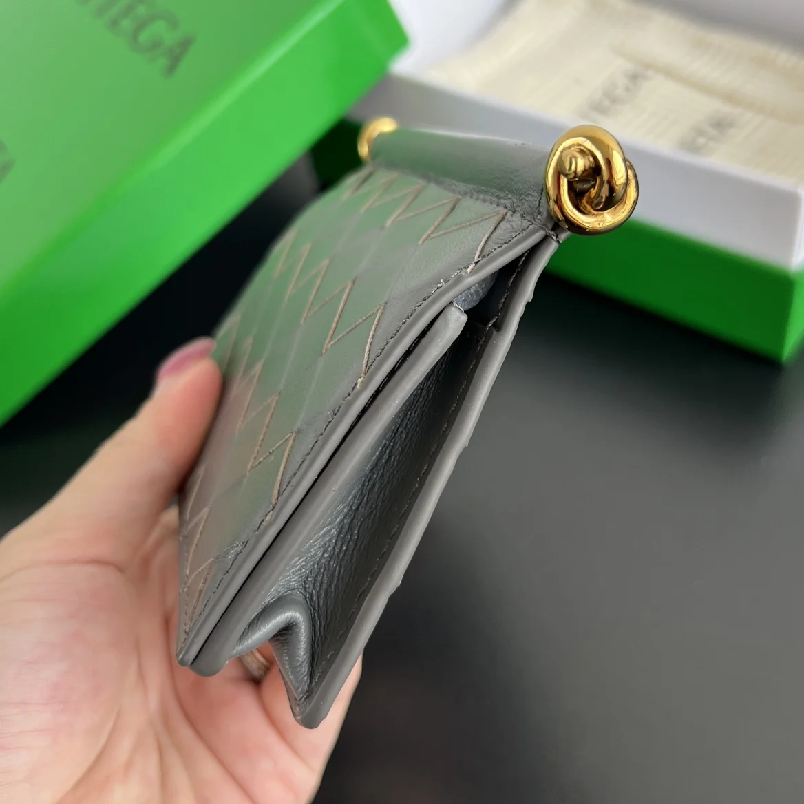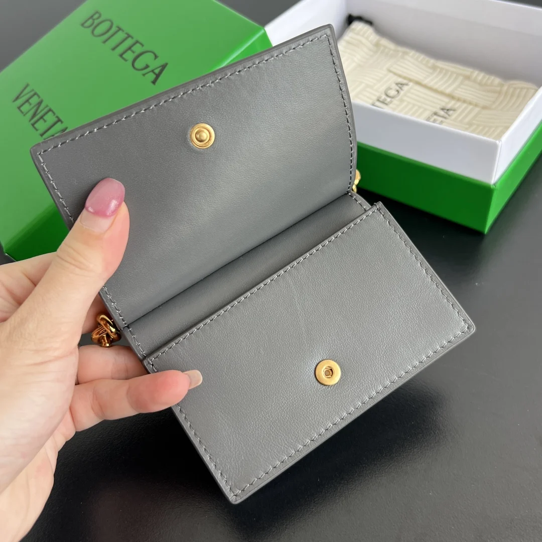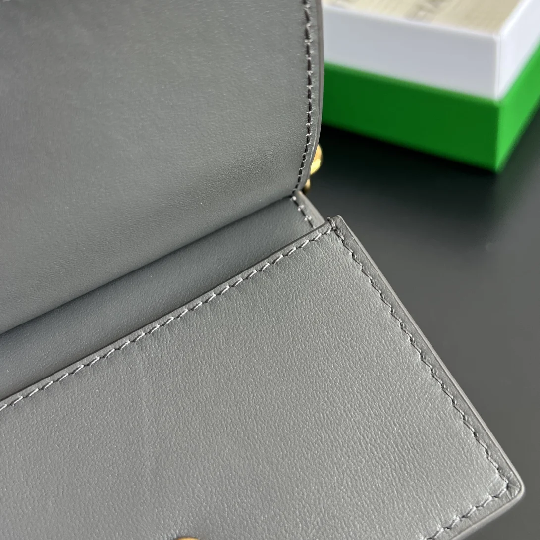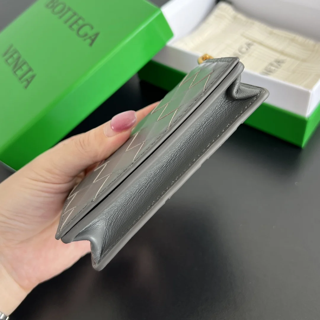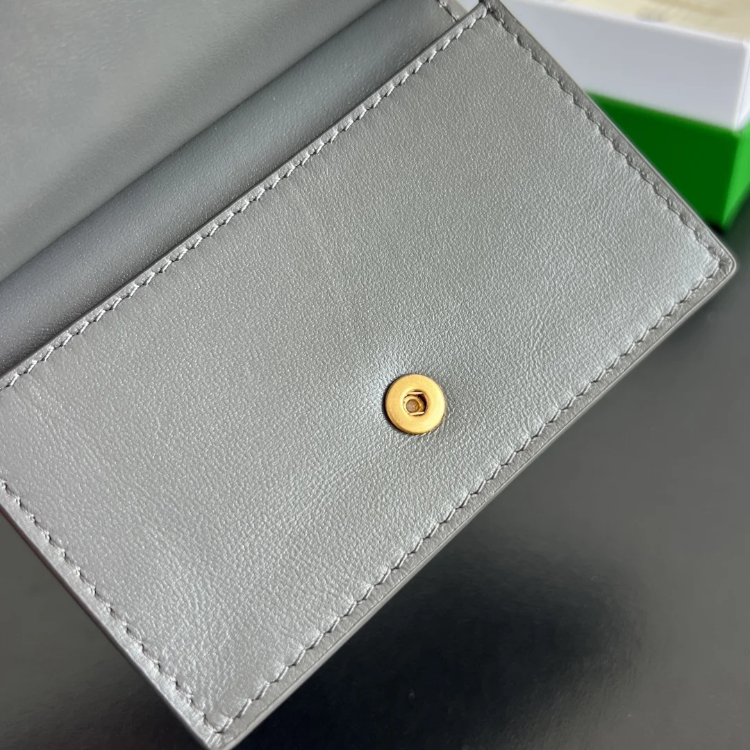 BV New Solstice Short Card Holder 810596 features the classic Intrecciato weave with metal hardware embellishments, catering to the desire for quality and unique design. Made of fine, soft, and lustrous calfskin leather, the flap handle is accented with tubular Kont metal, presenting a more structured and fashionable appearance. Snap closure. The interior is spacious, compact, and exquisite, easily accommodating multiple cards and coins. Stop letting your cards roam freely in your bag; give them a VIP suite! Dimensions: 11*7.8*2.5cm