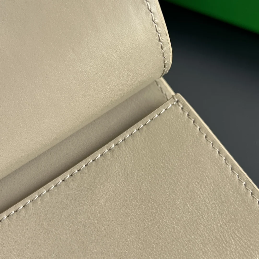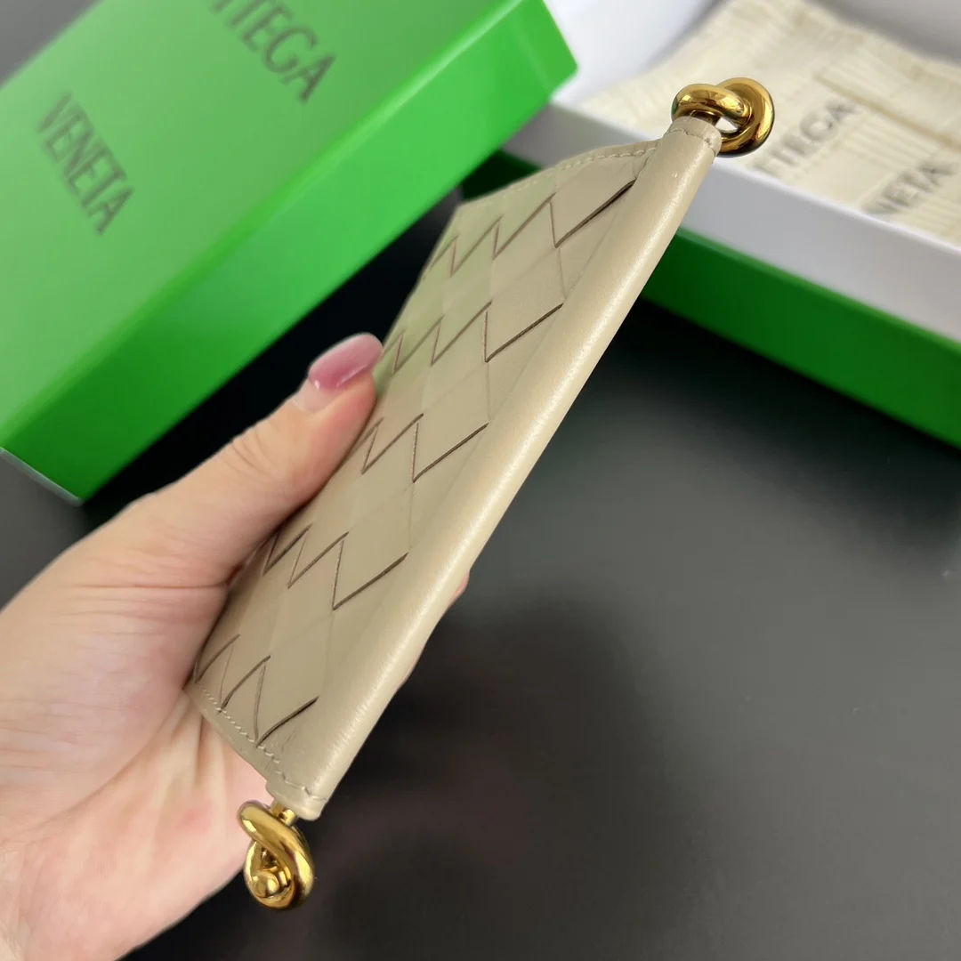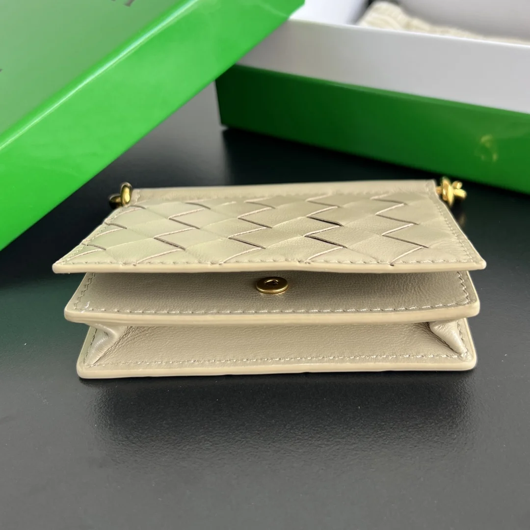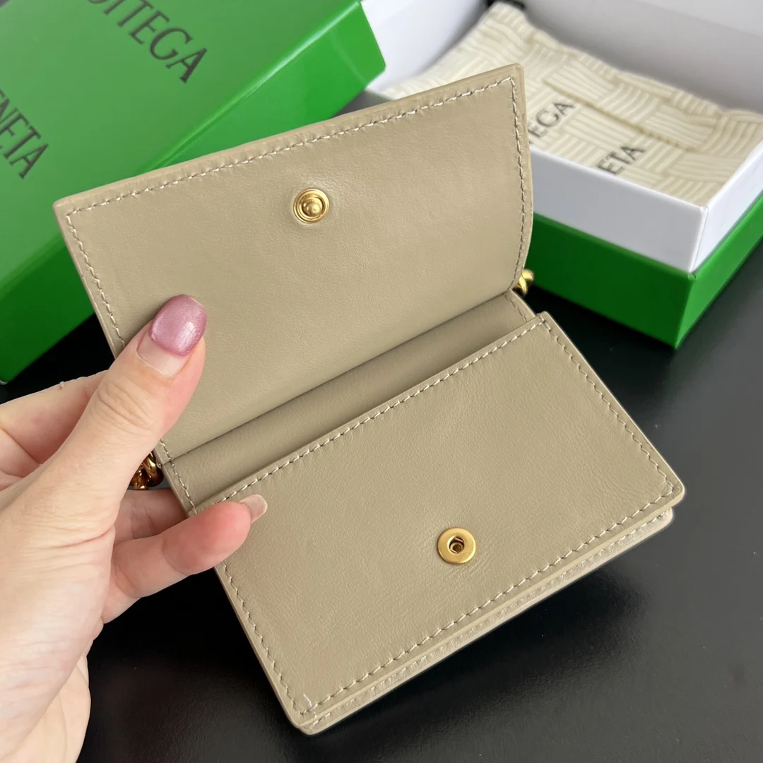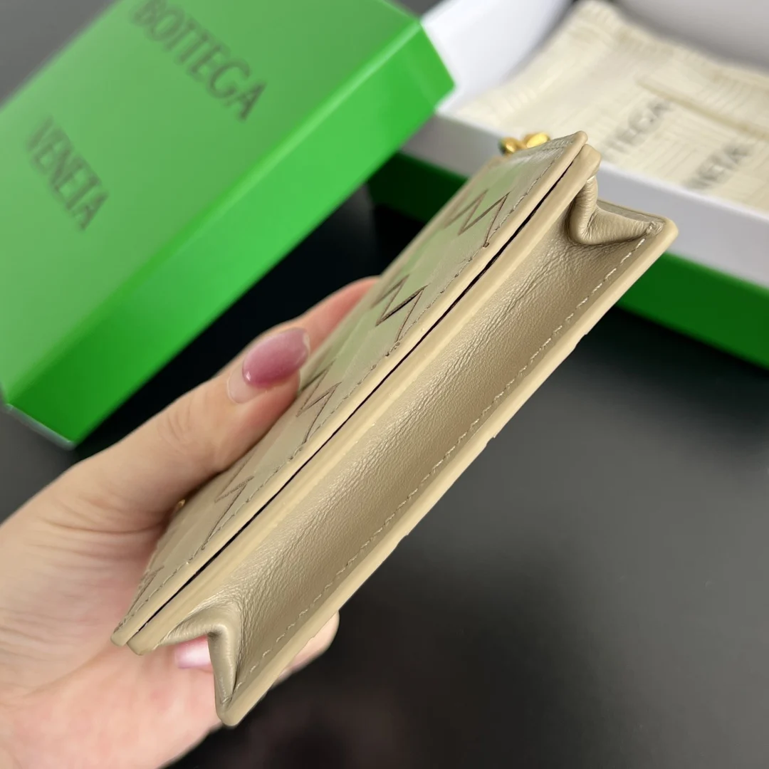 BV New Solstice Short Card Holder 810596 features the classic Intrecciato weave with metal hardware embellishments, catering to the desire for quality and unique design. Made of fine, soft, and lustrous calfskin leather, the flap handle is accented with tubular Kont metal, presenting a more structured and fashionable appearance. Snap closure. The interior is spacious, compact, and exquisite, easily accommodating multiple cards and coins. Stop letting your cards run wild in your bag; give them a VIP suite! Dimensions: 11*7.8*2.5cm