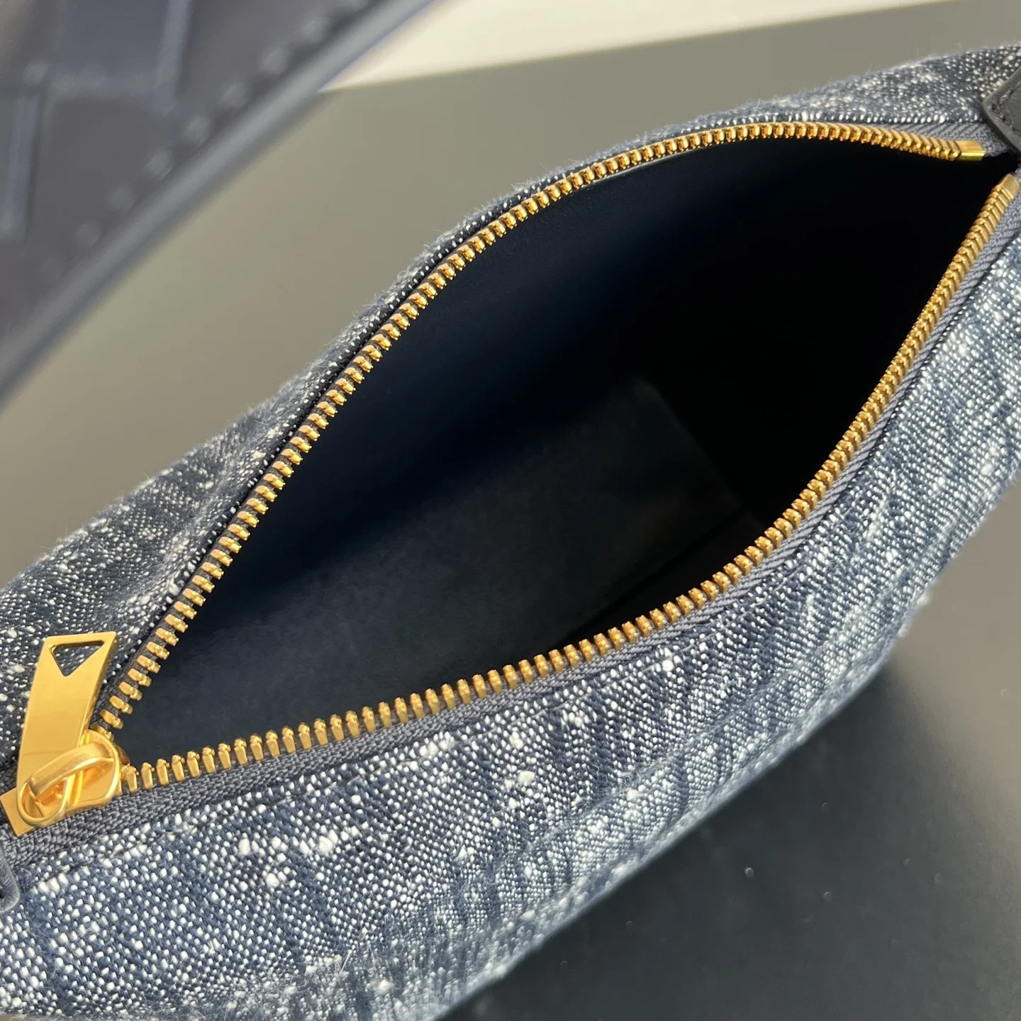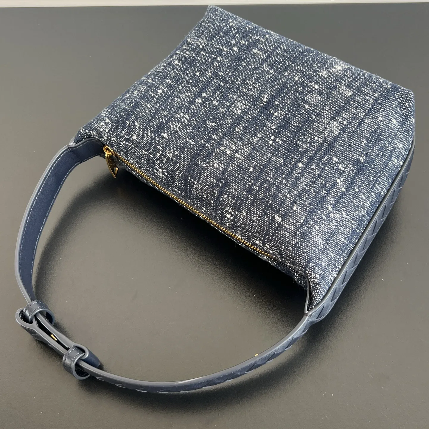 BV New Arrival: Danny Denim Wallace 815689. Terry denim with a vintage, distressed feel. Subtle shimmer on the surface catches the light. Languid and sophisticated, the soft woven leather top handle and gold zipper echo the details. Effortlessly stylish when carried. Ample capacity for daily essentials. Adjustable shoulder strap. Hand-carry exudes luxury, shoulder-carry is effortlessly casual! A must-have languid style for denim lovers. Size: 20x13x9