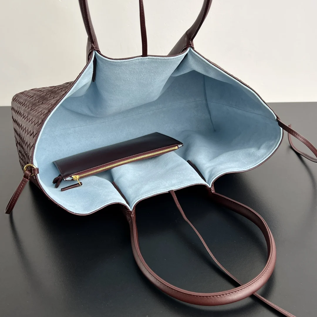 BV 2025 Early Spring Collection 817166 Pinacoteca Medium Tote Bag features classic Intrecciao woven calf leather on the front for understated luxury, and soft suede on the reverse for an effortlessly casual style. The spacious interior easily accommodates a laptop for commuting, and includes a detachable pouch for added security. The exquisite woven texture is irresistible, and most importantly, it s incredibly versatile. Get your new bag now! Size: 23*43*14.5cm
