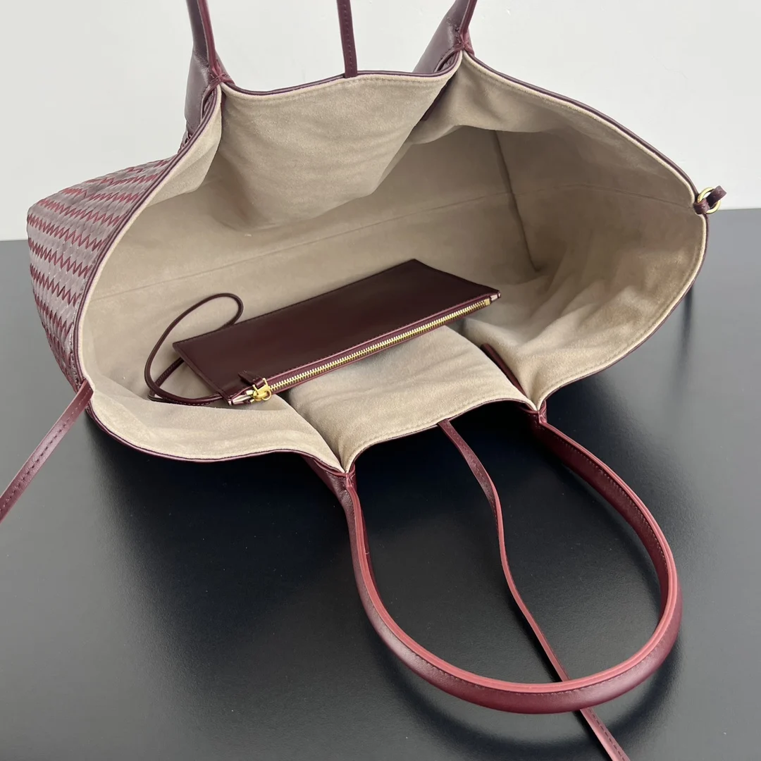 BV 2025 Early Spring Collection 817166 Pinacoteca Medium Tote Bag features classic Intrecciao woven calf leather on the front for understated luxury, and soft suede on the reverse for an instantly switchable, relaxed style. The spacious interior easily accommodates a laptop for commuting, and it also comes with a thoughtful, detachable pouch for added security. The woven texture is exquisitely detailed and irresistible. Most importantly, it s incredibly versatile. Come and get your new bag! Size: 23*43*14.5cm
