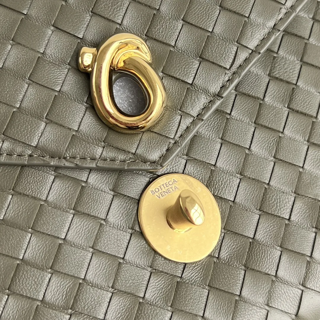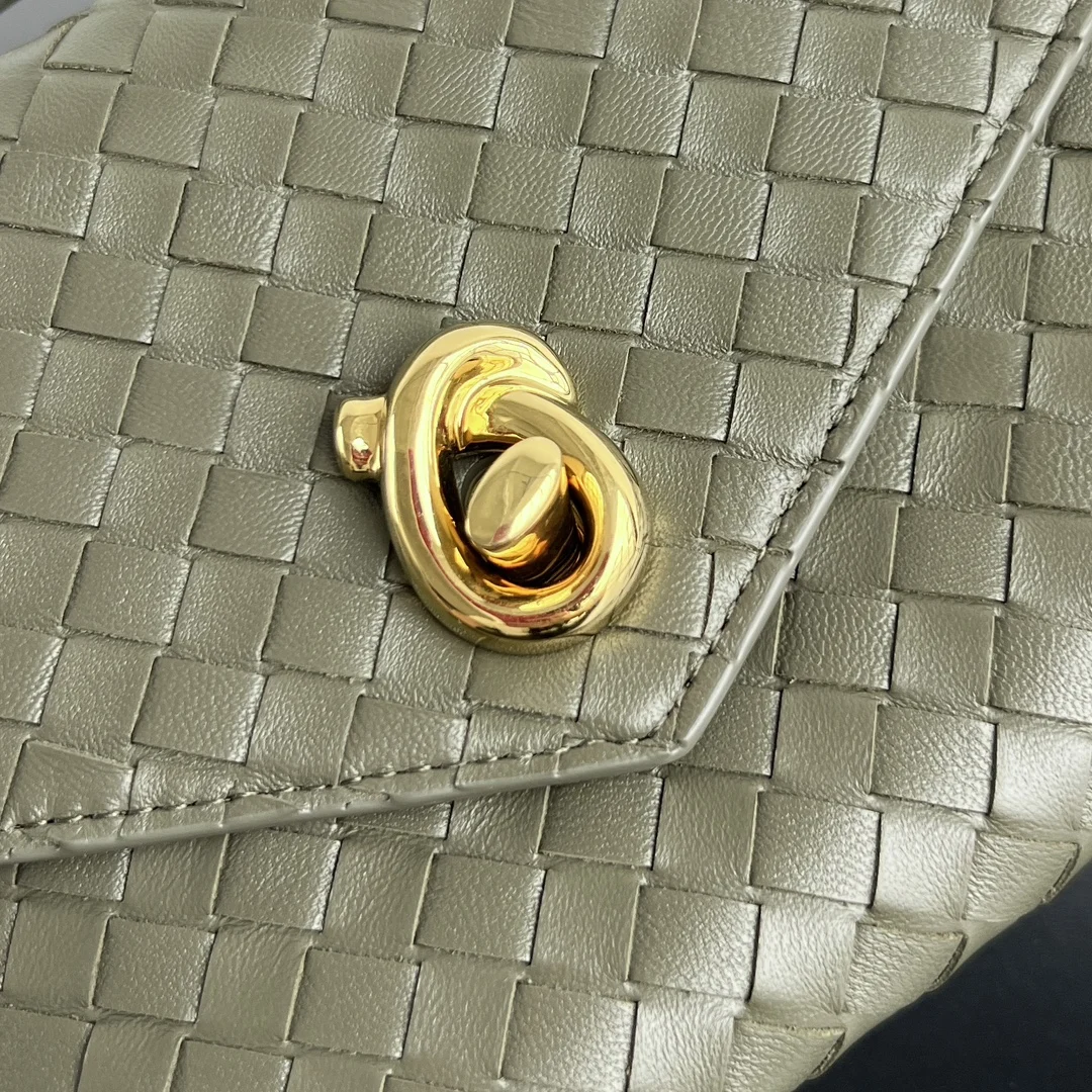 Bottega Veneta New Knot Lock Crossbody Bag 817191, Early Spring 2025 Kont Lock New Collection, Hot Launch. The brand s classic woven craftsmanship is paired with the exquisite and eye-catching Kont metal twist-lock button, a luxurious detail. It is elegant and sophisticated. The interior features double compartments card slots back compartment. Super functional with multiple carrying options. The shoulder strap is detachable, allowing for hand carry, shoulder carry, or crossbody wear. A retro and fashionable piece that effortlessly captures the refined vintage style. Dimensions: 25x16x5.5 cm.