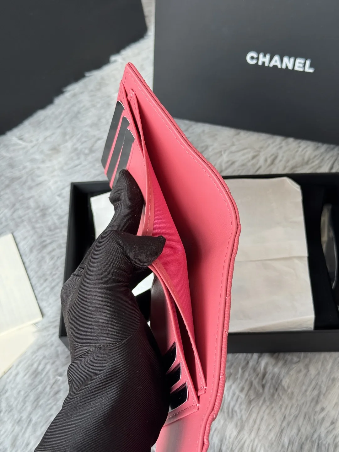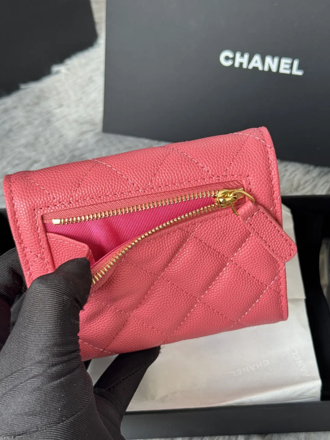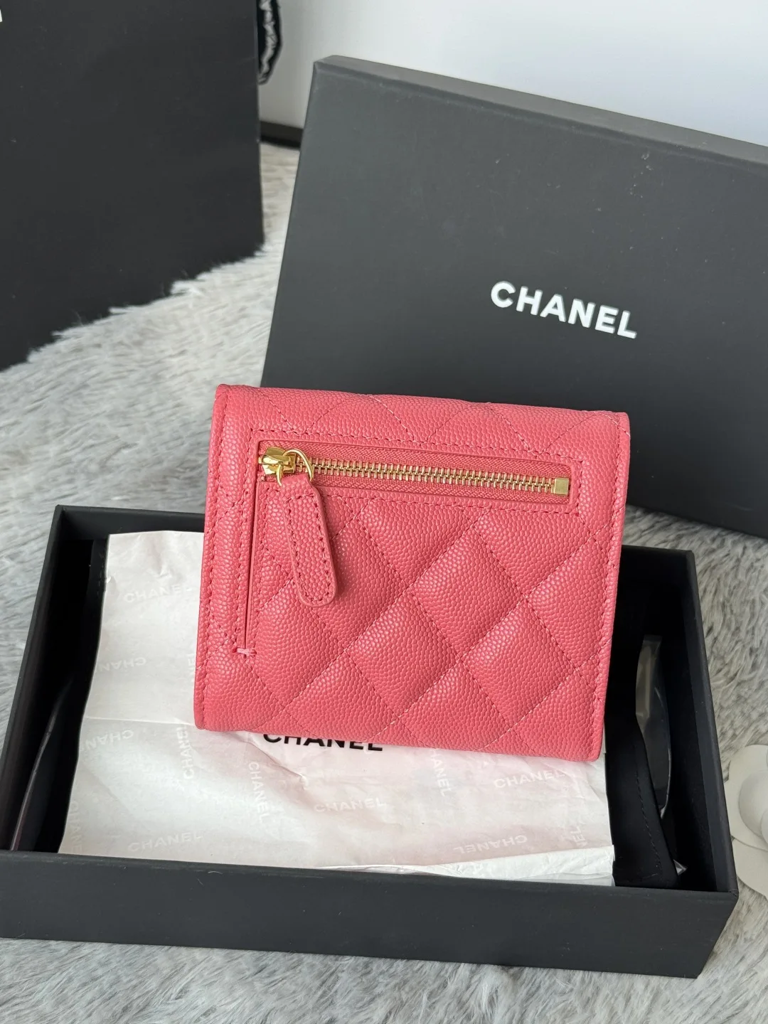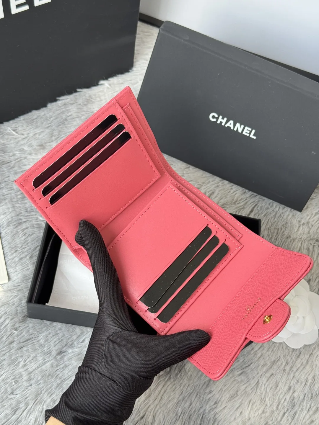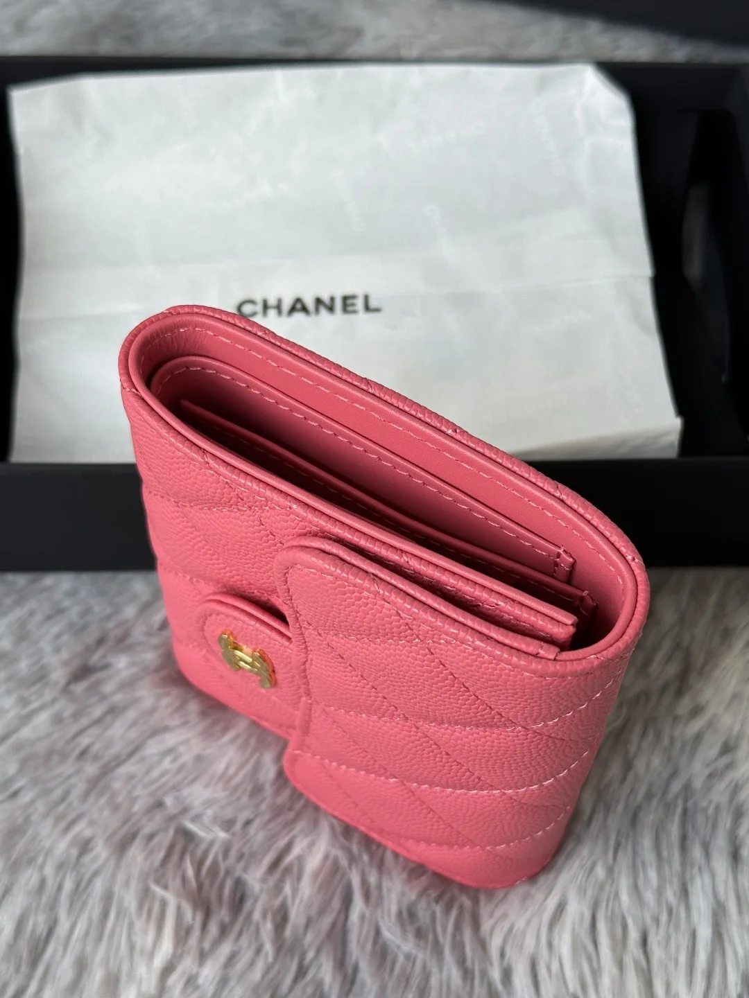 Calfskin Caviar Leather CF Small Flap Wallet is now in stock! This Chanel wallet features 6 card slots, a coin purse at the back, and easily fits 2000 RMB. The leather is delicate ..