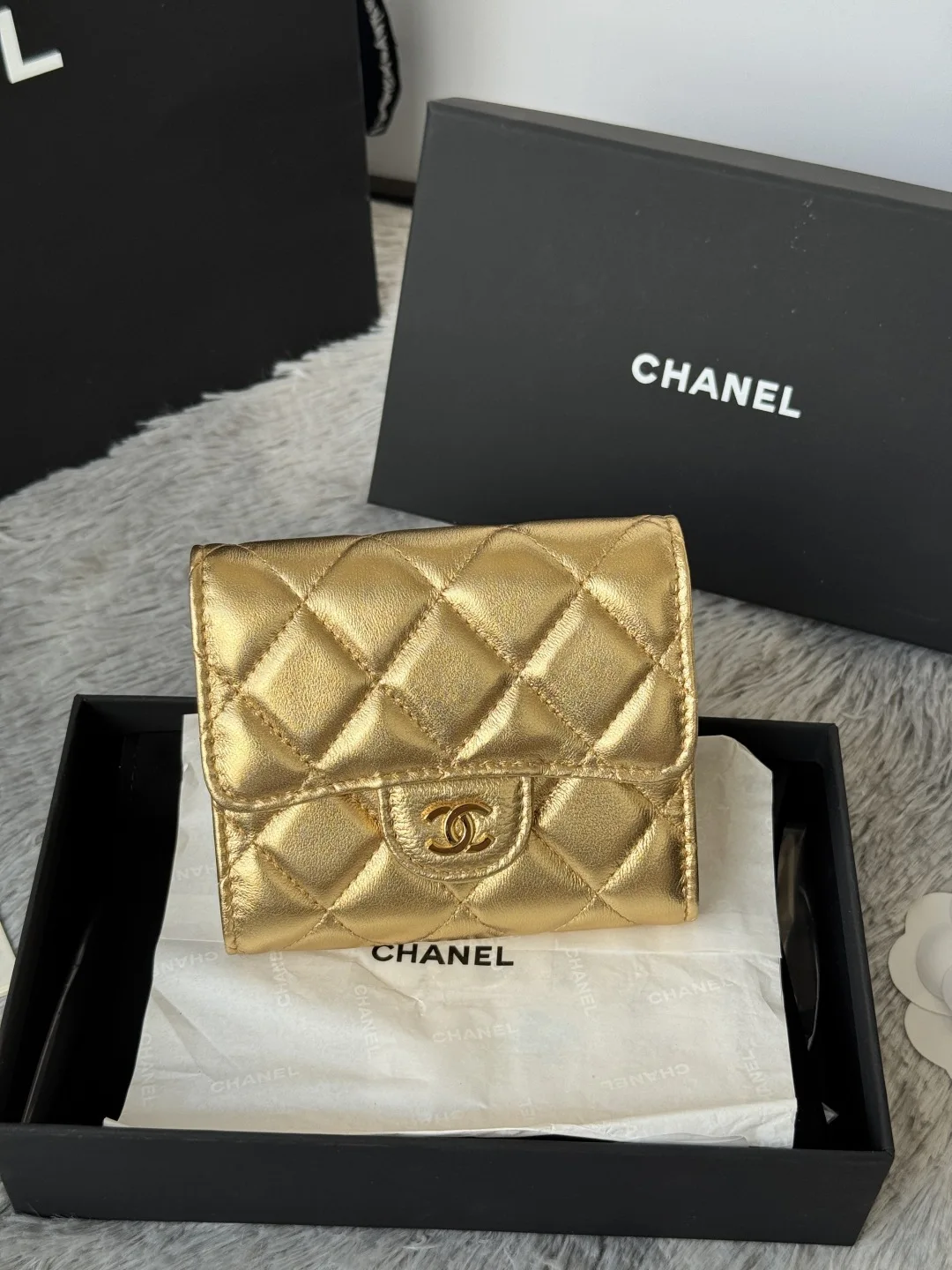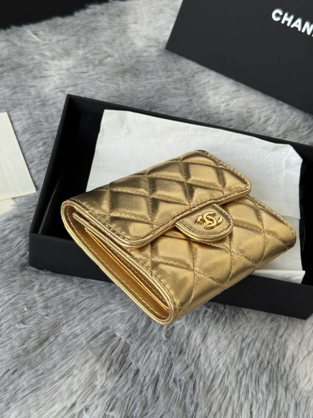Calfskin CF Tri-fold Wallet is here! Chanel has 6 card slots and a coin purse in the back. It can easily hold 2000 RMB! The leather is delicate and matched with gold hardware! It s..