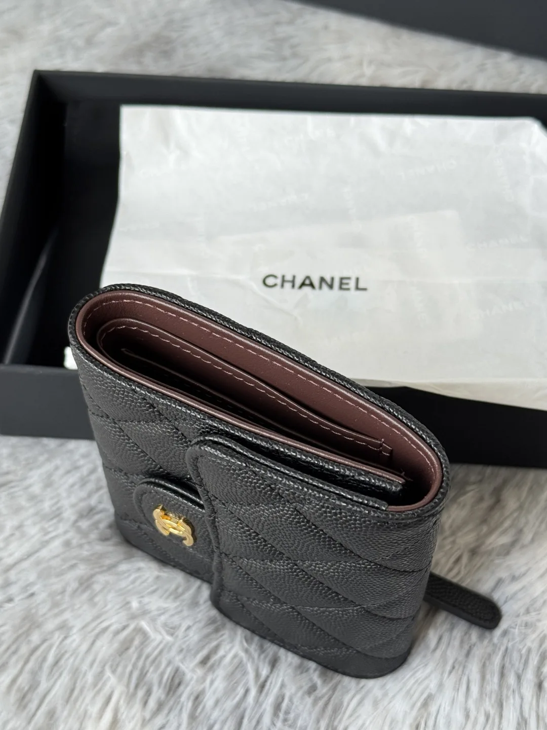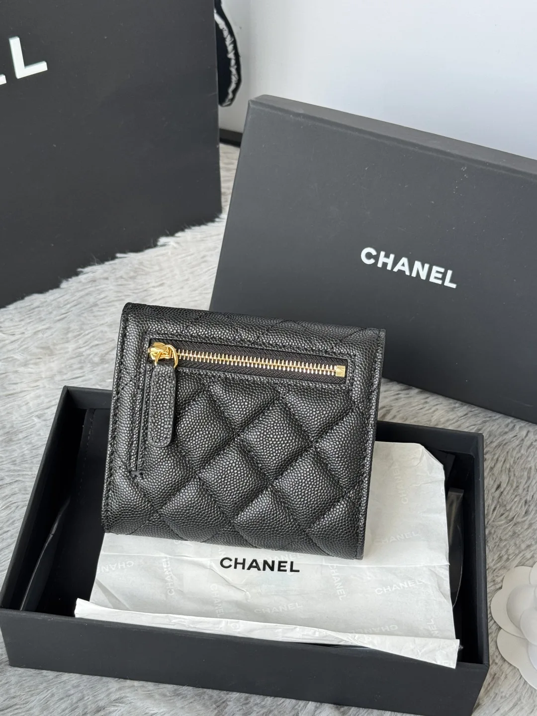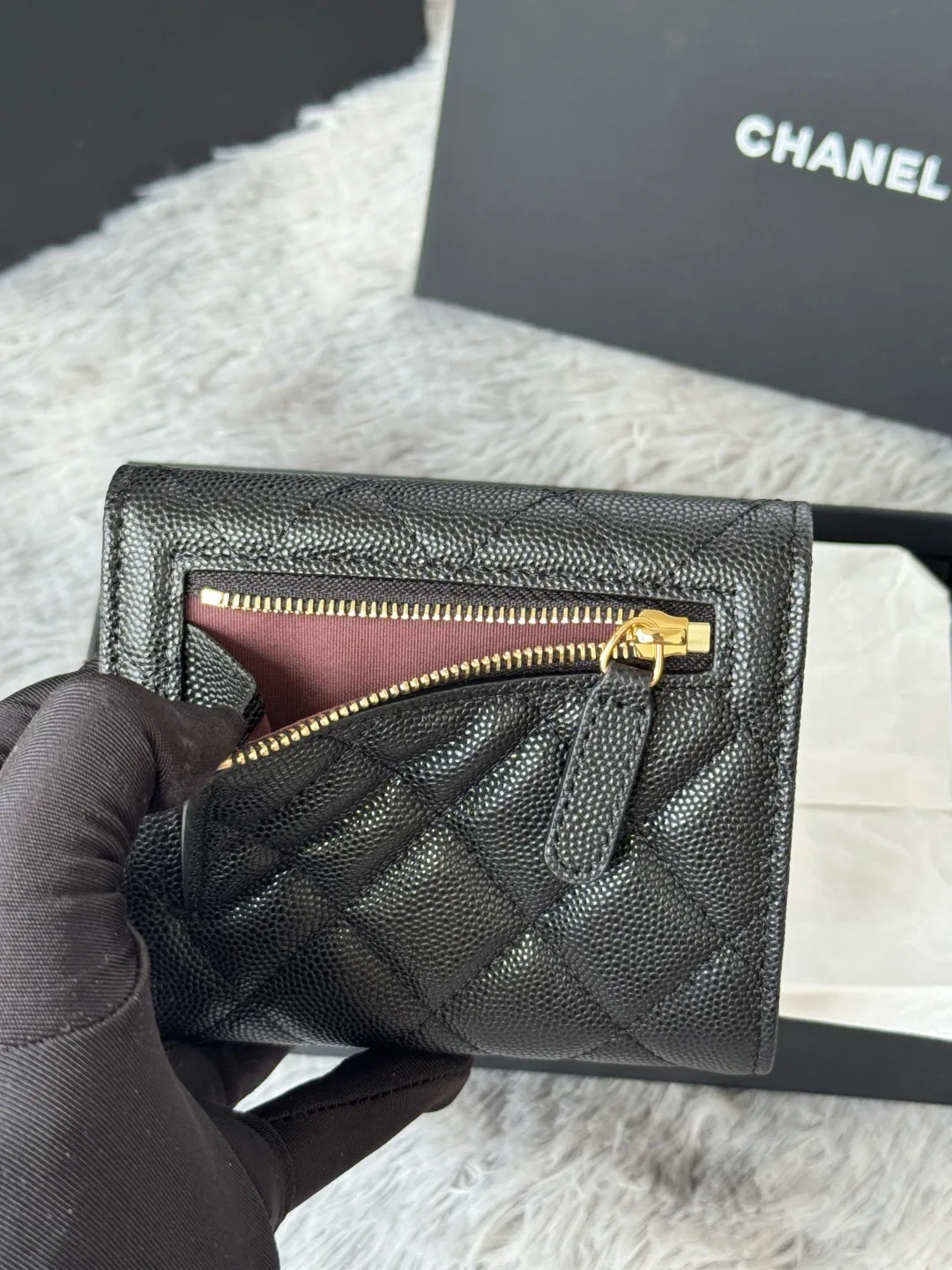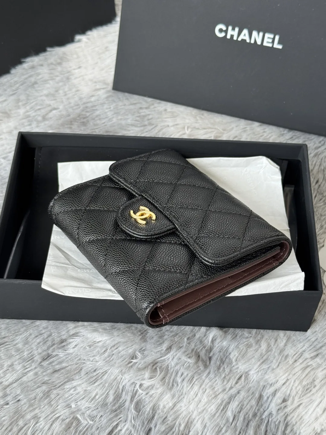 Calfskin Caviar Leather CF Trifold Wallet is now available! This Chanel wallet features 6 card slots, a back coin purse, and easily holds 2000 RMB. The delicate leather is paired w..