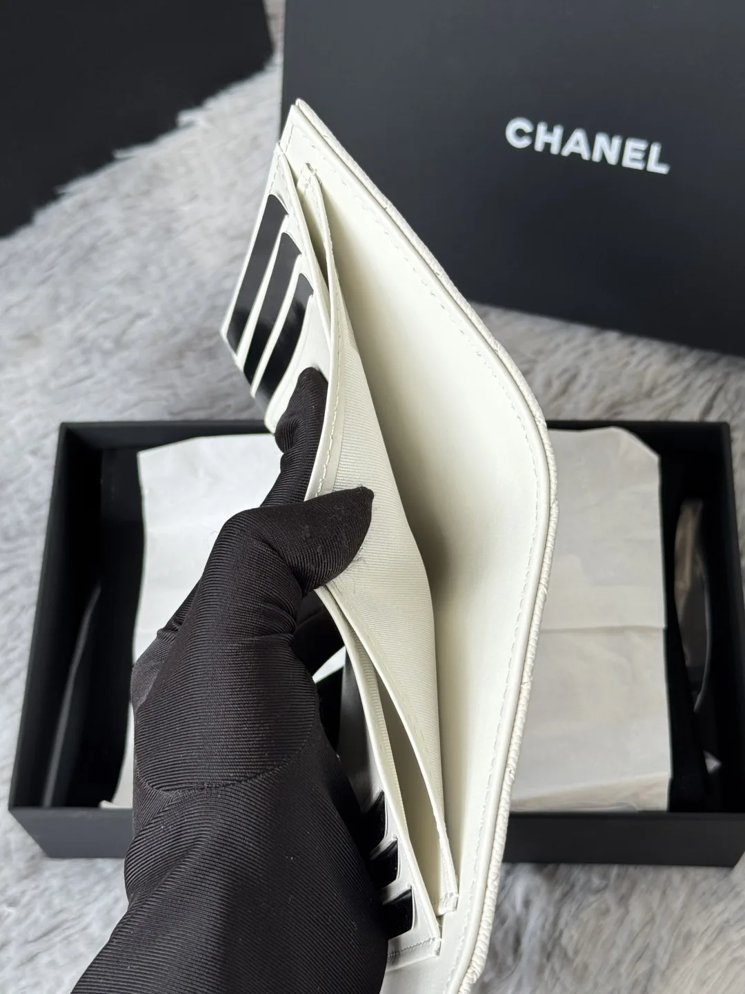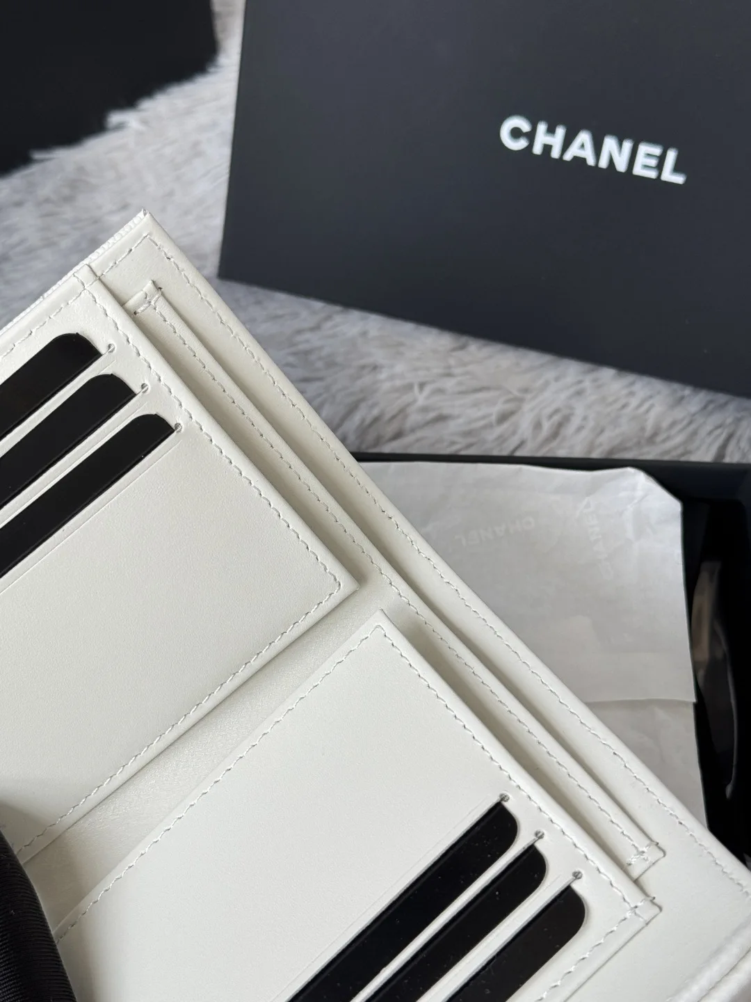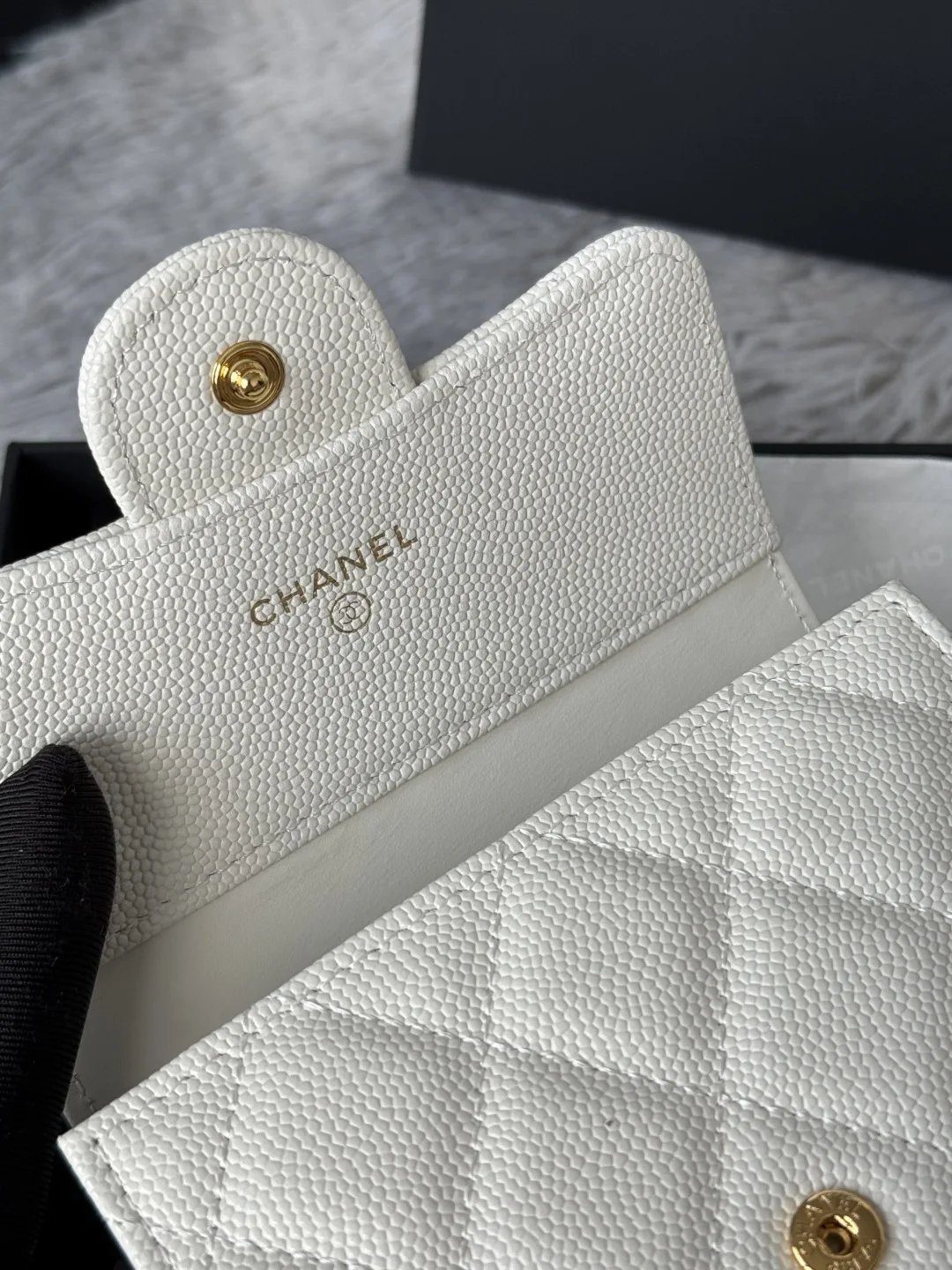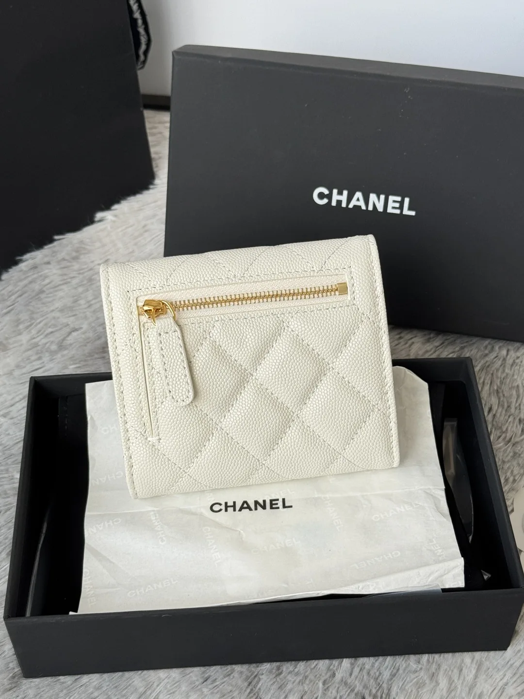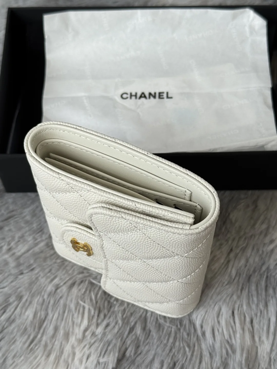The arrival of the CF short tri-fold wallet made of calfskin, caviar leather, and cowhide! It features six card slots for Chanel, a coin pocket at the back, and can easily hold 200..