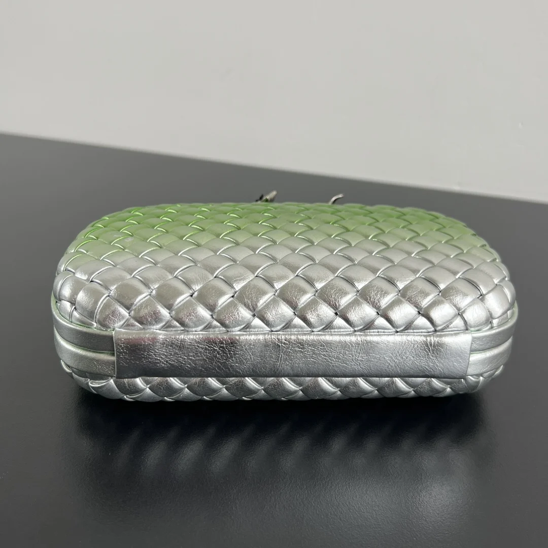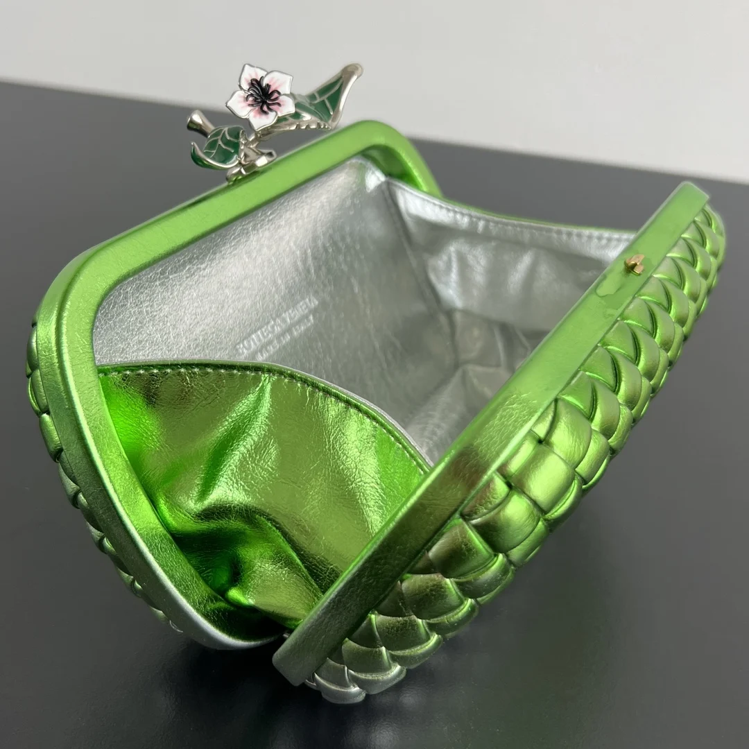 Bv Kont 826183 Green gradient leather with three-dimensional floral design Creates a romantic ambiance reminiscent of passing by a flower shop on the way home The opening features brass flowers and two green leaves , making it an exquisite evening bag akin to a work of art. The floral textures are clearly visible with a palpable relief, and a subtle luster shimmers in the sunlight. Every detail exudes sophistication and luxury Who could resist such a romantic and sweet design? Dimensions: 20x12x5.5
