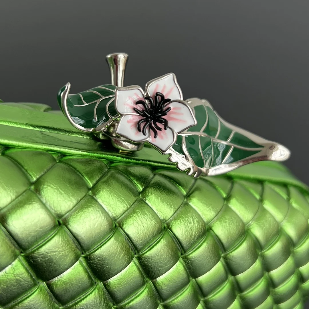 Bv Kont 826183 features green gradient leather with three-dimensional floral embellishments, evoking a romantic ambiance reminiscent of passing by a flower shop on the way home. The opening is adorned with brass flowers and two green leaves , making it a veritable work of art. The textures of the flowers are clearly visible , with a distinct tactile feel and a subtle sheen in the sunlight. Every detail exudes sophistication and refinement. Who could resist such a romantic and sweet design? Dimensions: 20x12x5.5