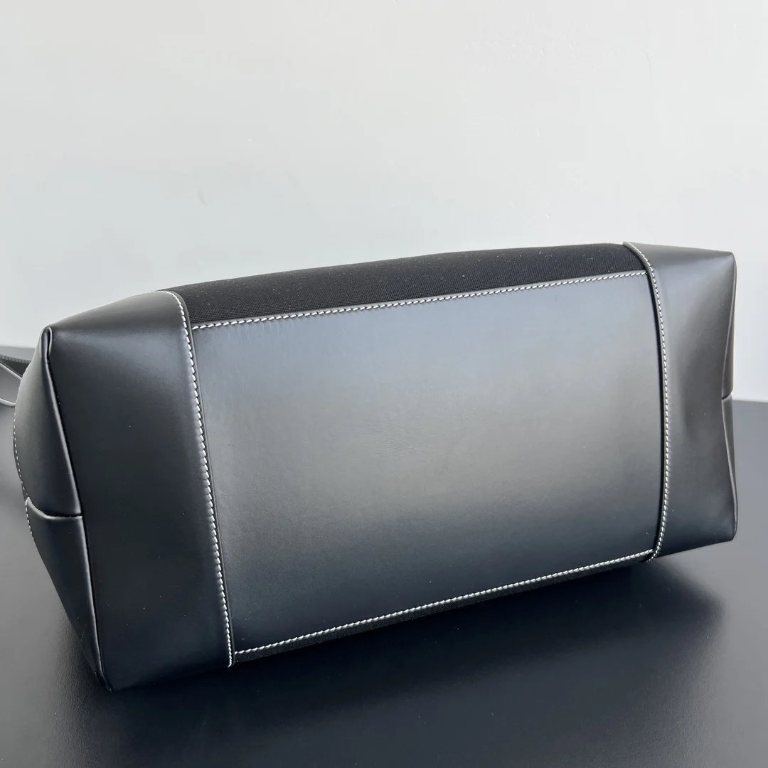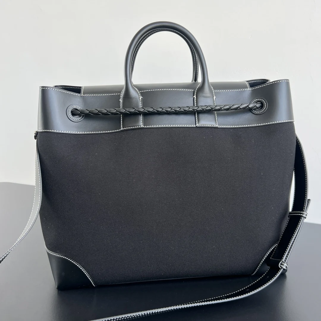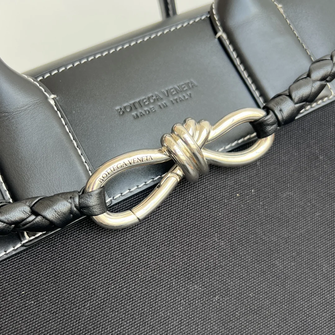 BV s new Andiamo unisex style 827066 features a black canvas and leather combination, offering a lightweight, practical, and fashionable option. The contrasting black canvas and stitched smooth leather on the upper part of the bag add a layered visual appeal. It is complemented by a sliding metal knot closure, revealing refined details in its simplicity. The spacious interior easily accommodates daily essentials and weekend travel needs. It pairs perfectly with both professional business attire and casual wear, creating a sophisticated and stylish look. Dimensions: 43*39*20.