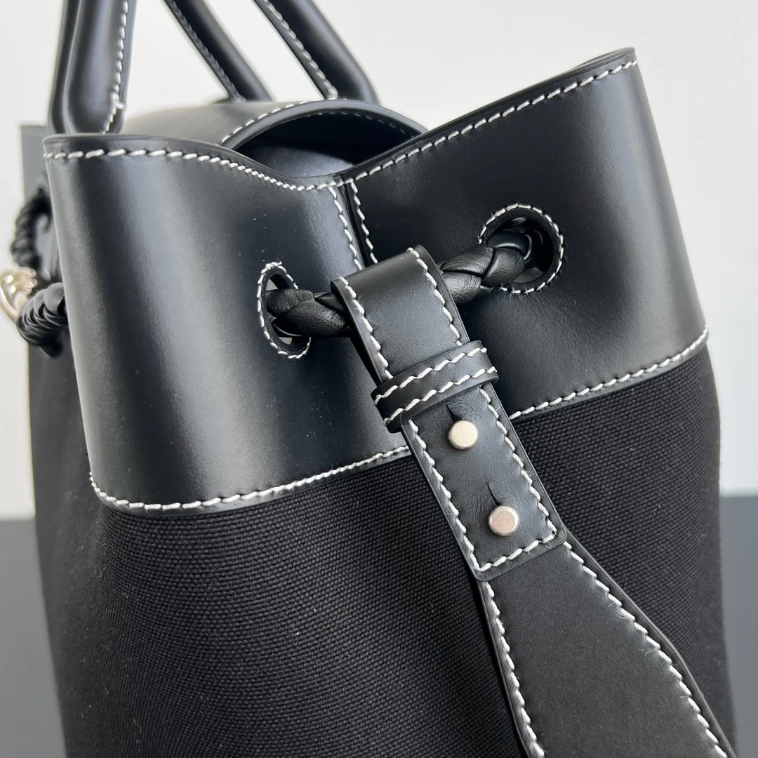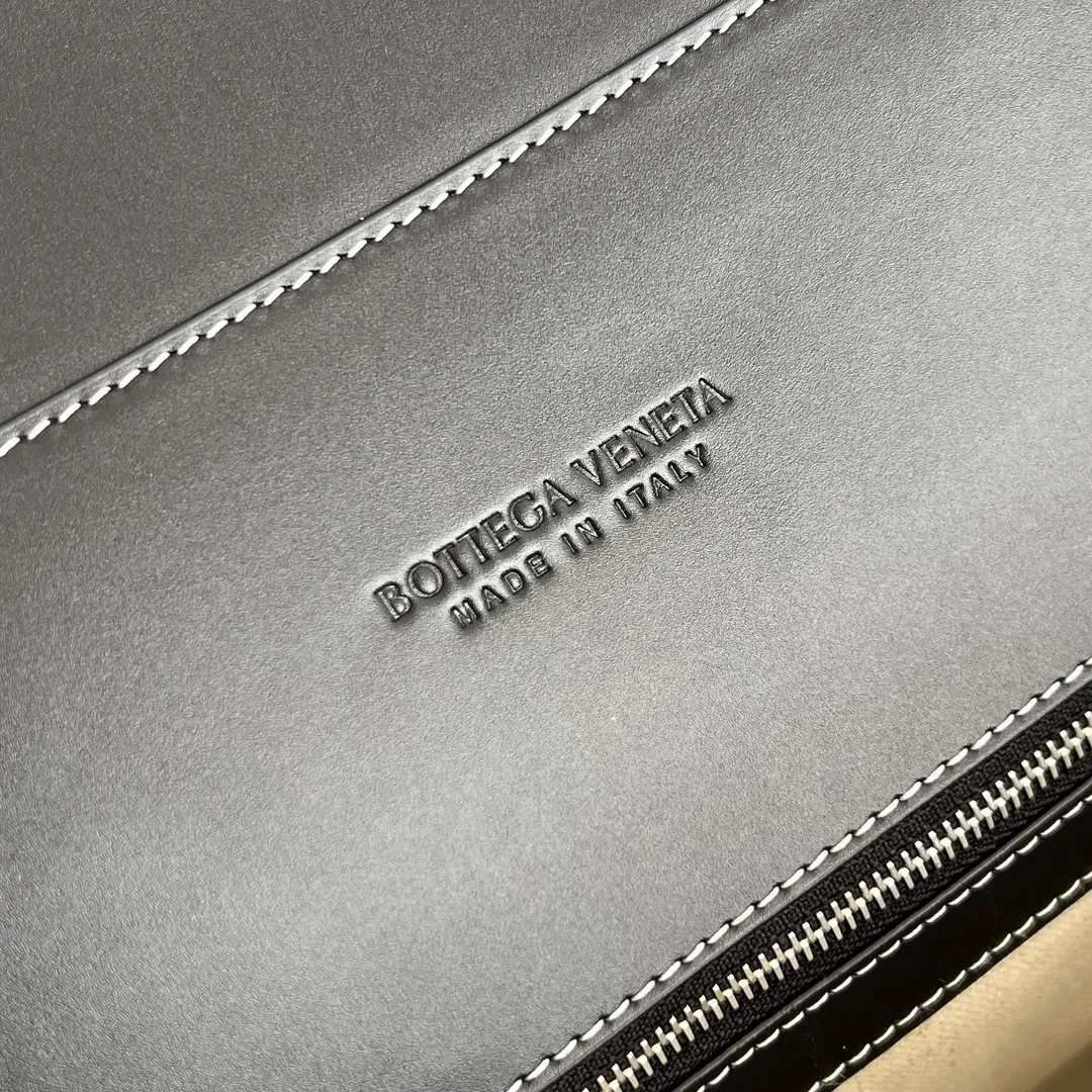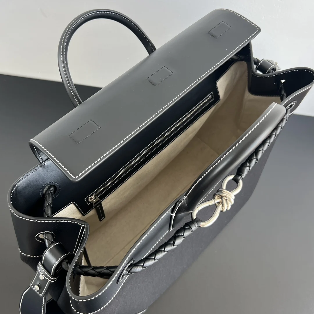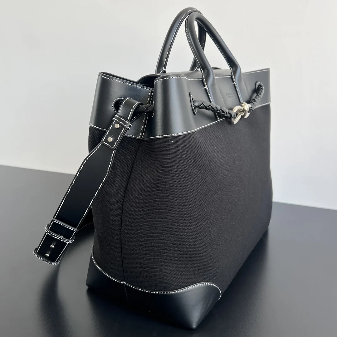 BV s new Andiamo unisex style 827066 features a black canvas and leather combination, offering a lightweight, practical, and fashionable option. The contrasting black canvas and stitched smooth leather on the upper part of the bag add a layered visual appeal. It is complemented by a sliding metal knot closure, revealing refined details in its simplicity. The spacious interior easily accommodates daily essentials and weekend travel needs. It pairs perfectly with both professional business attire and casual wear, creating a sophisticated and stylish look. Dimensions: 43*39*20.