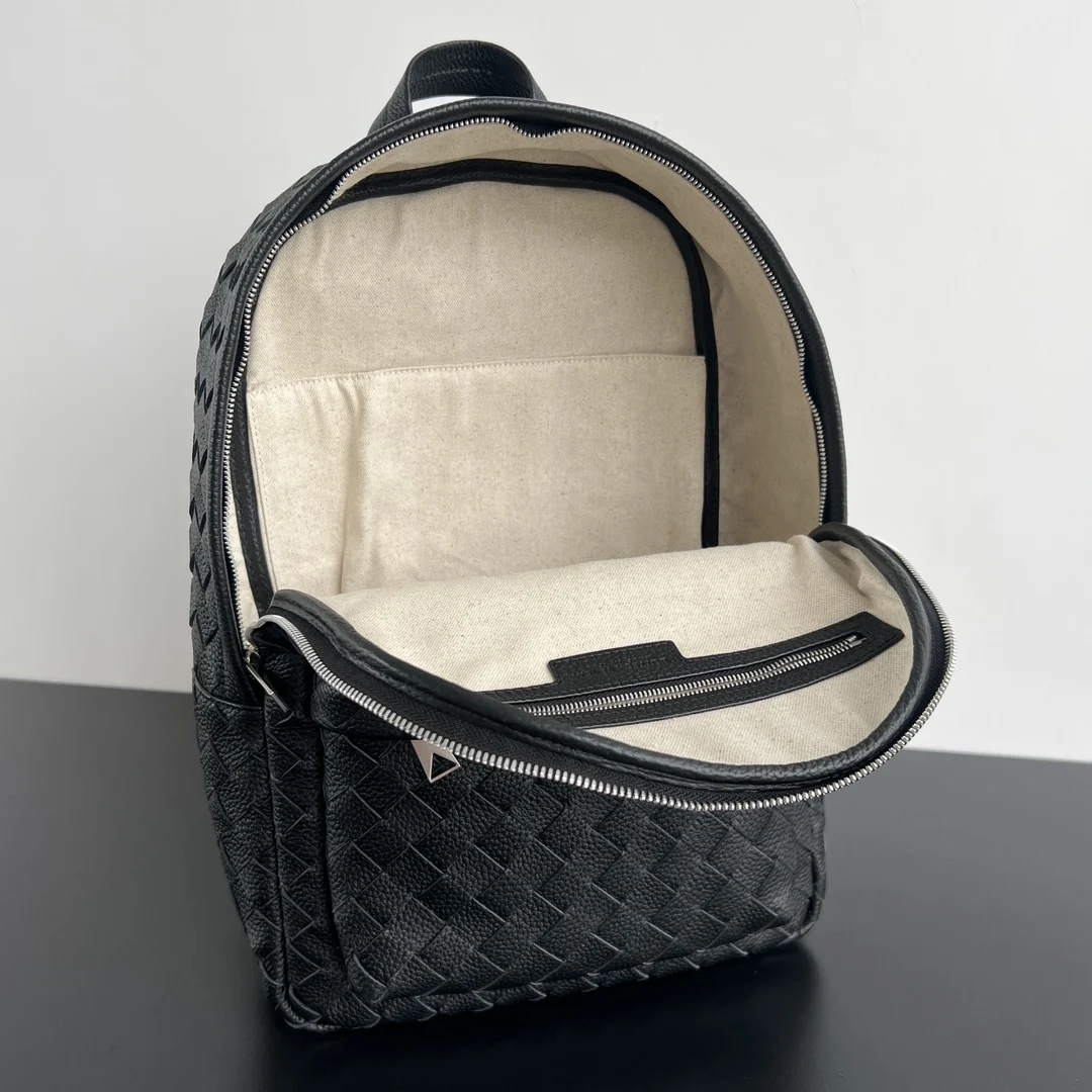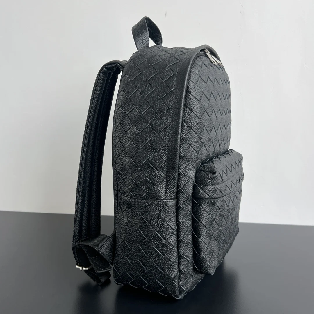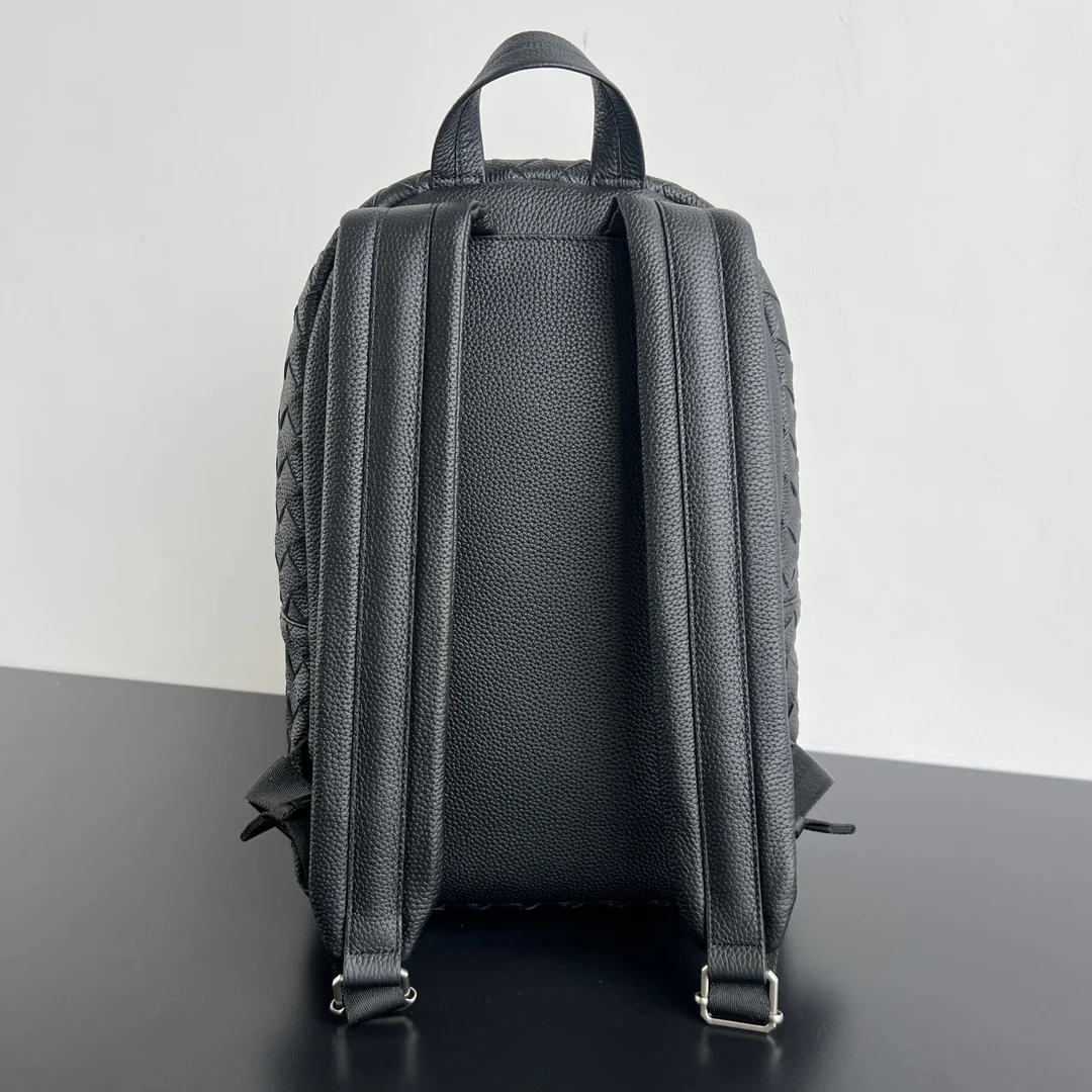 Bv s new men s grained backpack 833158 instantly elevates texture and class. Featuring classic woven craftsmanship, soft grained calfskin, durability, light weight, and large capacity, it s an essential travel backpack. It adopts a double-compartment design with zipper closures, and the main lining has a half-partition layer for organized laptop storage. The widened shoulder straps are adjustable and fit the back for maximum comfort. A must-have for sophisticated men on business trips, it s both versatile and cool. Dimensions: 46x30x14