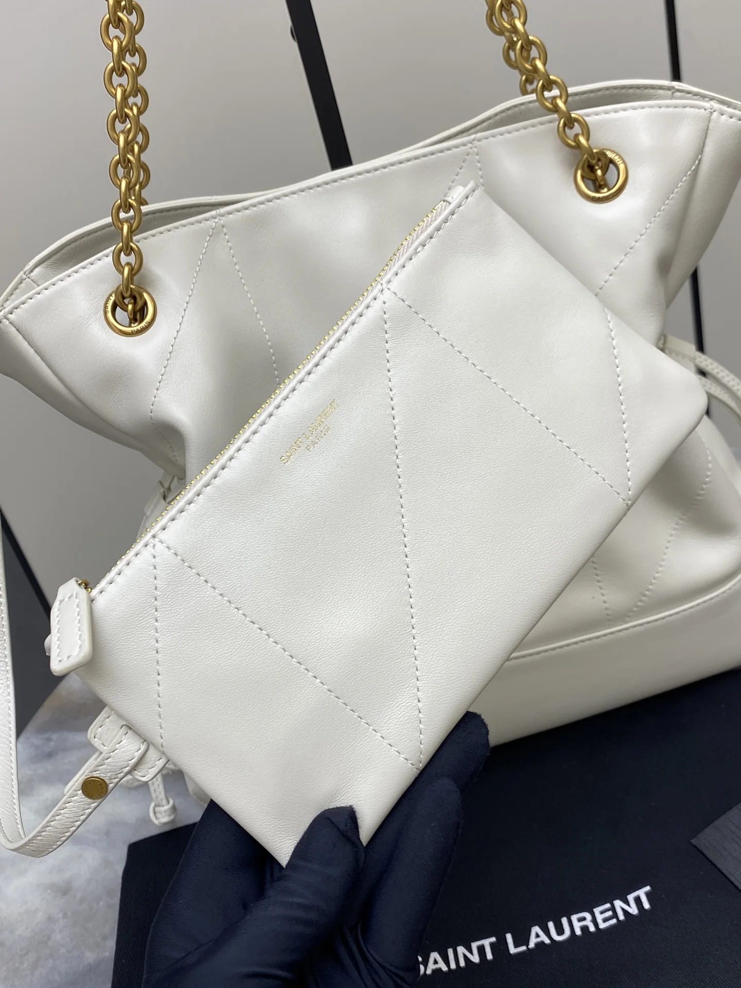 [Small Size] Lambskin with Gold Hardware YSL New Small Jamie 4.3 Large Pochon Lambskin Shoulder Bag. The designer really understands what consumers need. Many tote bag designs fail to combine aesthetics and practicality, but this tote does it! It s lightweight, has a large capacity, and is very elegant! It s a practical tote with an online design and a luxurious feel. I think it s even more beautiful than the 22bag! Can I say that? It s also a mommy bag that allows you to take care of your baby elegantly.