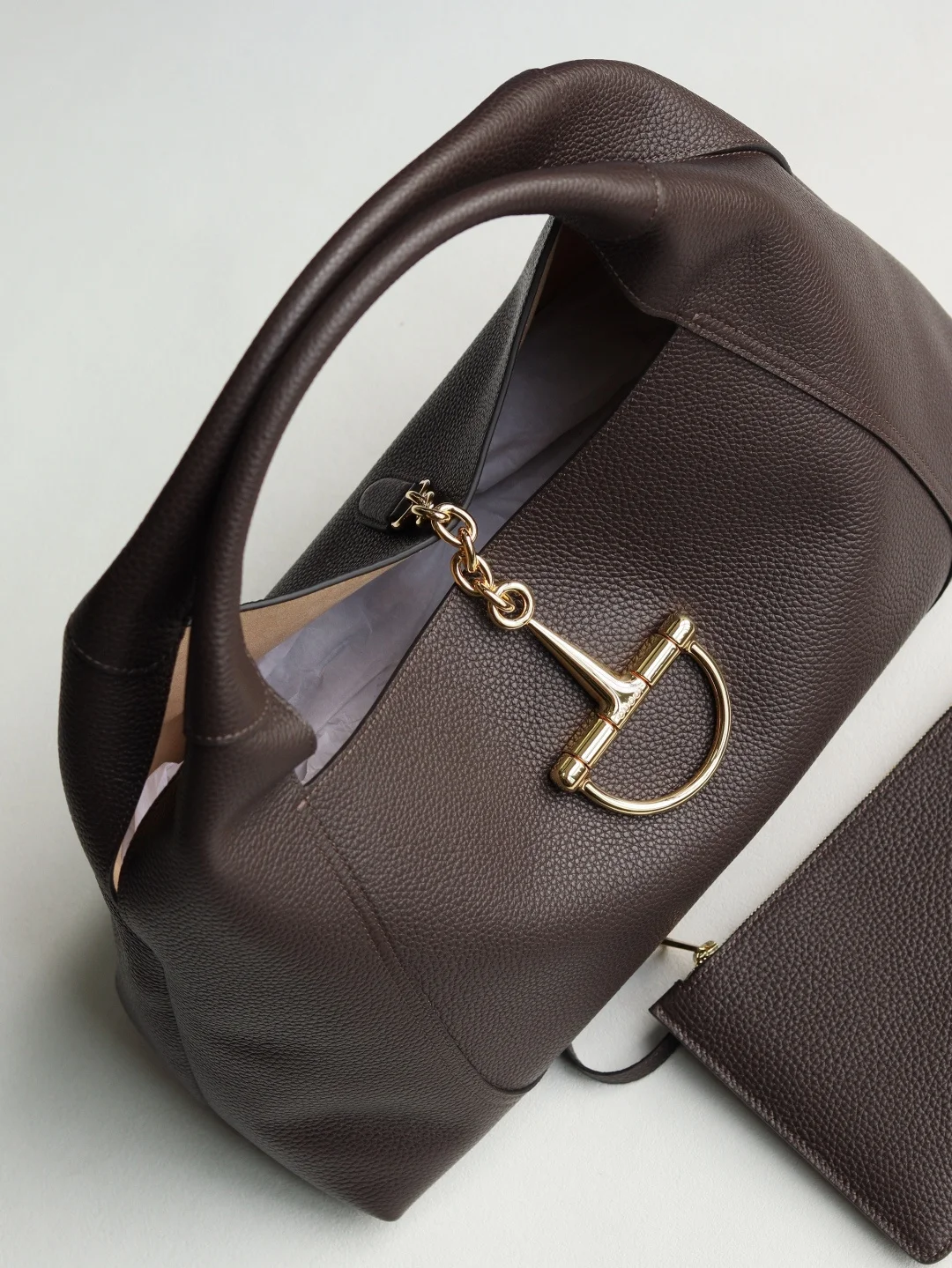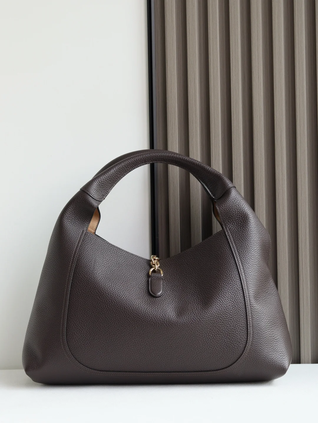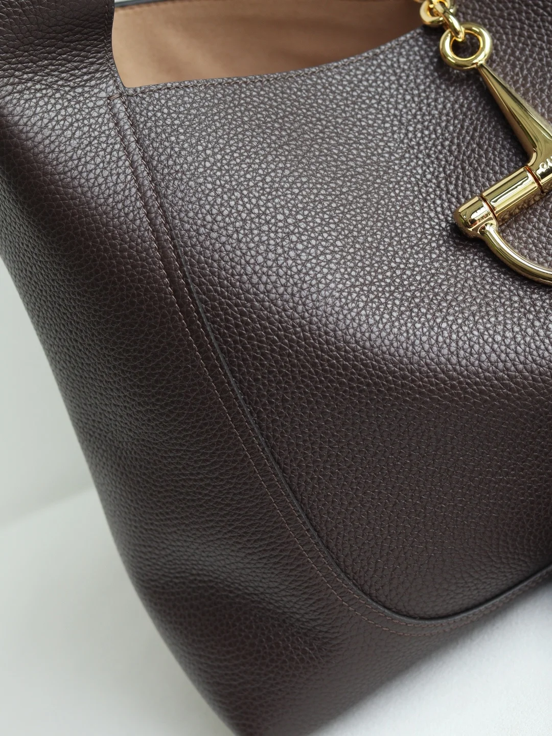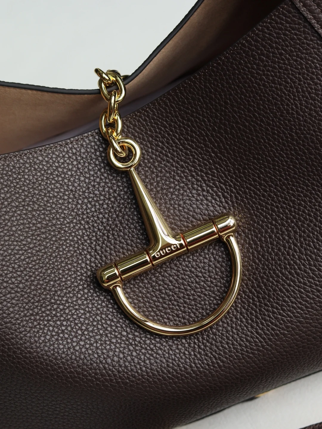 This Gucc Softbit shoulder bag artfully blends the brand s classic equestrian-style hardware with an oversized half Horsebit detail. This large shoulder bag comes with a detachable pouch.* Black grained leather* Light gold-toned hardware* Brown microfiber lining* Half Horsebit* Inside: Detachable pouch* Can fit an iPhone Pro Max Plus, AirPods, a long wallet, and a lipstick* Strap with 20cm drop* Magnetic closure* Model: 837466* Dimensions: 46cm (W) x 26cm (H) x 16cm (D)* Weight: Approximately 1.4 kg* Color: Dark Coffee Full Leather, Original Factory Leather* Made in Italy