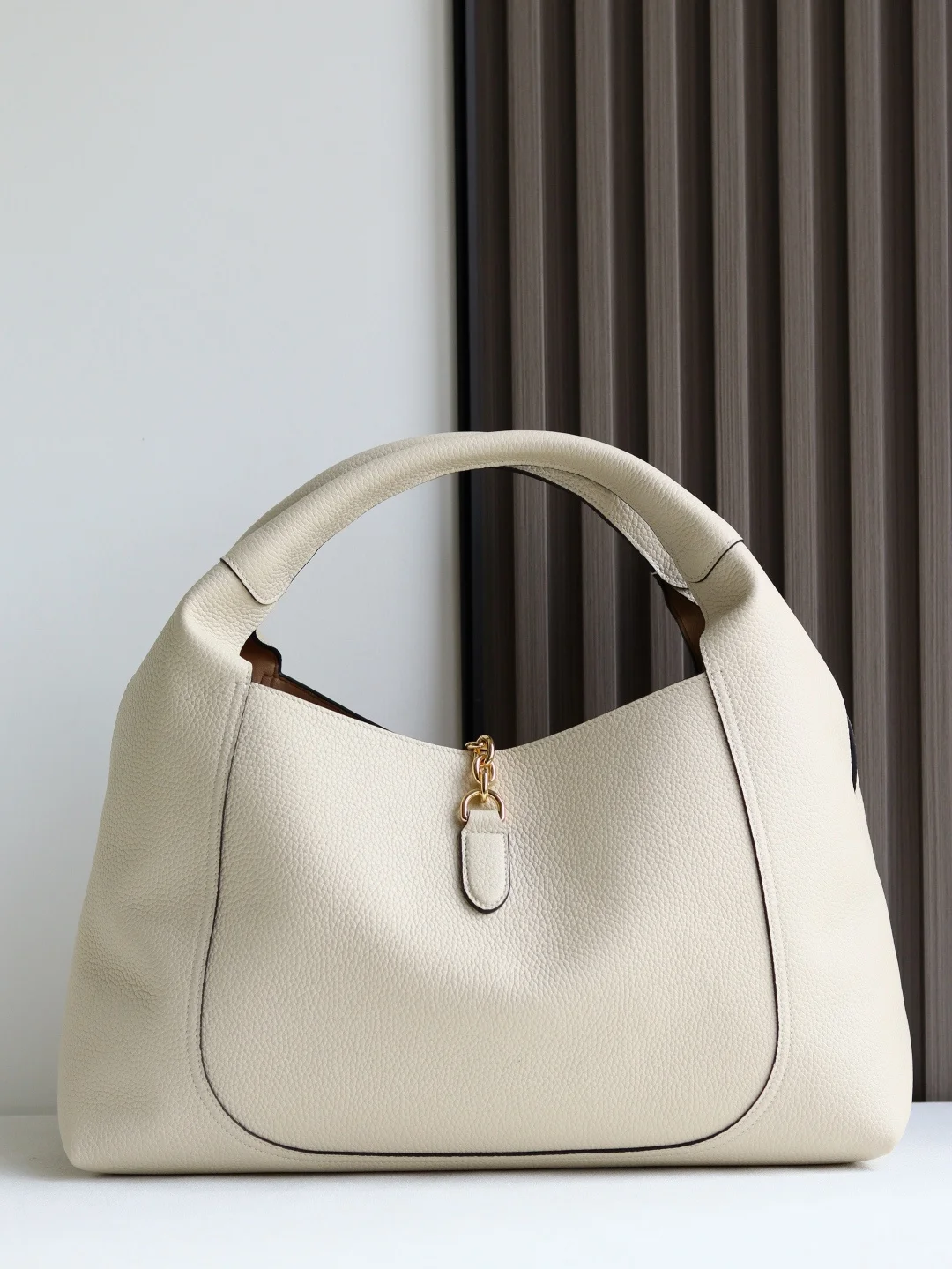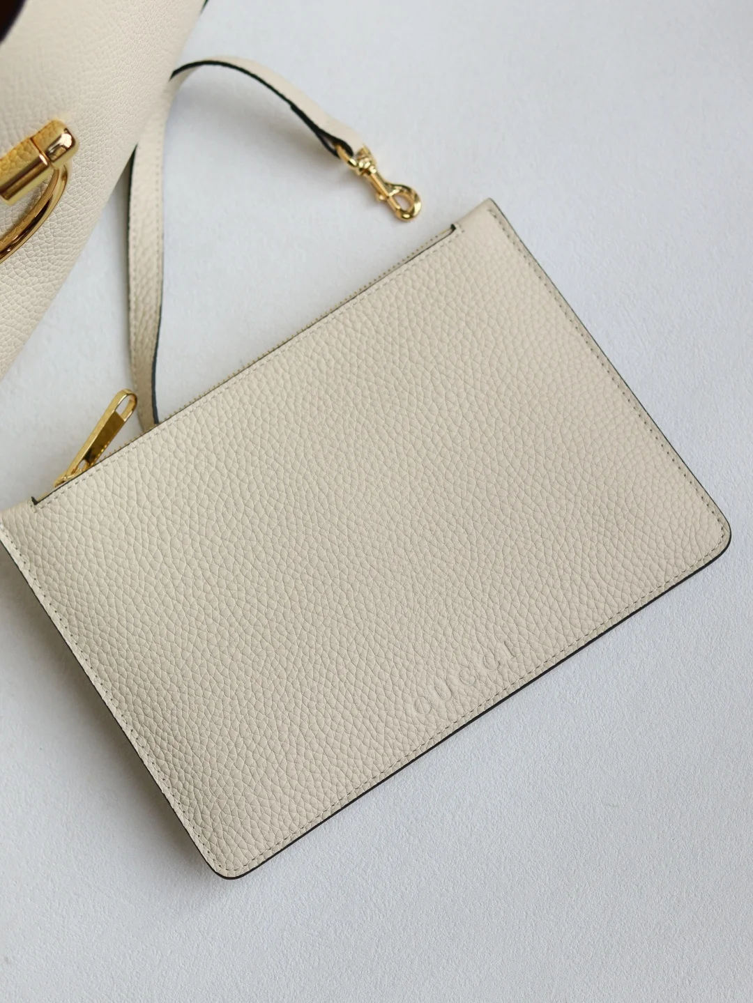 This Gucc Softbit shoulder bag artfully blends the brand s classic equestrian-style hardware with an oversized half Horsebit detail. This large shoulder bag features a detachable clutch.* Black grained leather* Light gold-toned hardware* Brown microfiber lining* Half Horsebit* Inside: Detachable clutch* Can fit an iPhone Pro Max Plus, Airpods, long wallet, and lipstick* Strap with 20cm drop* Magnetic closure* Model: 837466* Dimensions: 46cm (W) x 26cm (H) x 16cm (D)* Weight: Approximately 1.4kg* Color: White full leather, original factory leather* Made in Italy