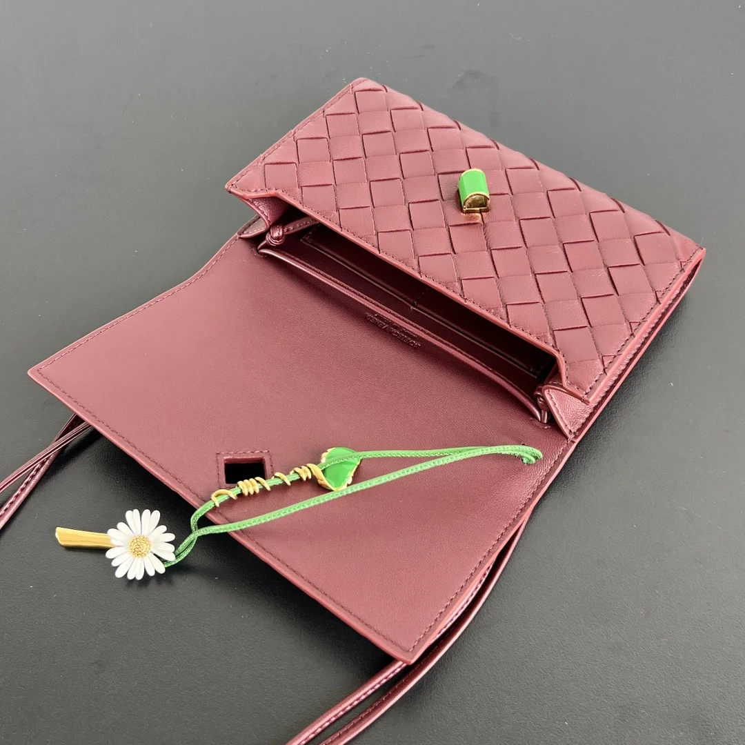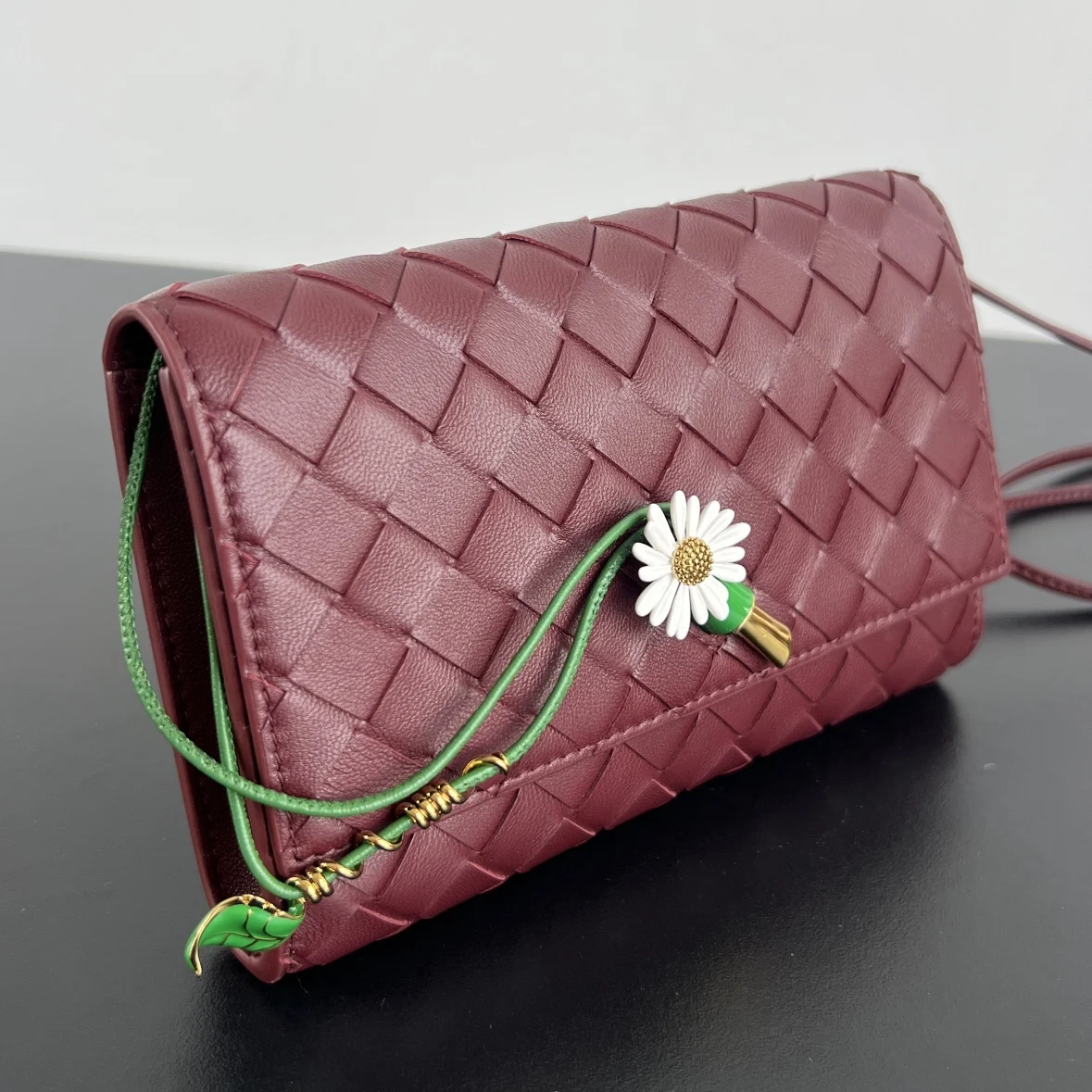 BV New Andiamo Crossbody Bag with Daisy, 838870. This exquisite and playful envelope crossbody bag is adorned with a blooming daisy, exuding vitality. Crafted with limited-edition craftsmanship and woven lambskin, the closure features a daisy instead of a traditional clasp, a romantic and subtle detail. Functionality and aesthetics are perfectly synchronized, accommodating daily essentials while embodying an elegant and relaxed style. Carry it with you and let every step feel like a stroll through a spring garden. Dimensions: 19x13x2 cm.