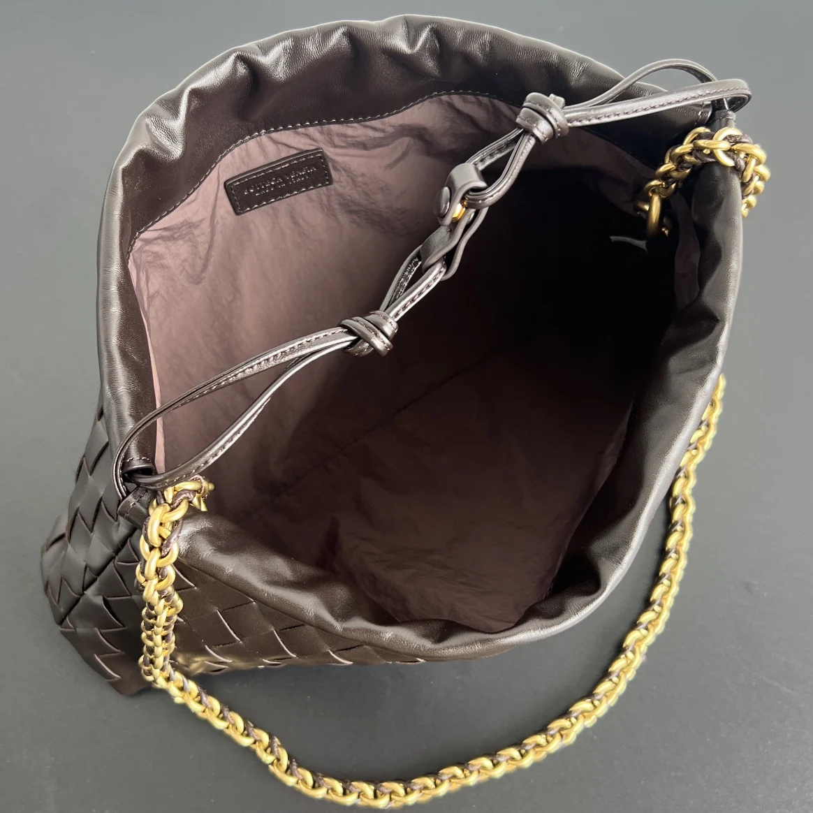 BV s new Dustbag chain bag 839394 The super popular Dustbag is now available with a chain strap The leather-woven chain design is not only more practical, but also unlocks mo..