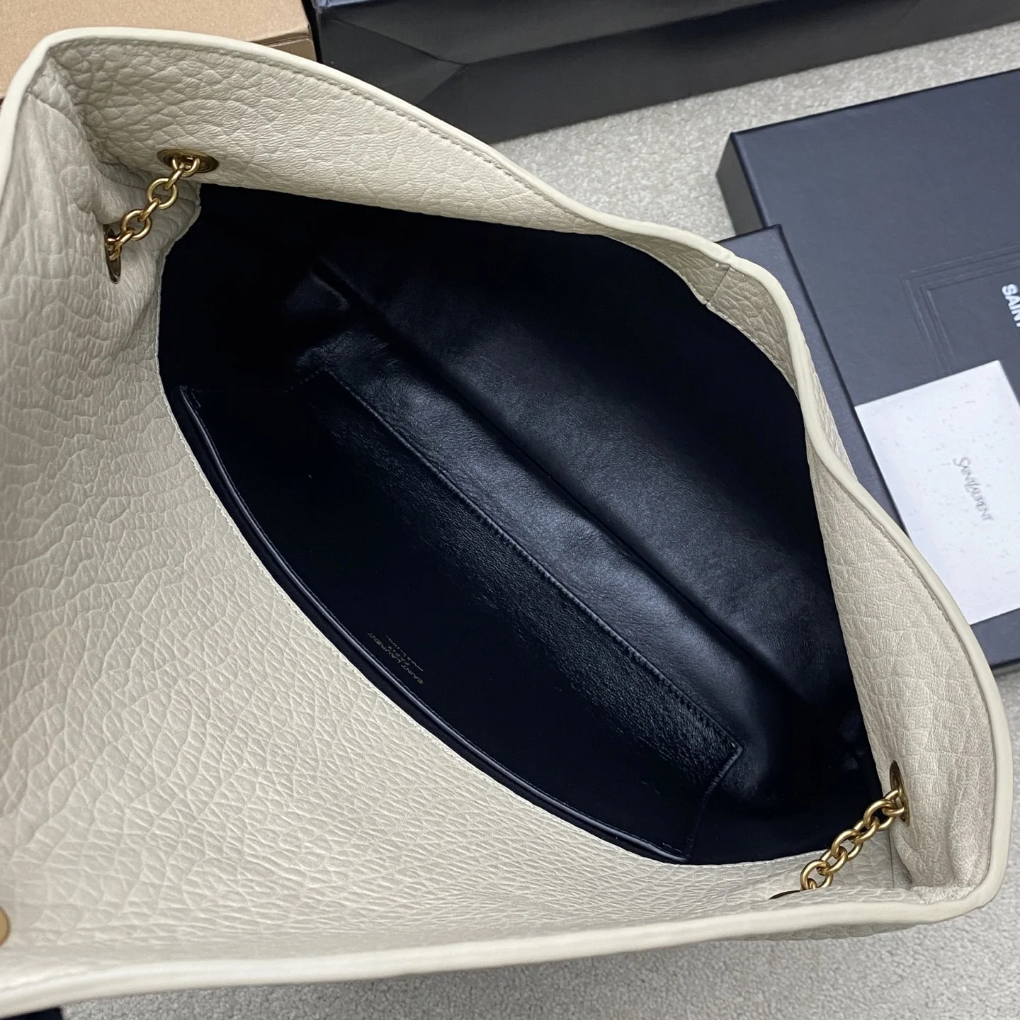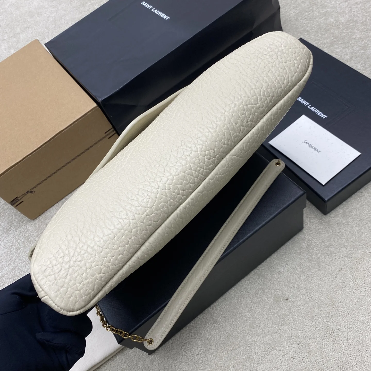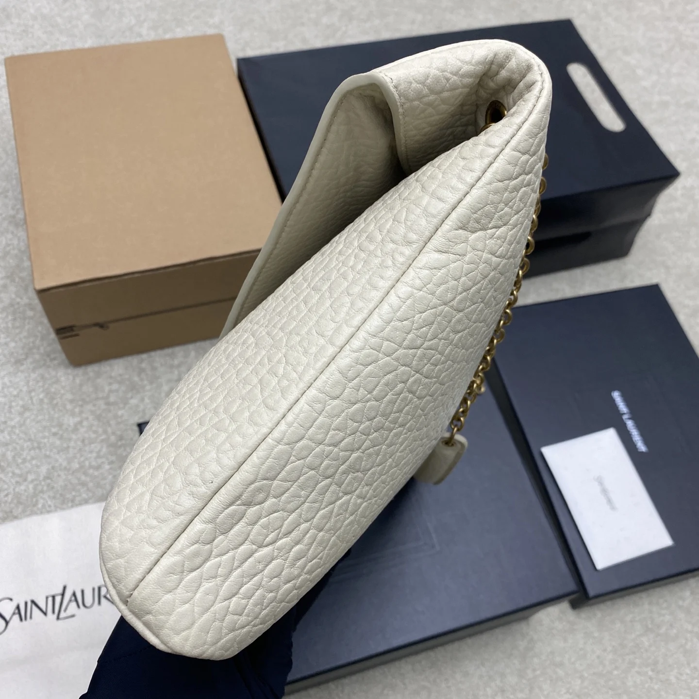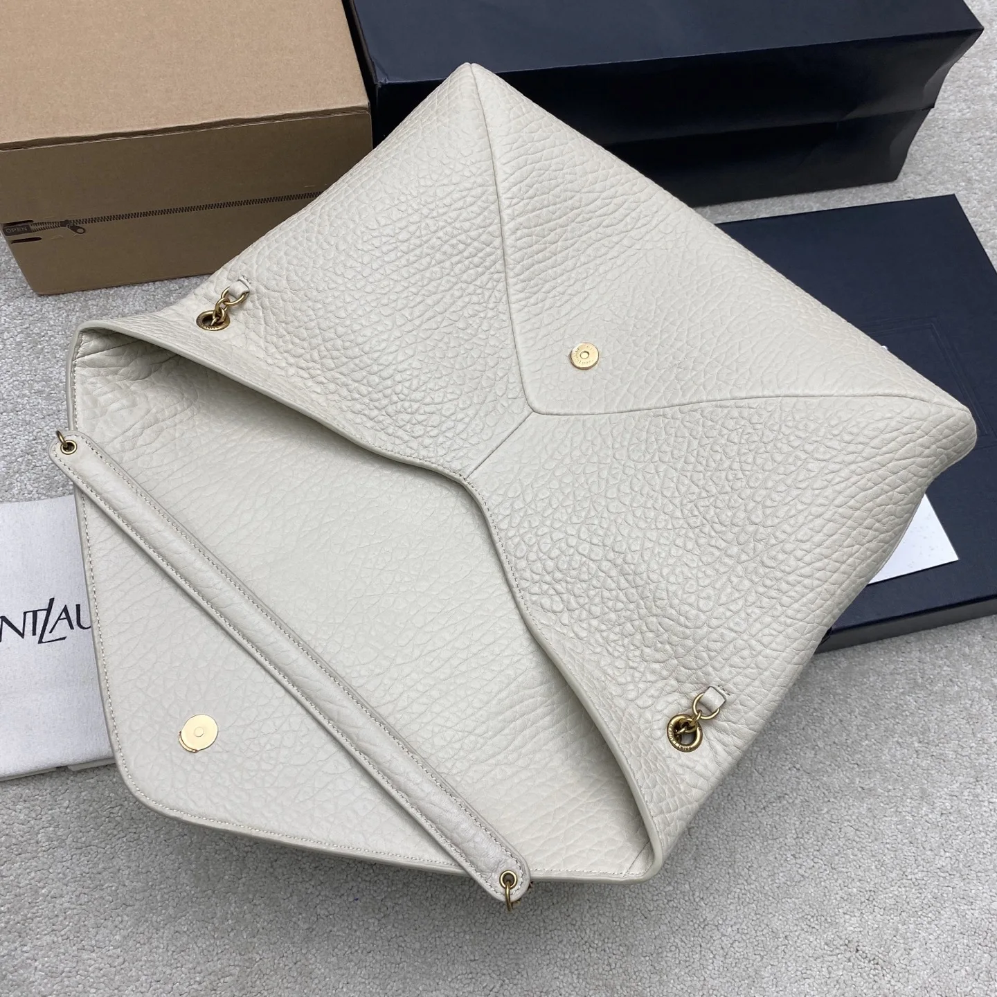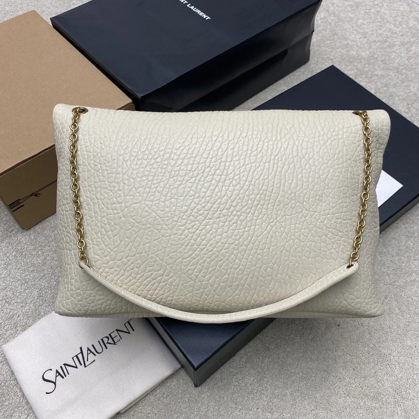 The new creamy white elephant-patterned gold YSL envelope oversized bag is here! Made of grained lambskin with a rich texture! This bag has a very urban style, and the shoulder bag style is very fashionable. The bag has a good amount of space!
