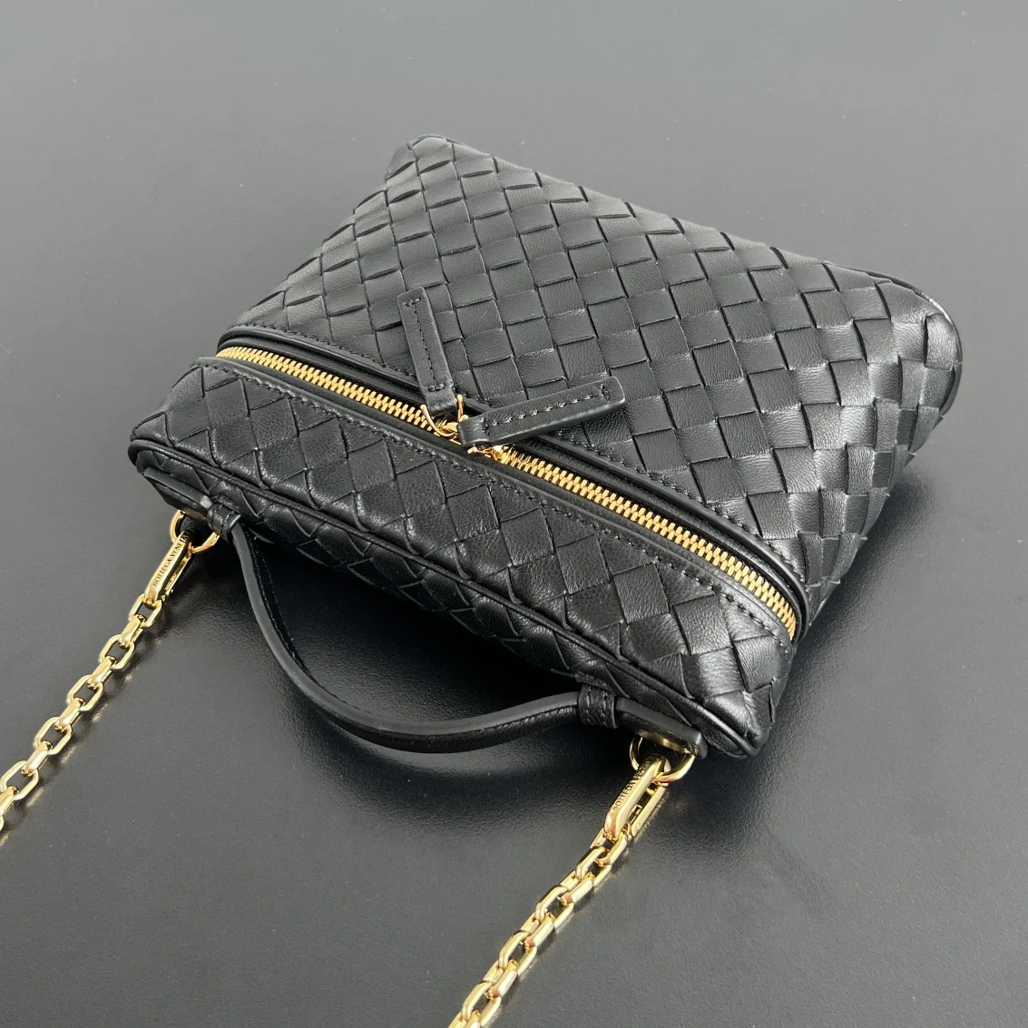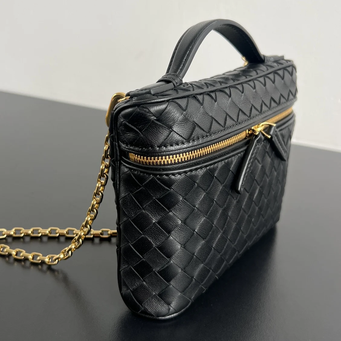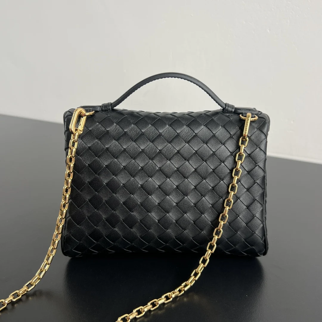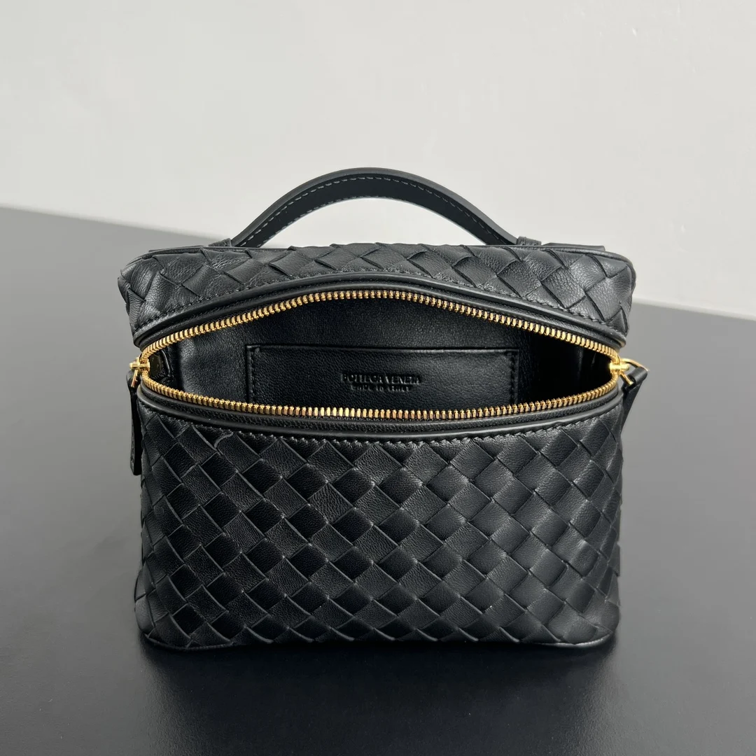 BV Soft Vanity chain makeup bag 843800, crafted with 0.75 lambskin Intrecciato weave. A timeless classic, this structured yet soft-contoured bag balances fashion and practicality. The detachable chain strap allows for crossbody or hand carry, complementing various outfits and adding a touch of elegance to your early autumn looks, whether for business commutes or casual, vintage-inspired styles. Dimensions: 19x14x3.