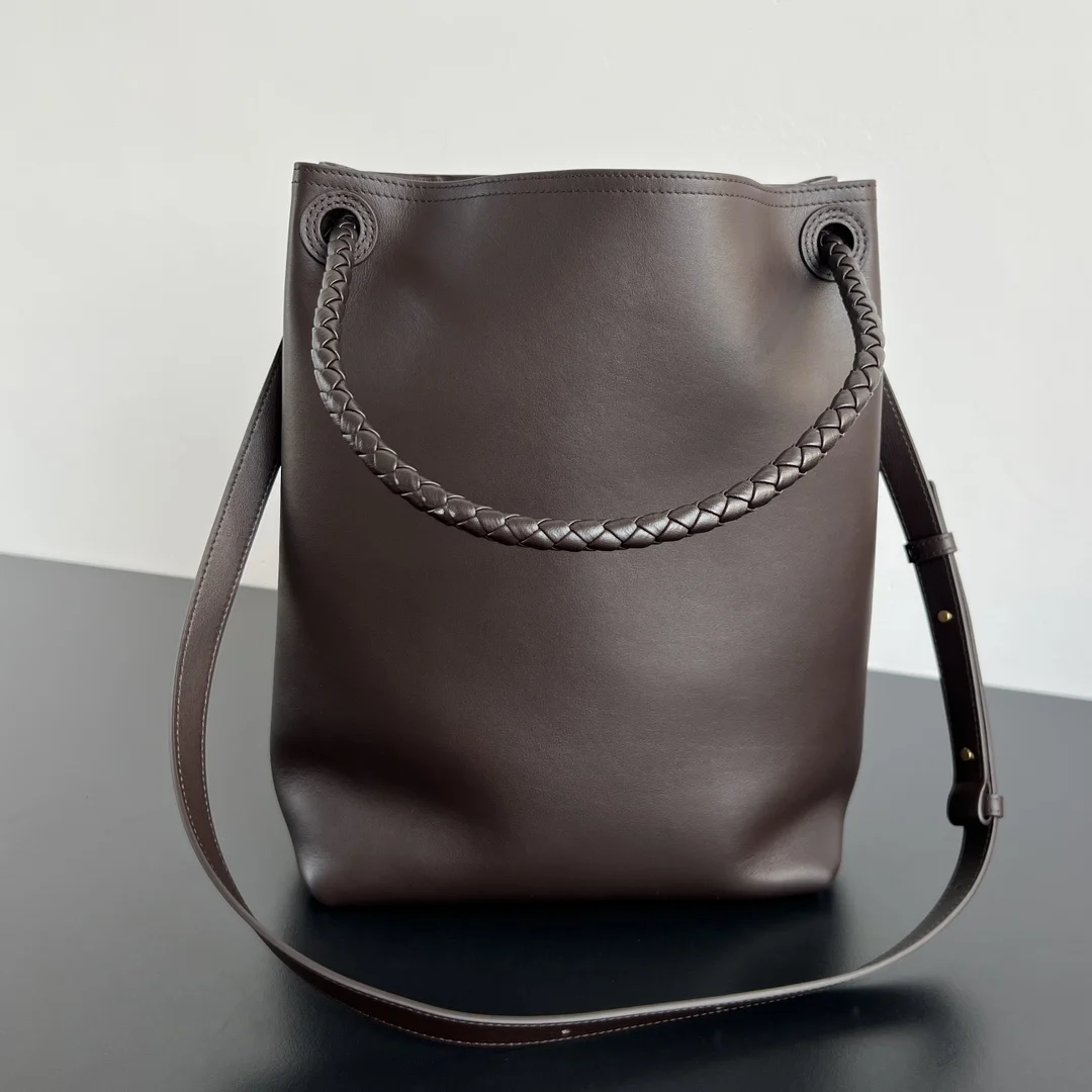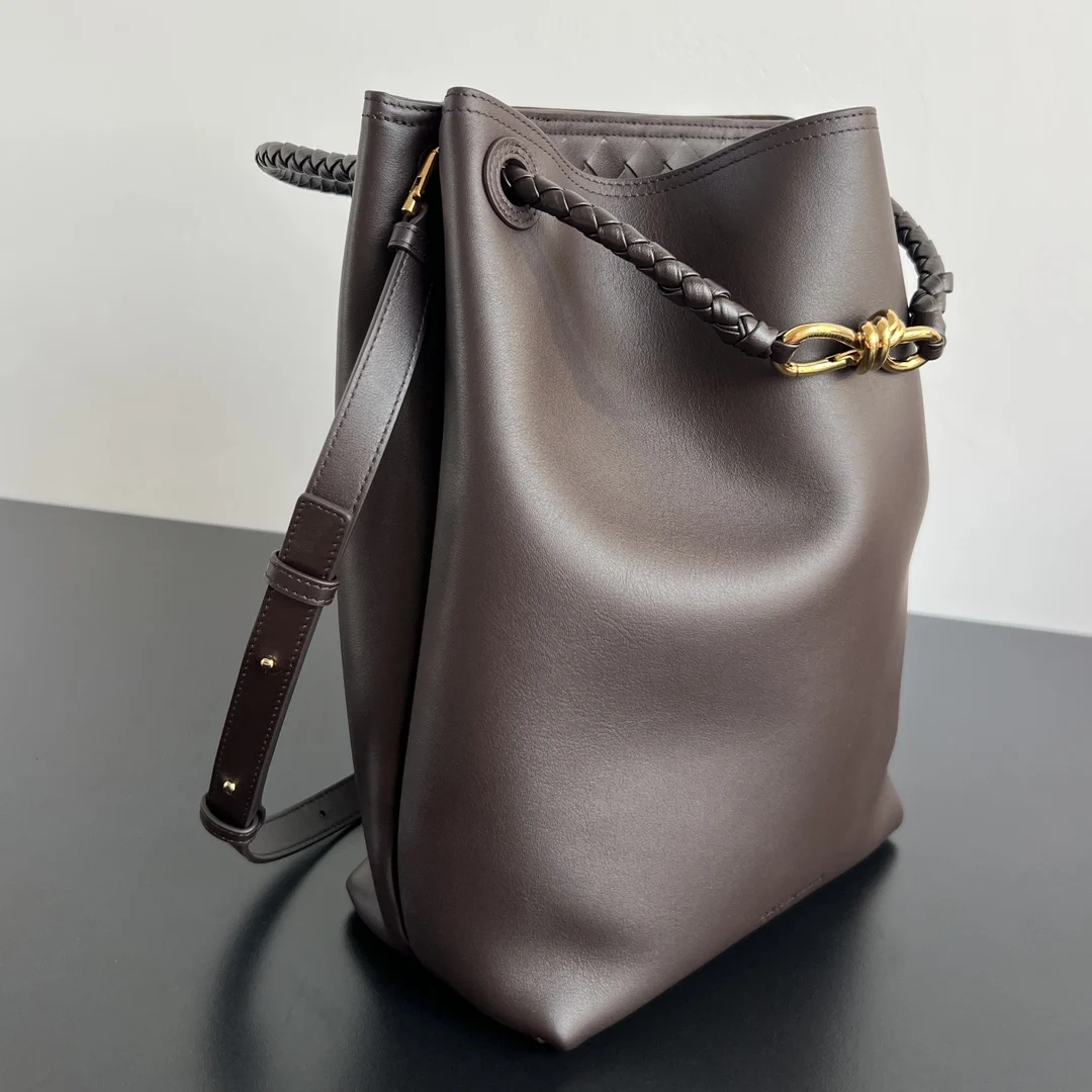 Bottega Veneta s new Andiamo Bucket bag, style 844169, directly appeals to effortless beauty with its brand-new bucket bag design. Crafted from Dutch Silky Calf leather, it boasts a soft and supple texture. It features an adjustable shoulder strap and an intrecciato woven inner pocket, seamlessly blending smooth and woven textures for a layered effect. The shoulder strap is detachable, allowing for versatile styling as a shoulder bag, crossbody bag, or handbag. The bucket shape offers ample storage, accommodating laptops and various essentials. Seemingly simple yet rich in detail, this bag is the type you ll love more and more over time. A quality bag that is both beautiful and spacious, it s a must-have. Dimensions: 34x24x12.