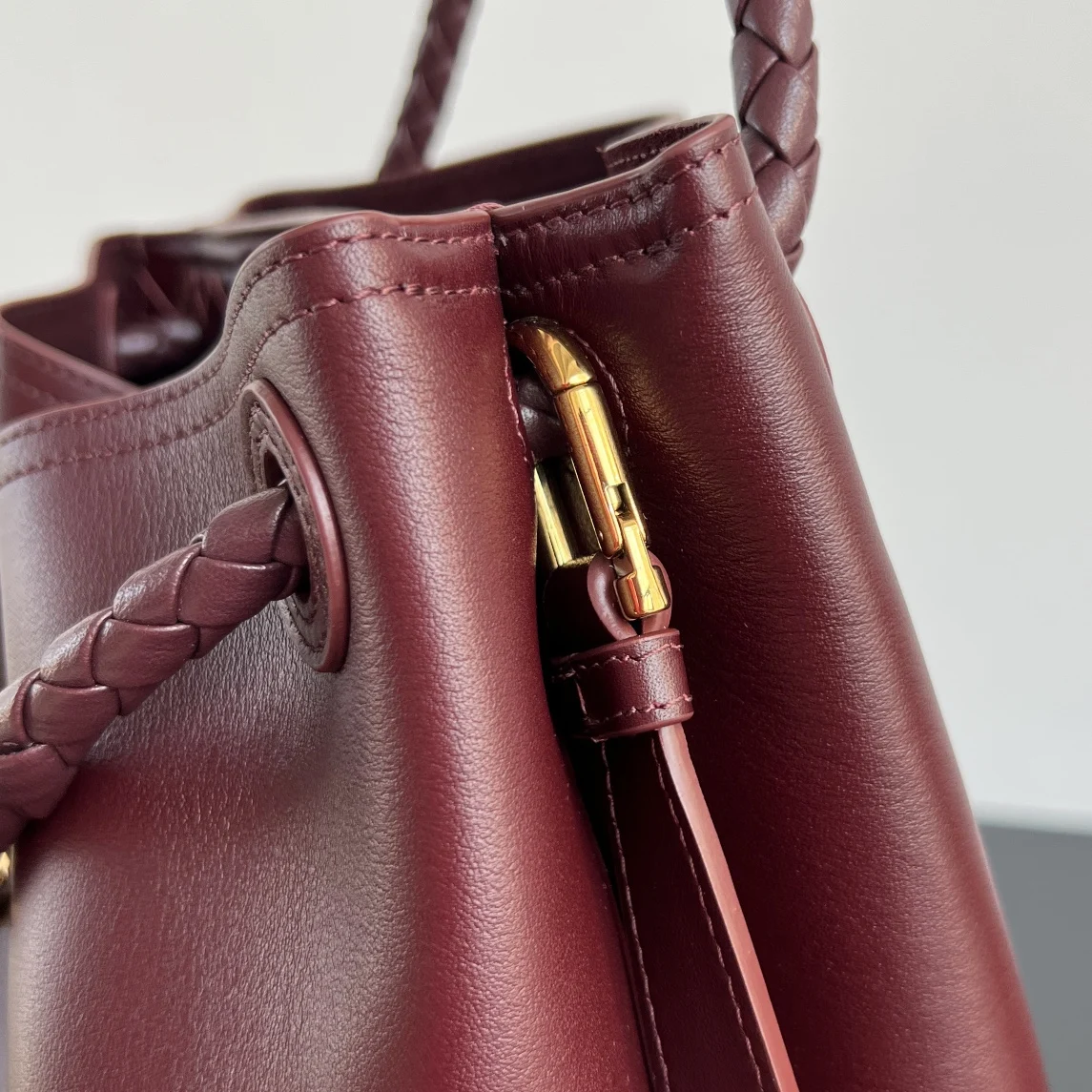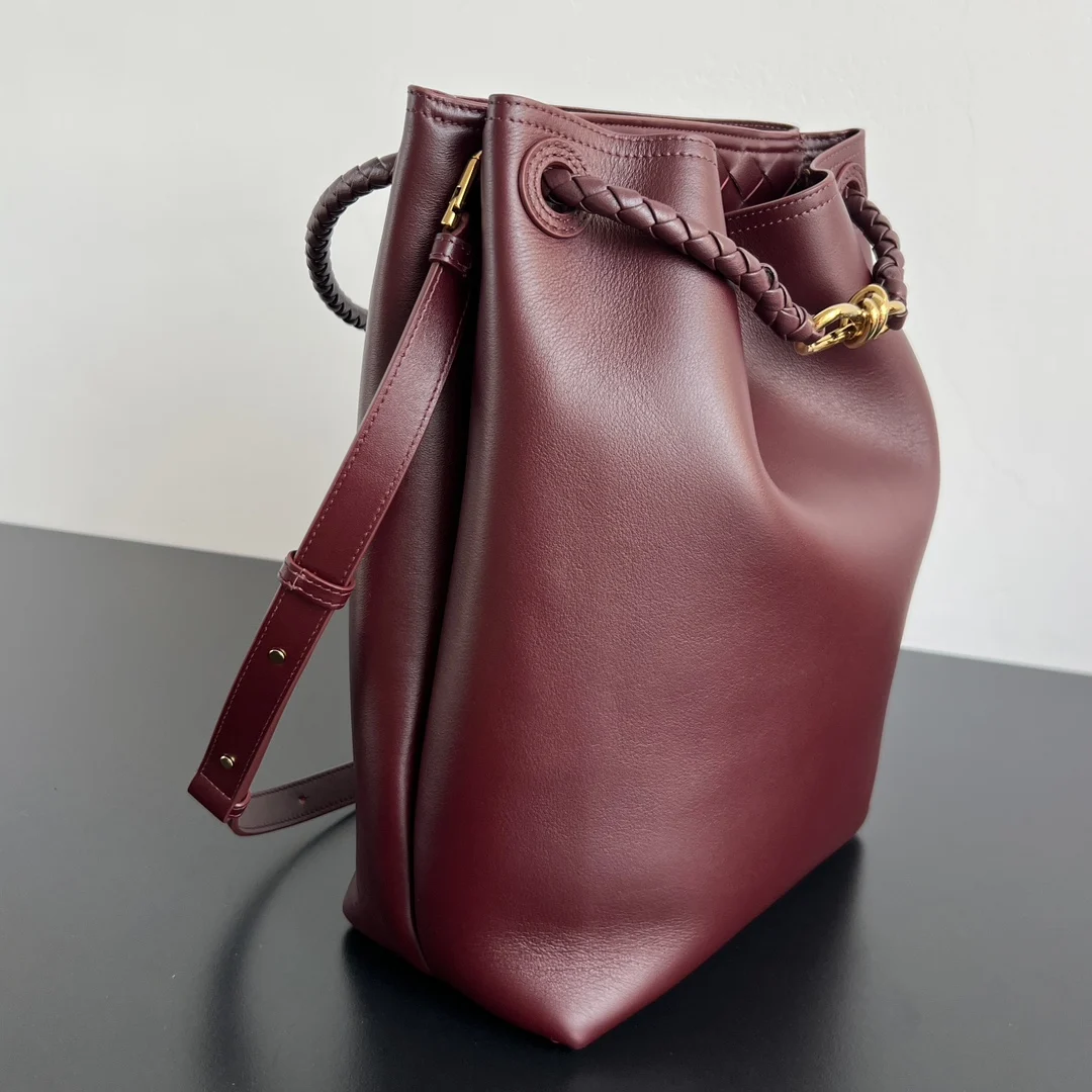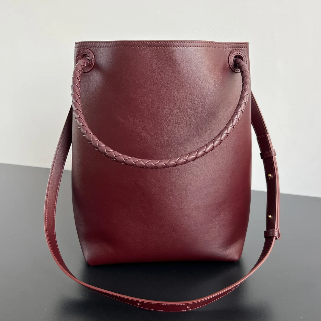 Bottega Veneta s new Andiamo Bucket bag, style 844169, directly embodies effortless beauty with its fresh bucket silhouette. Crafted from Dutch Silky Calf leather, it offers an incredibly soft and supple feel. It features an adjustable shoulder strap and an intrecciato woven inner pocket, seamlessly blending smooth and woven textures for a layered effect. The strap is detachable, allowing for versatile styling as a shoulder bag, crossbody, or handbag. The bucket shape is exceptionally spacious, accommodating laptops and various essentials. Seemingly simple yet rich in detail, this bag is the kind you ll love more and more over time. A quality bag that is both beautiful and practical, it s a must-have. Dimensions: 34x24x12.