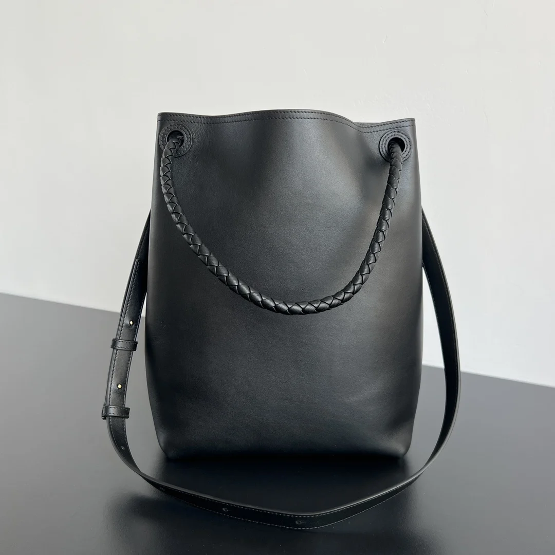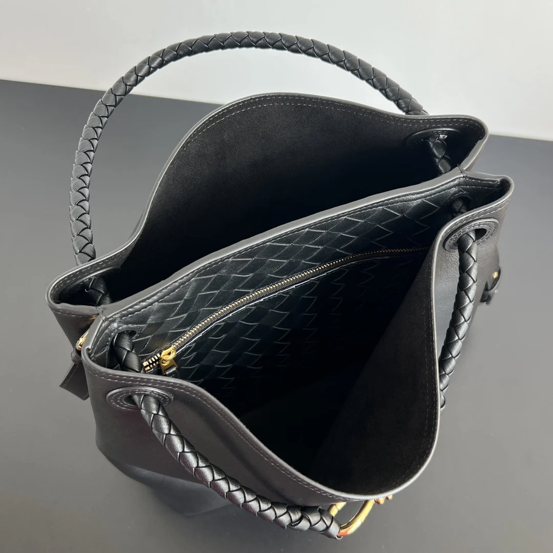 Bottega Veneta s new Andiamo Bucket Bag 844169 features a fresh bucket silhouette that perfectly captures effortless chic. Crafted from Dutch Silky Calf leather, it boasts an incredibly soft and supple feel. The design includes a sliding shoulder strap and an intrecciato woven inner pocket, seamlessly blending smooth and woven textures for a layered effect. The strap is detachable, allowing for versatile styling as a shoulder bag, crossbody, or handbag. The bucket shape offers ample space, easily accommodating a laptop and other essentials. Seemingly simple yet rich in detail, this bag is the kind you ll love more with each use. A high-quality bag that s both stylish and practical a definite must-have. Dimensions: 34x24x12.