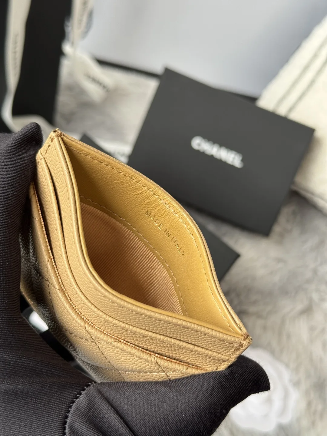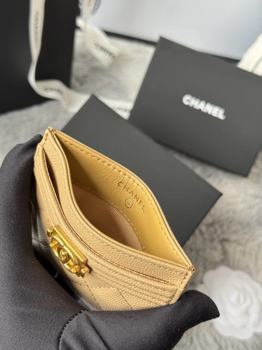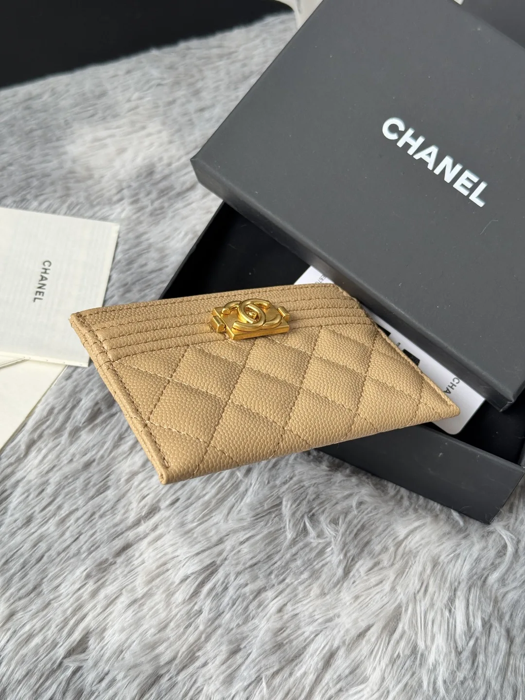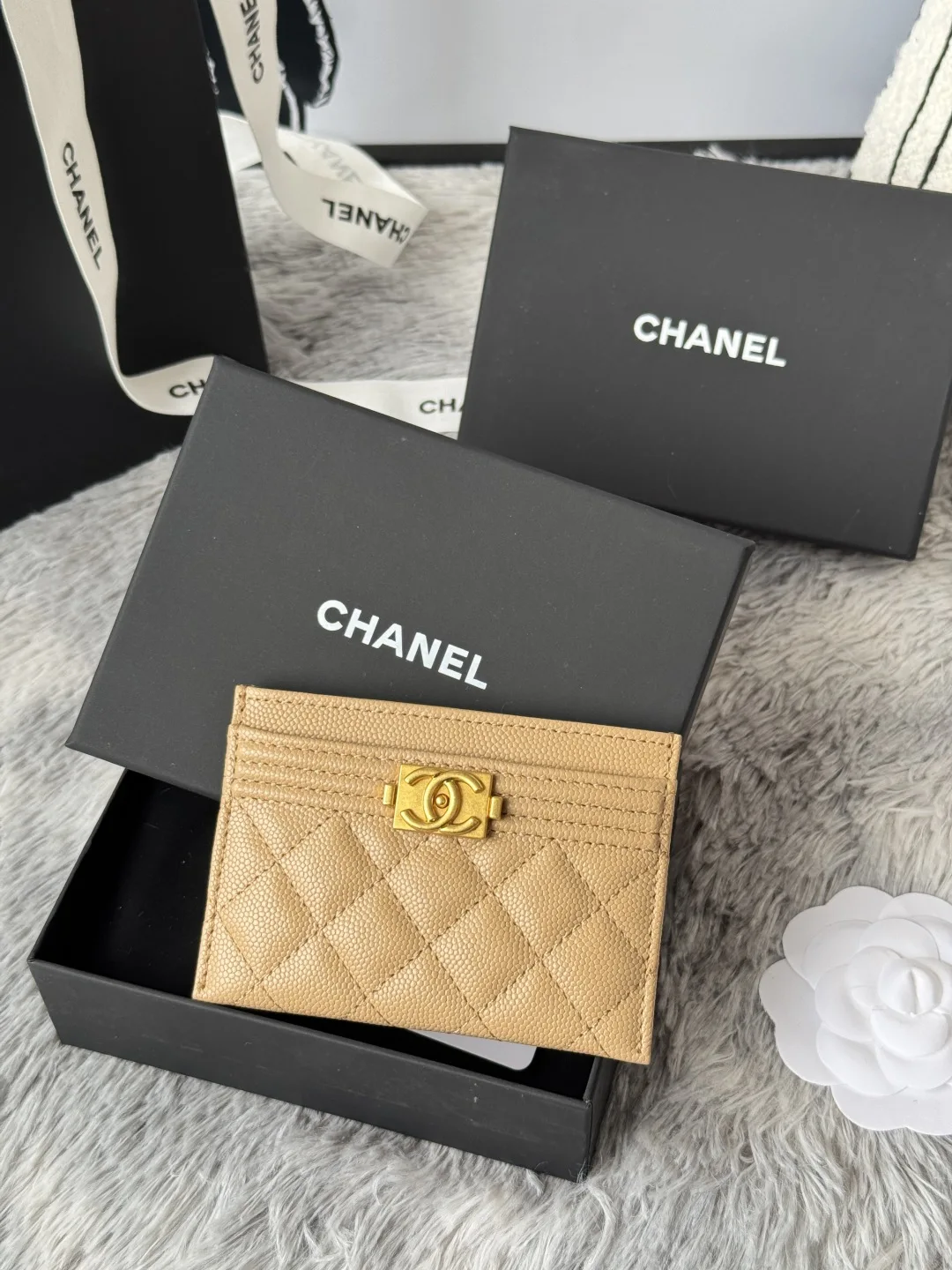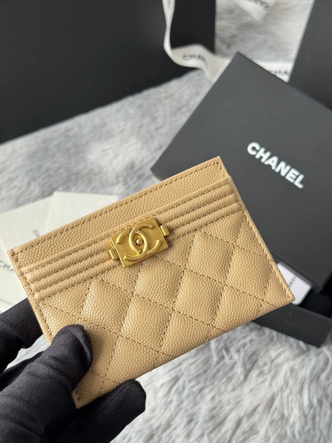 CHANELs new Le Boy card holder has arrived. It features imported diamond quilting that is very durable and aesthetically pleasing. The vintage gold buckle has a distressed finish f..