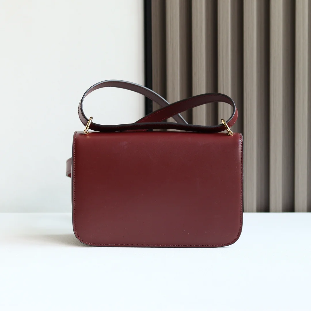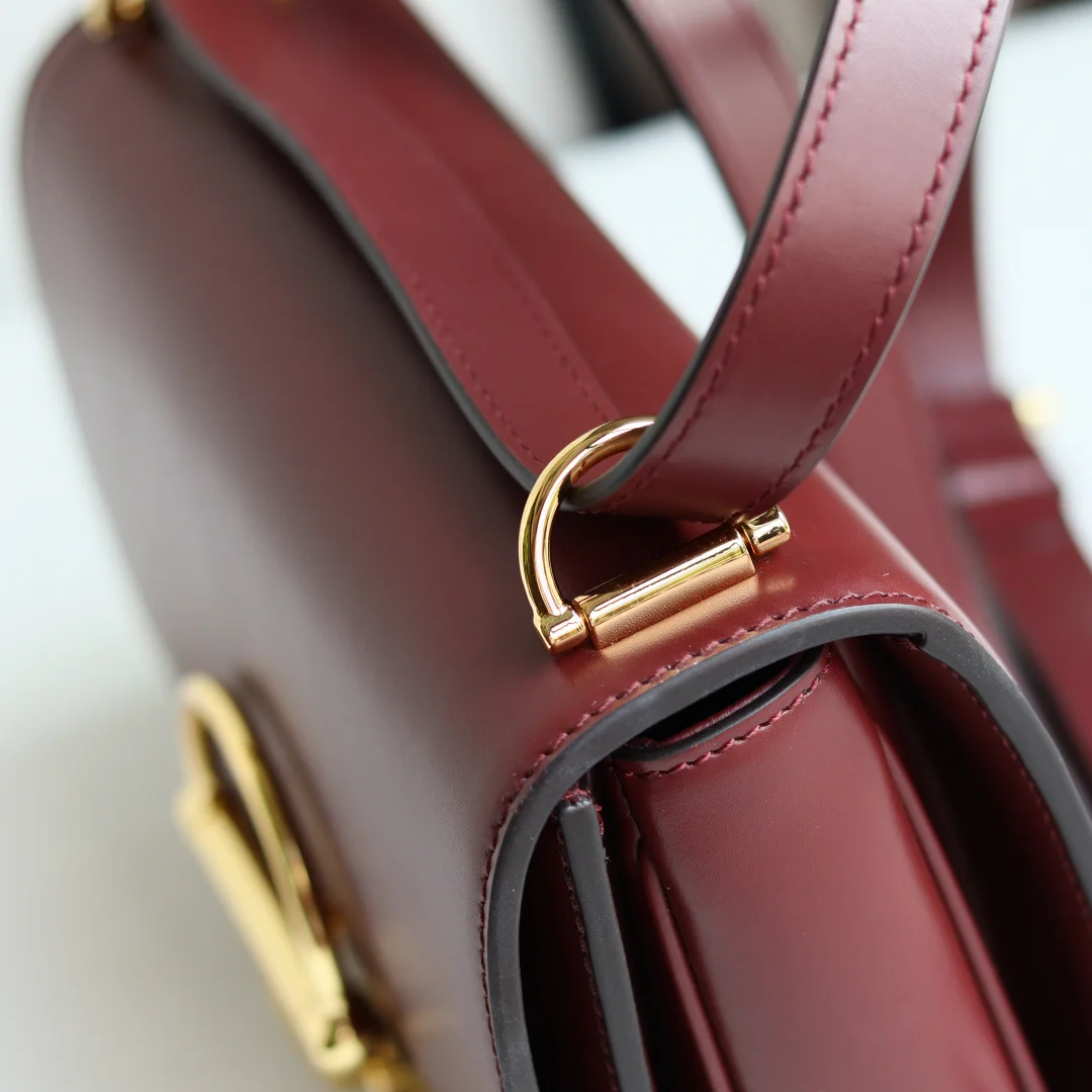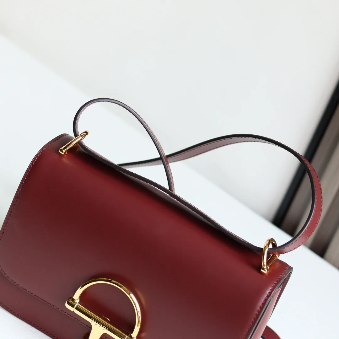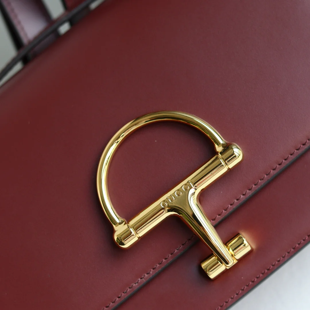 The Gu Siena small shoulder bag continues the evolution of Gucci s iconic Horsebit hardware. Crafted from fine, smooth leather, this shoulder bag features a structured silhouette with a semi-Horsebit clasp design detail inspired by the 1970s, complemented by gold-toned hardware. The interior lining features three compartments and a zipper pocket. Siena Shoulder Bag Model 846705 Ancora Red Size 22.5*14*8