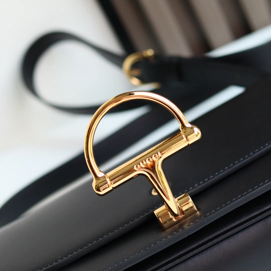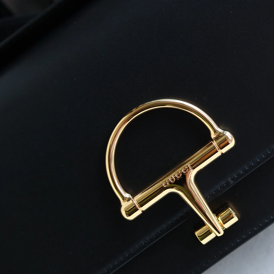 The Gu Siena small shoulder bag continues the evolution of Gucci s iconic Horsebit element. Crafted from fine, smooth leather, this shoulder bag features a structured silhouette incorporating a semi-Horsebit buckle design detail inspired by the 1970s, complemented by gold-toned hardware. The interior lining includes three gussets and a zipper pocket. Siena Shoulder Bag Model 846705 Color: Cream Dimensions: 22.5*14*8