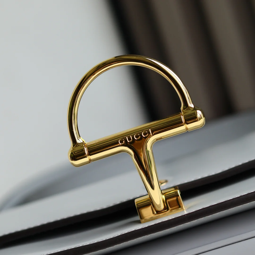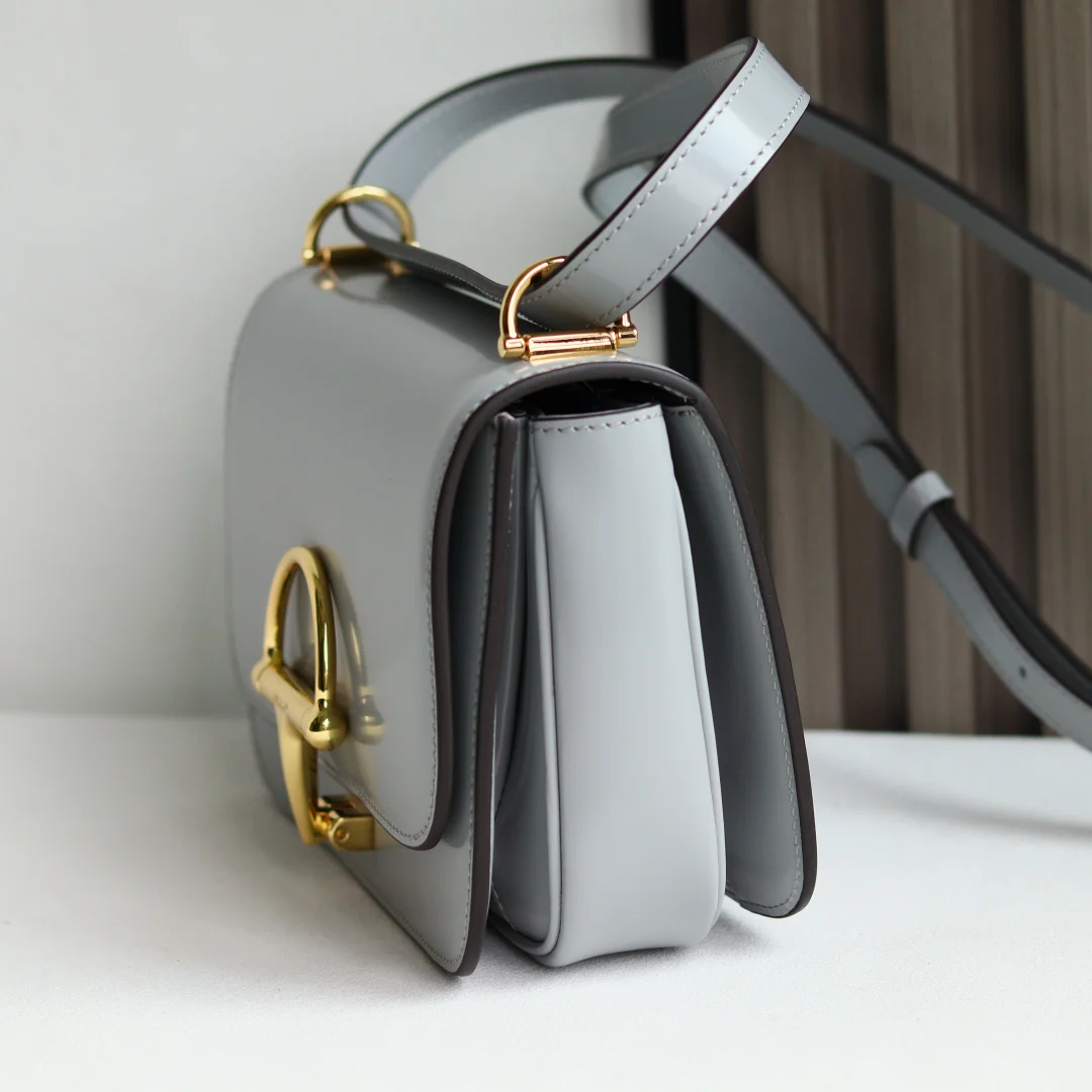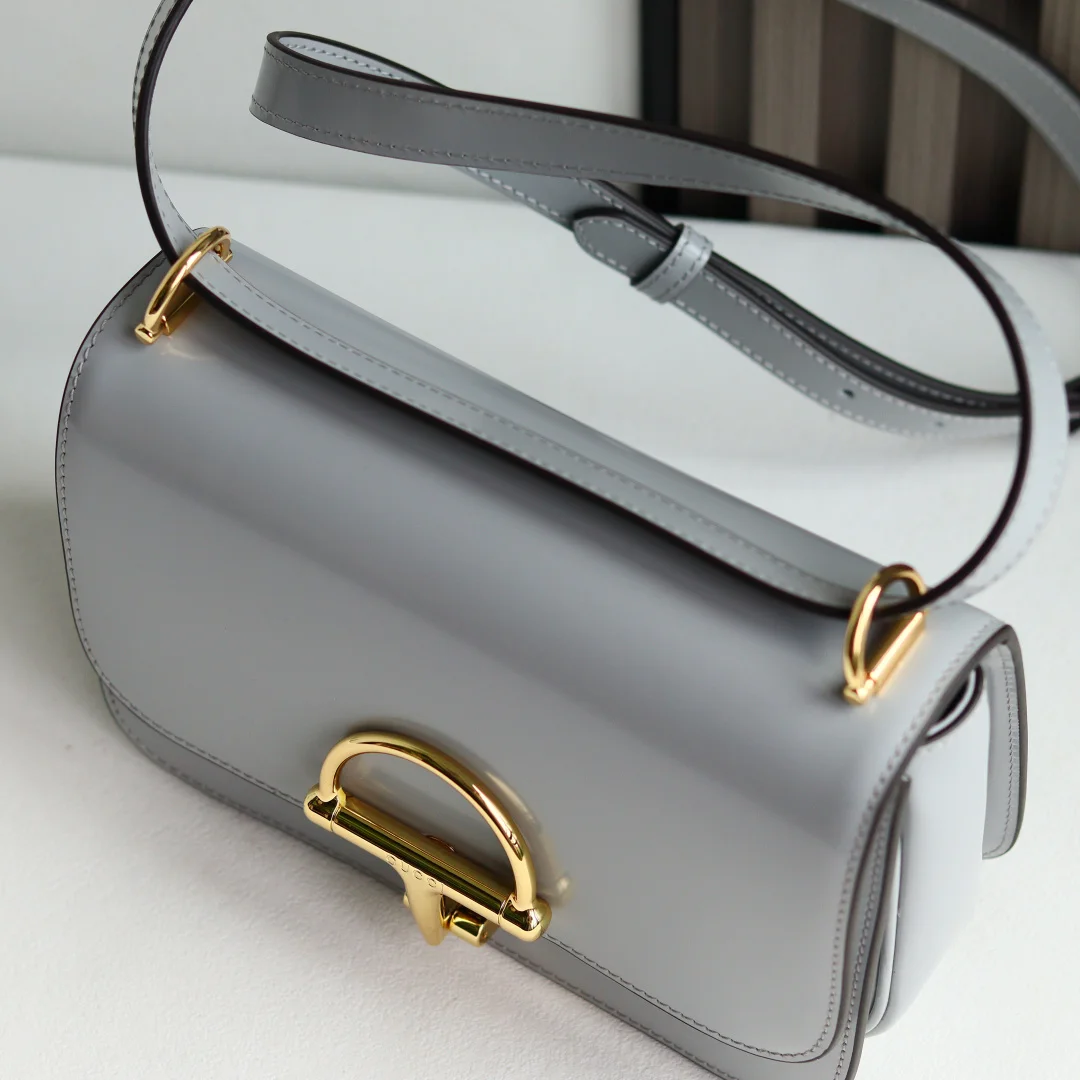 The Gu Siena small shoulder bag continues the evolution of Gucci s iconic Horsebit hardware. Crafted from fine, smooth leather, this shoulder bag features a structured silhouette with a semi-Horsebit clasp design detail inspired by the 1970s, complemented by gold-toned hardware. The interior lining features three compartments and a zipper pocket. Siena Shoulder Bag Model 846705 Grey Size 22.5*14*8