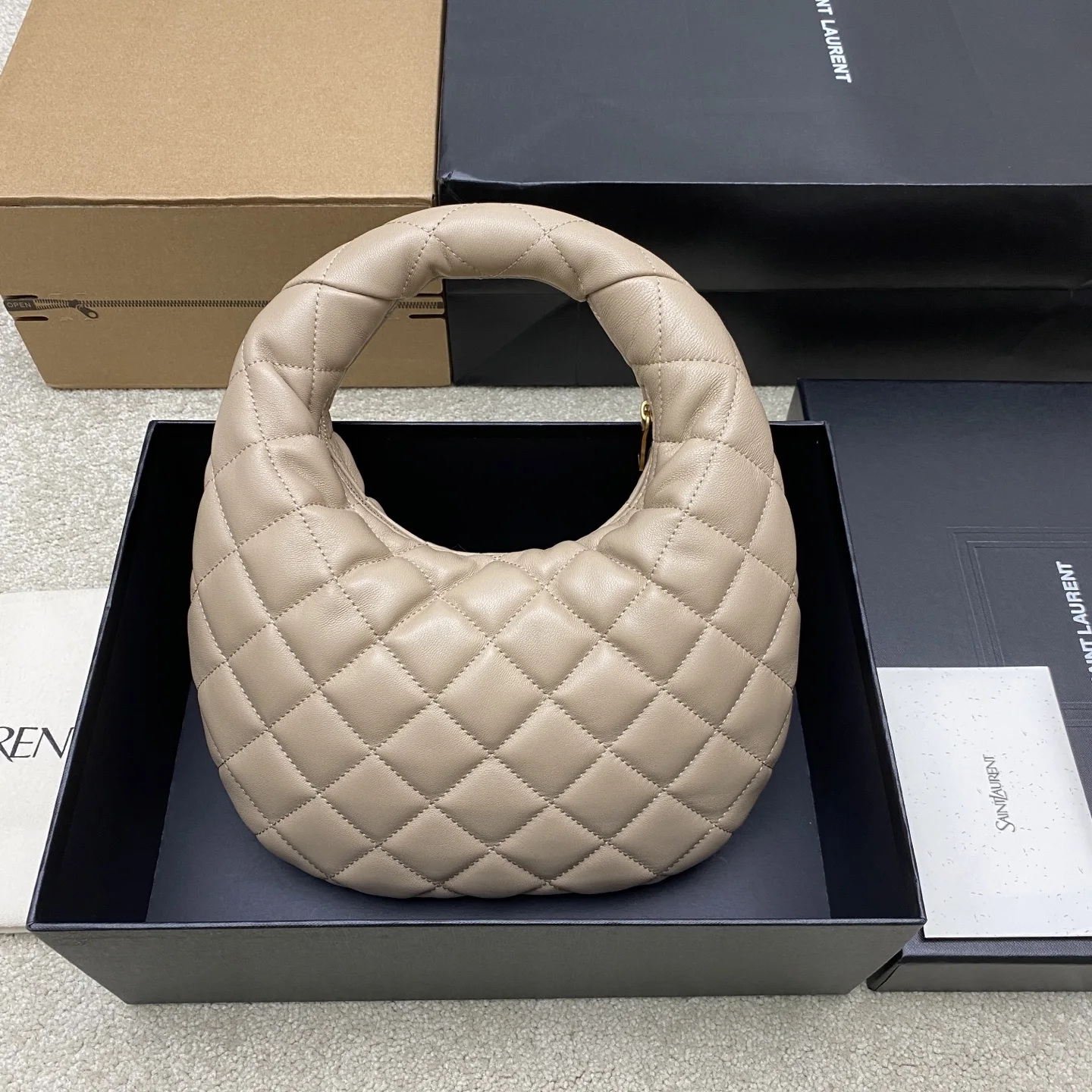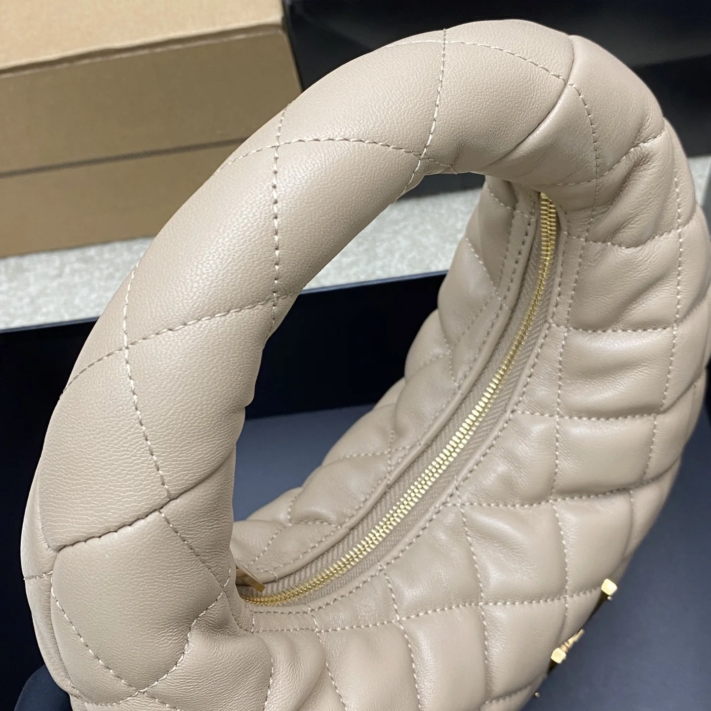 Apricot Sheepskin Gold ICARE Baby Nappa Leather Handbag. The highly anticipated croissant-shaped bag makes a dazzling debut, adorned with the iconic metal logo, perfectly blending vintage and modern sensibilities, making it one of the most anticipated It Bags of the season. Whether for daily outings or evening parties, this bag can be easily styled!
