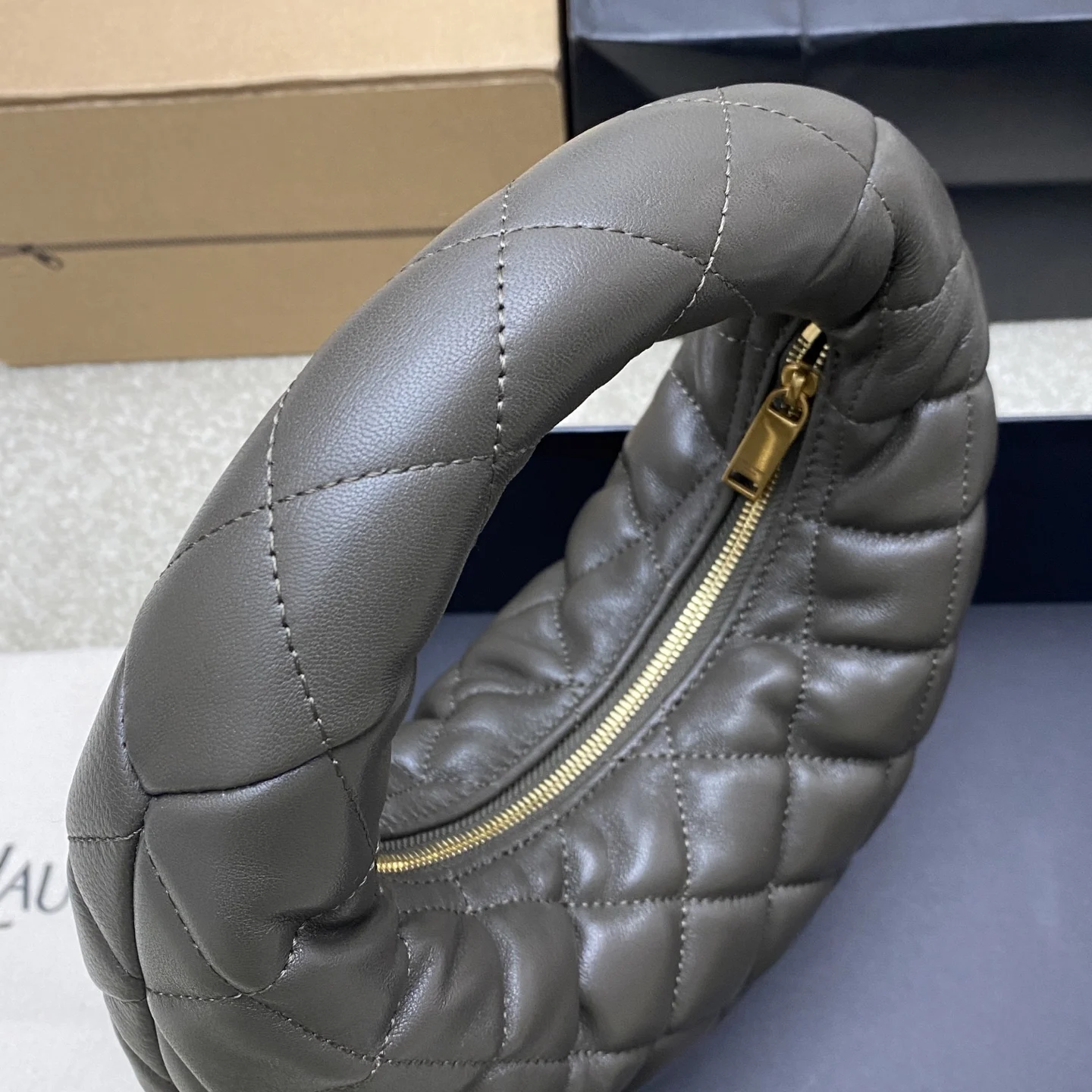 Musk green lambskin Gold ICARE baby nappa lambskin handbag. The highly anticipated croissant-shaped bag makes a dazzling debut, adorned with the iconic metal logo, perfectly blending vintage and modern sensibilities, making it one of the most anticipated It Bags of the season. Whether for daily outings or evening parties, this bag can be easily styled!