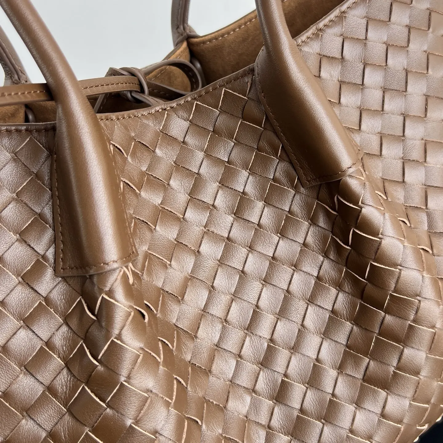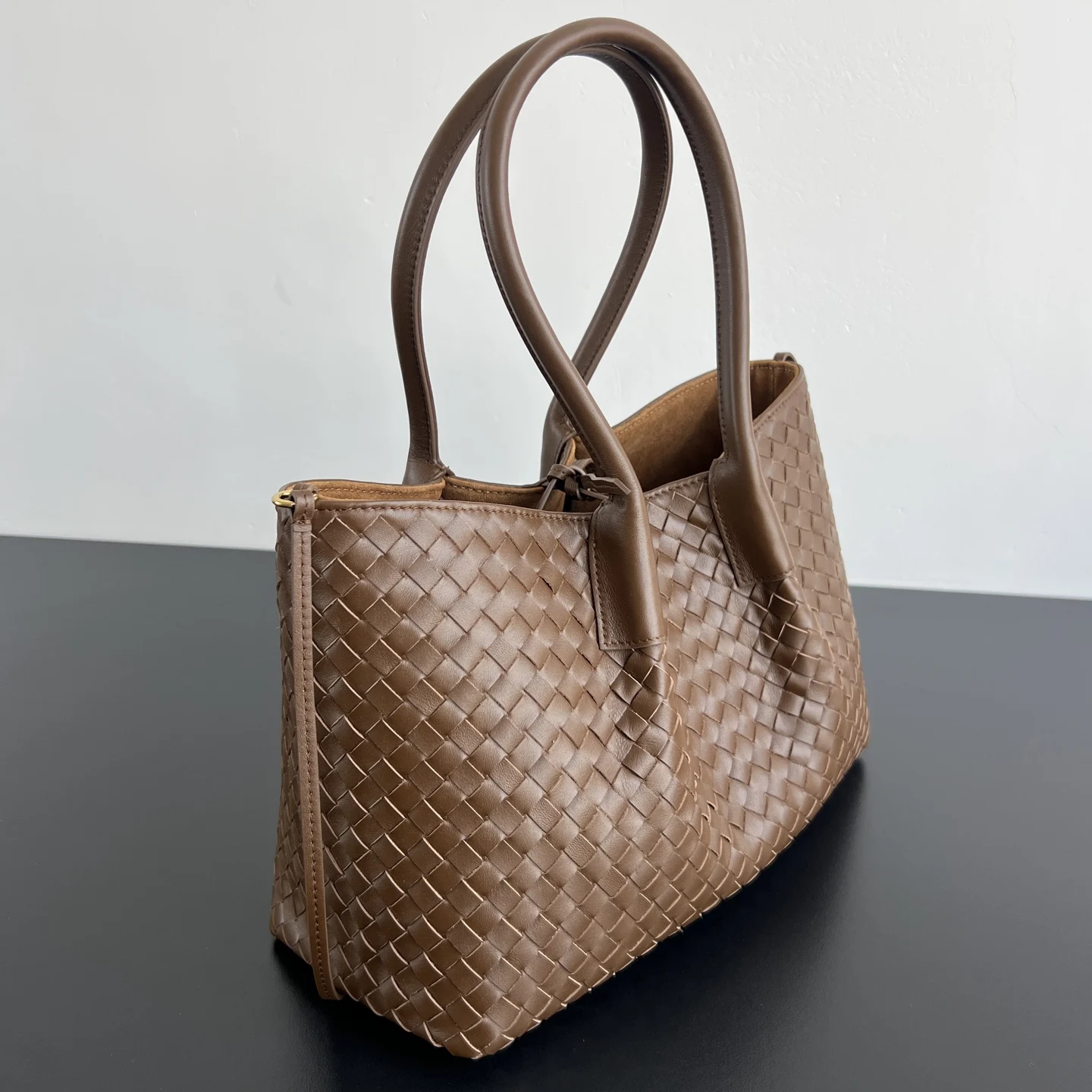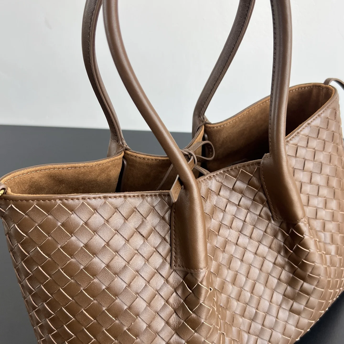 BV 2025 Early Spring New Arrival 854371 Pinacoteca Medium Tote Bag features BV s iconic woven craftsmanship. It has a reversible, smooth deerskin lining for dual-sided use, combini..