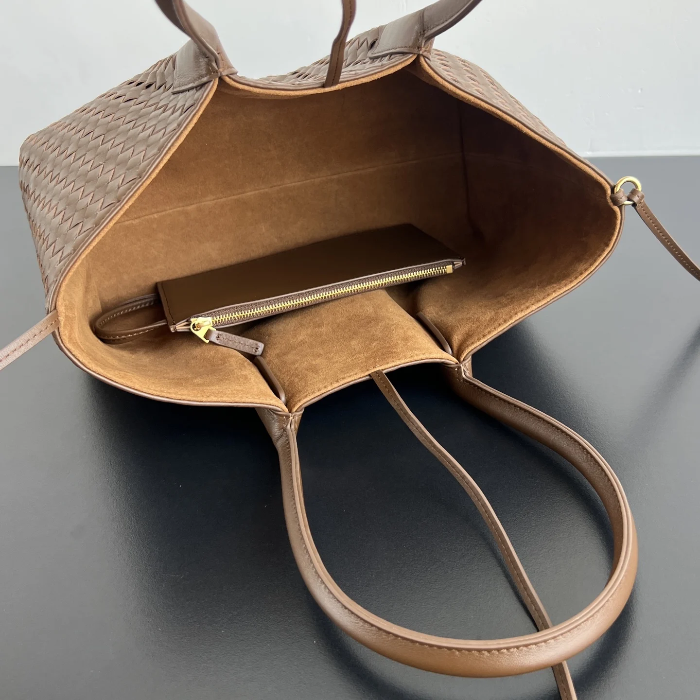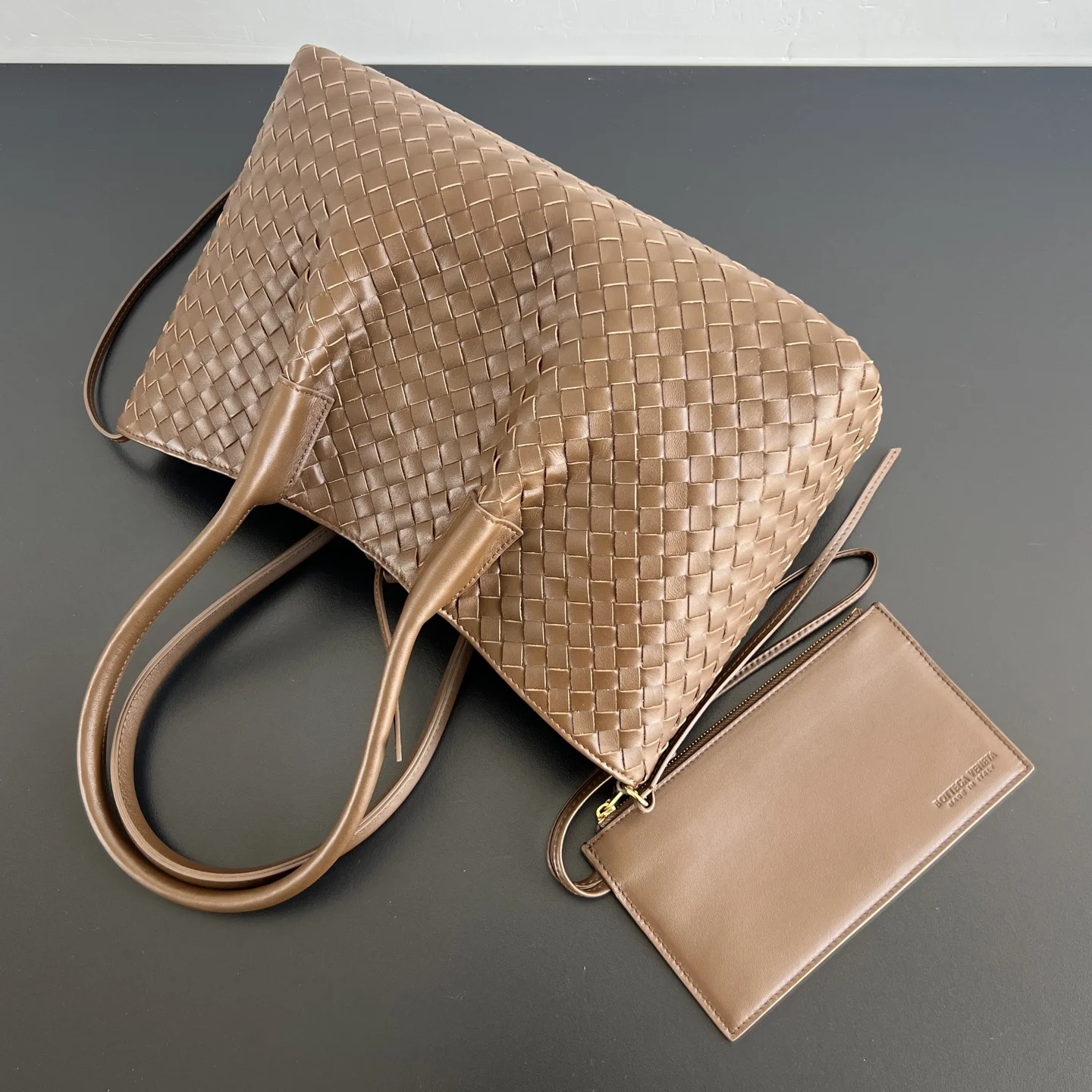BV 2025 Early Spring New Arrival 854371 Pinacoteca Medium Tote Bag features BV s iconic woven craftsmanship. It has a reversible, smooth deerskin lining for dual-sided use, combining fashion and practicality. The four leather straps on the bag also embody unique personality elements, exquisite and creative. With a minimalist silhouette and light tones, it has an understated and sophisticated appearance, suitable for both shoulder and hand carry! Size: 34*20*14cm