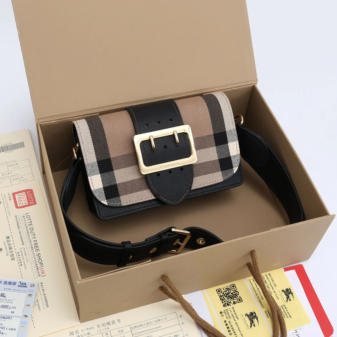 The Buckle, presented in a mini size, is crafted from metallic leather and House check cotton panels, with exquisite hand-stitched detailing. This small-sized piece is perfect for everyday use, accommodating coins, cards, phones, and makeup. It comes with a detachable strap for use as a shoulder bag or clutch. Double straps. Style number: 89013. Dimensions: 19.5 - 5 - 12cm. 85482020