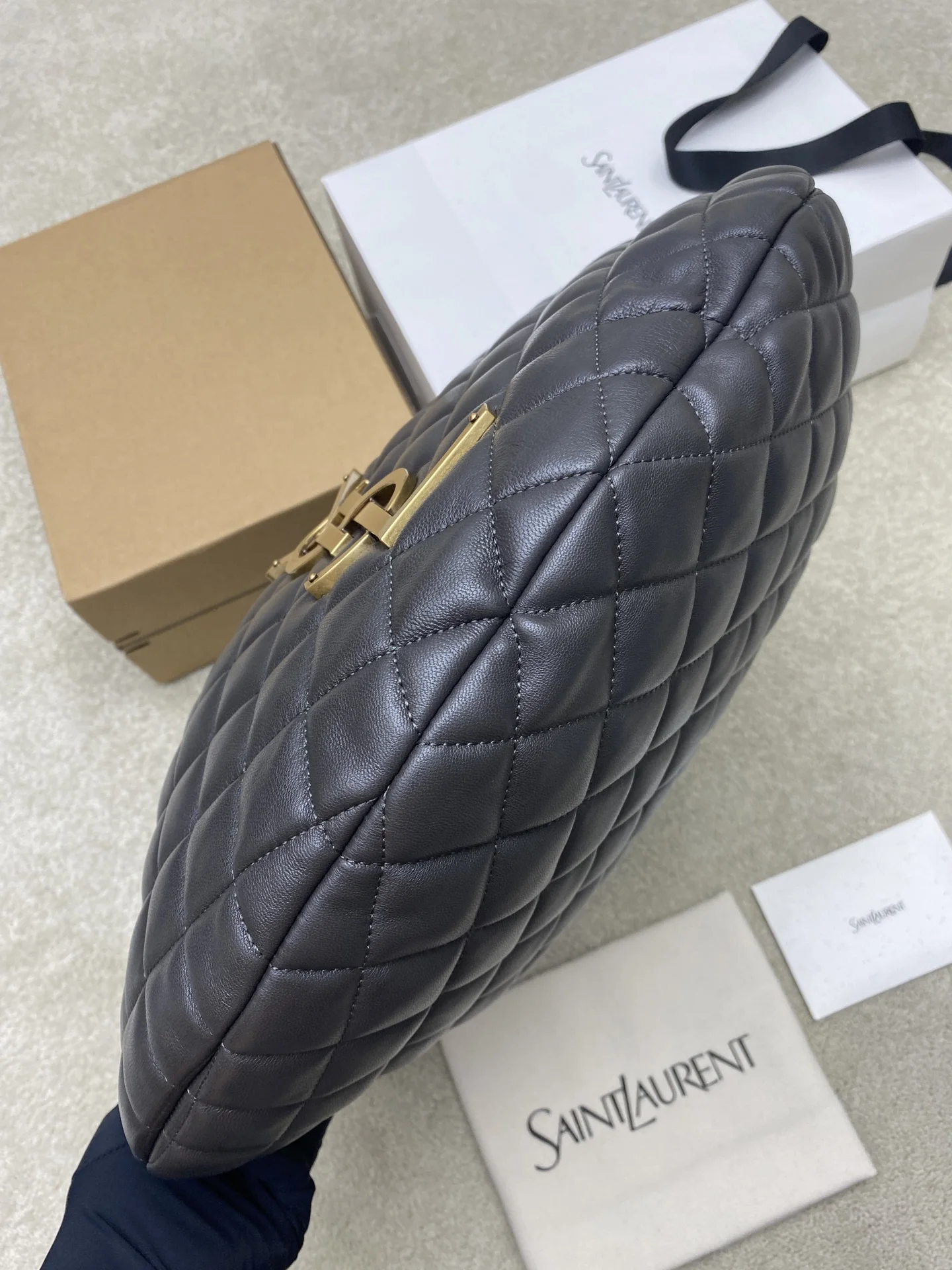 Urban grey lambskin, new gold ICARE baby nappa lambskin handbag. The highly anticipated croissant-shaped bag makes a dazzling debut, adorned with the iconic metal logo, perfectly blending vintage and modern sensibilities, making it one of the most anticipated It Bags of the season. Whether for daily outings or evening parties, this bag can be easily styled!