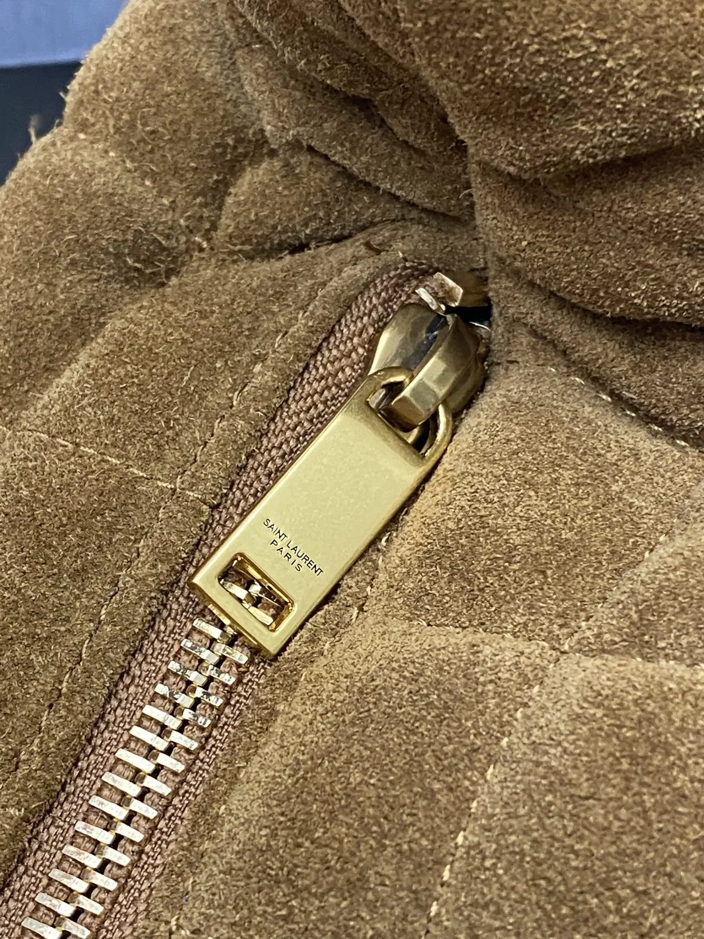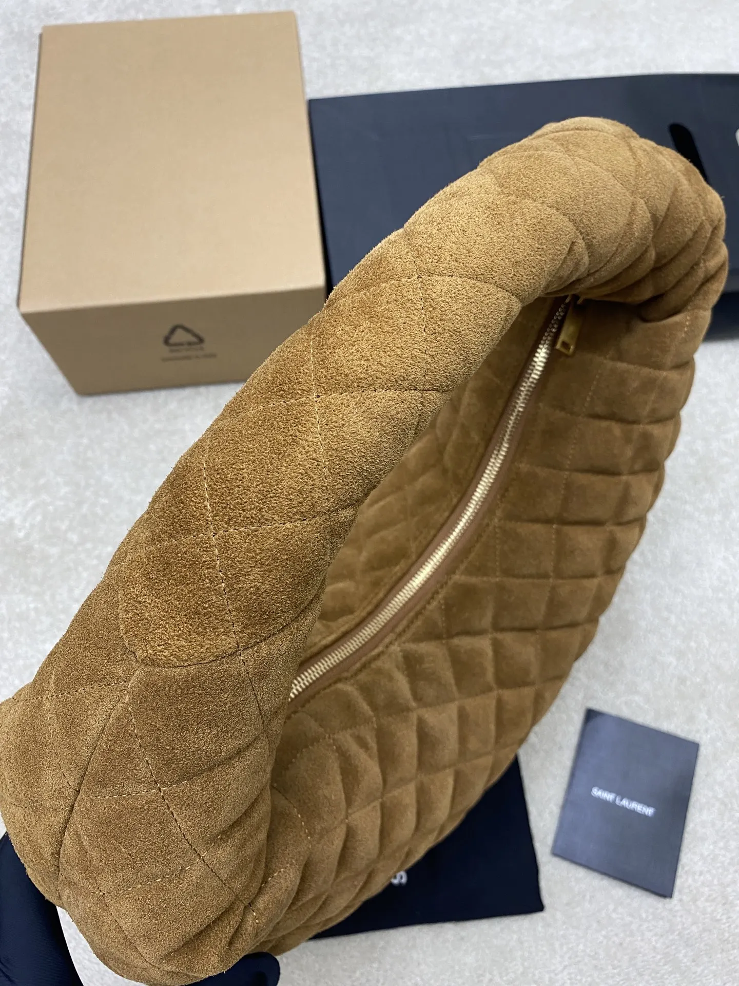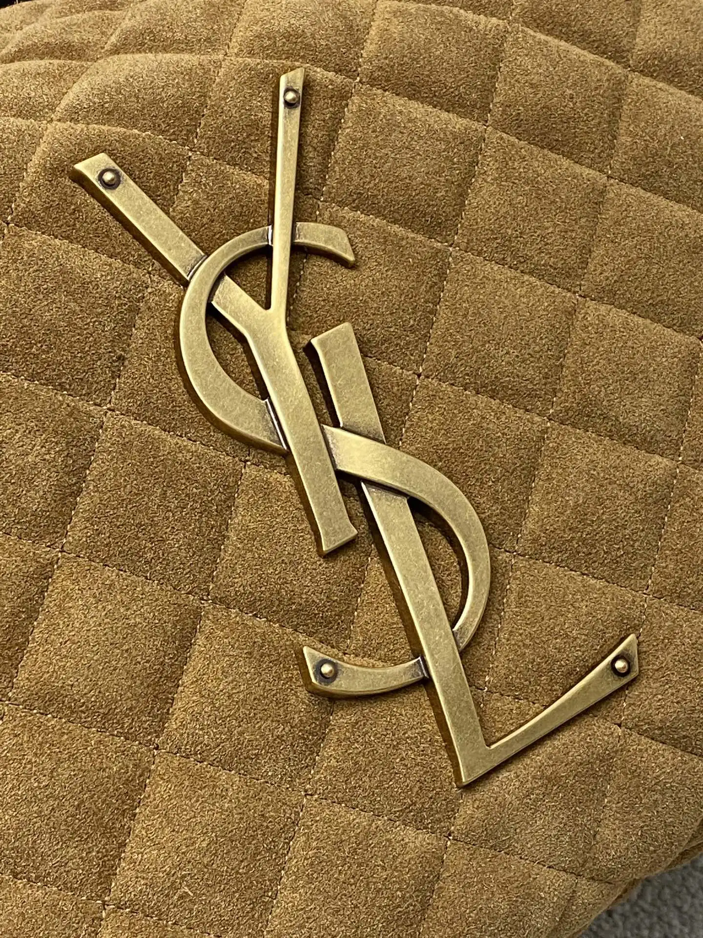 Brown brushed gold new ICARE baby nappa suede handbag. The highly anticipated croissant-shaped bag makes a dazzling debut, adorned with the iconic metal logo, perfectly combining vintage and modern sensibilities, making it one of the most anticipated It Bags of the season. Whether for daily outings or evening parties, this bag can be easily styled!