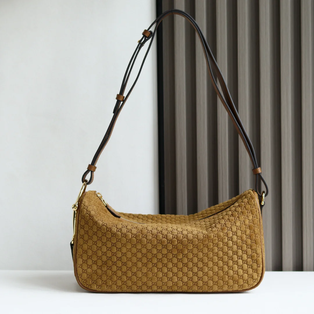 The Half Horsebit large shoulder bag is reimagined with a modern twist, breathing new life into one of the brand s most iconic elements. This collection cleverly blends a casual silhouette with the signature Half Horsebit hardware, from which it derives its name. Interior: one open pocket, adjustable leather shoulder strap, style number 860787 Brown embossed G, dimensions: W31.5 x H17 x D12 cm.